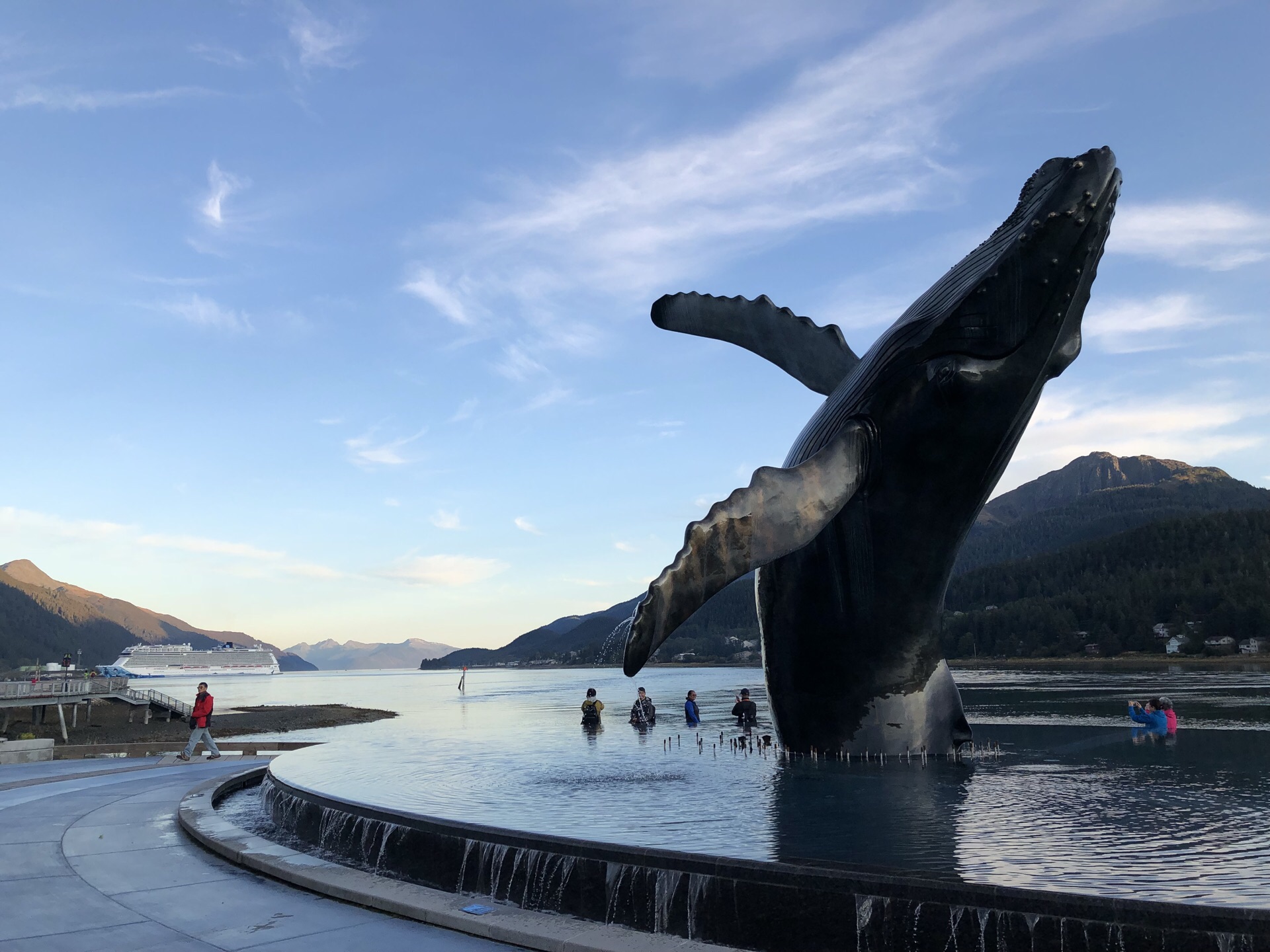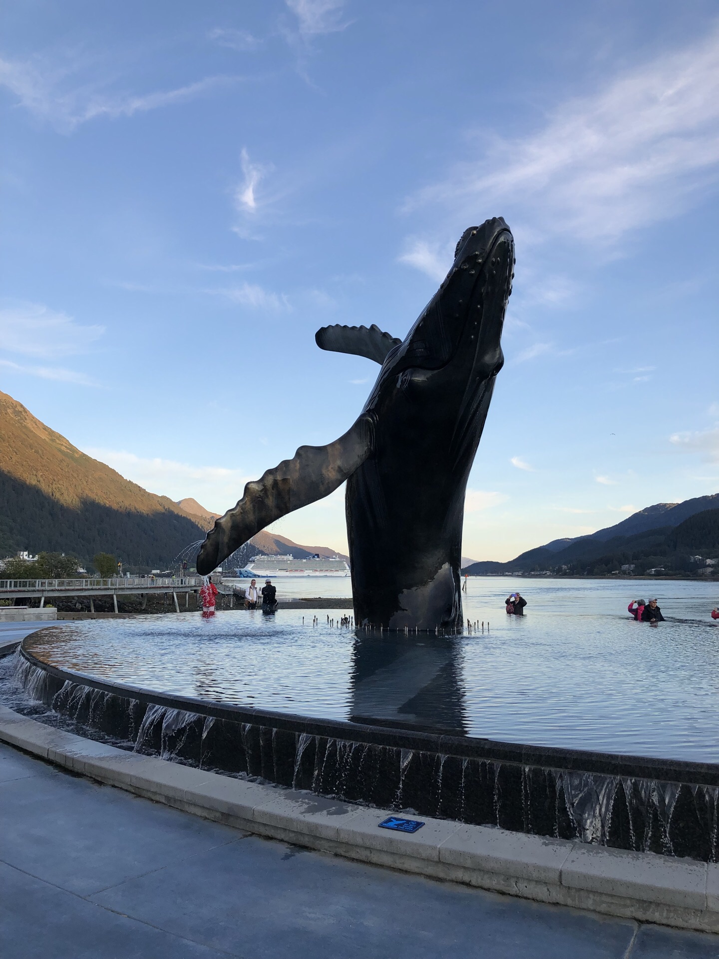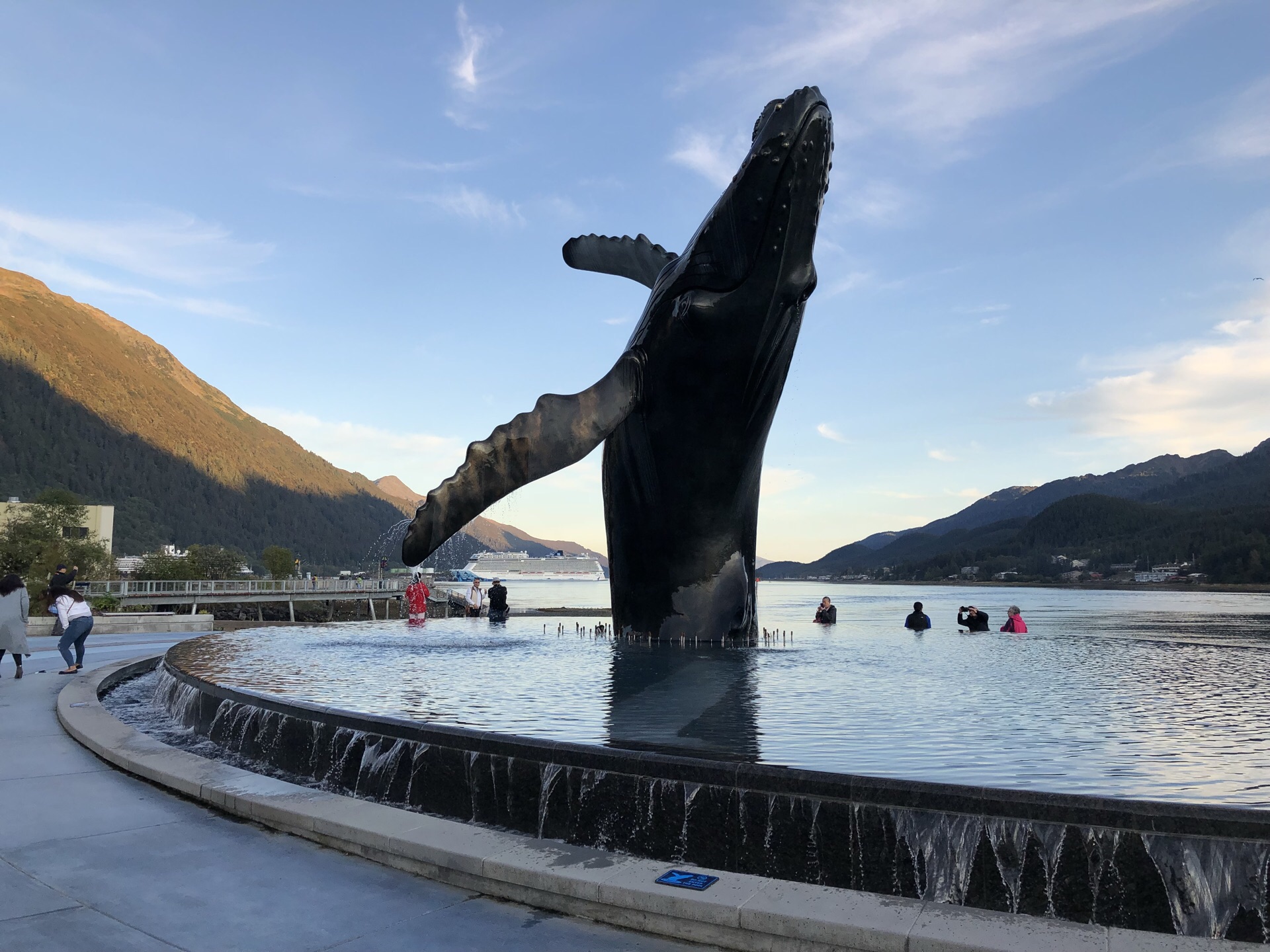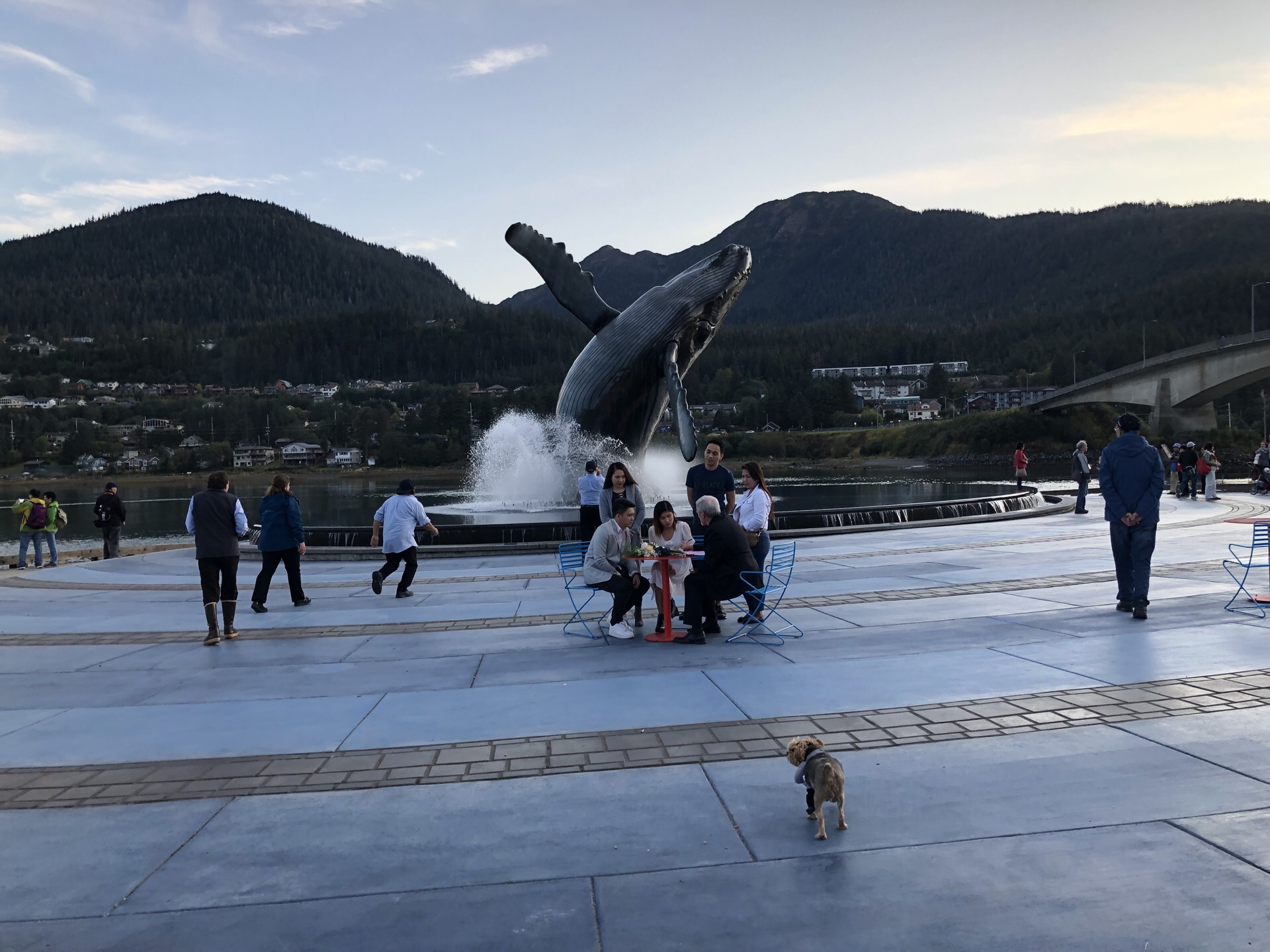 这里有一座雕塑,是一条跃出水面的大鲸鱼,鲸鱼周边会间断喷水,营造鲸鱼跃出水面的真实感。因为离朱诺的街道比较远,所以游人不多,景观还是不错的。附近就是道格拉斯桥。在这里遇到一位女士带着两条小狗,其中一条好可爱,不少人都给它拍照啊。