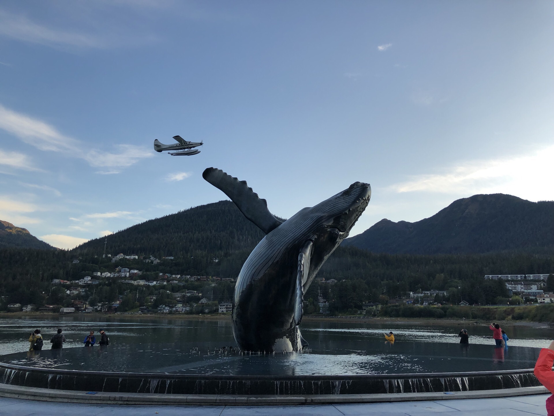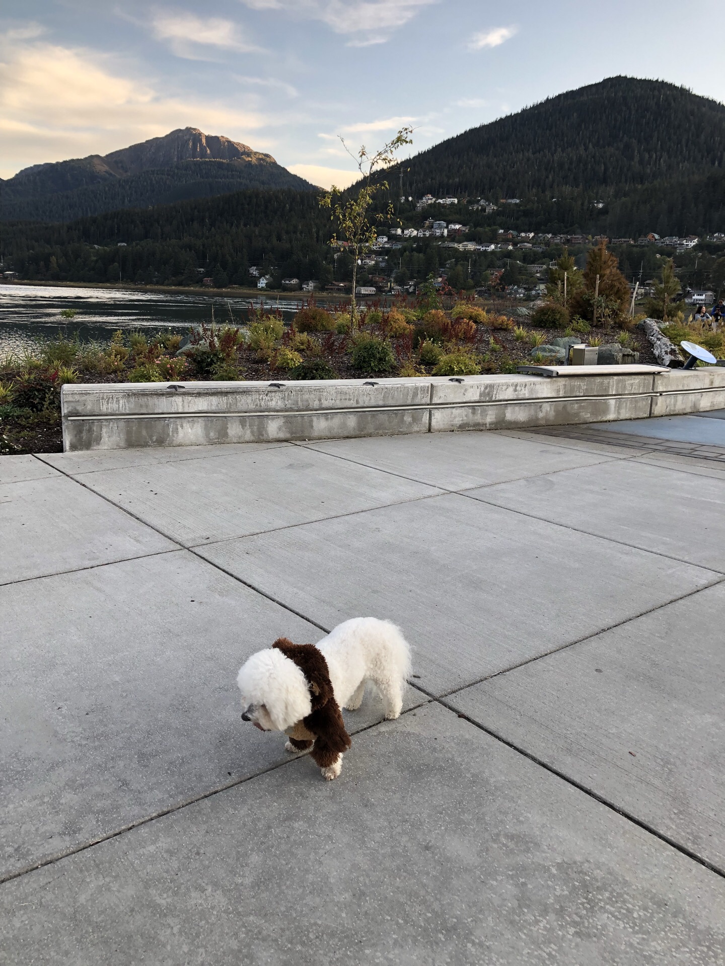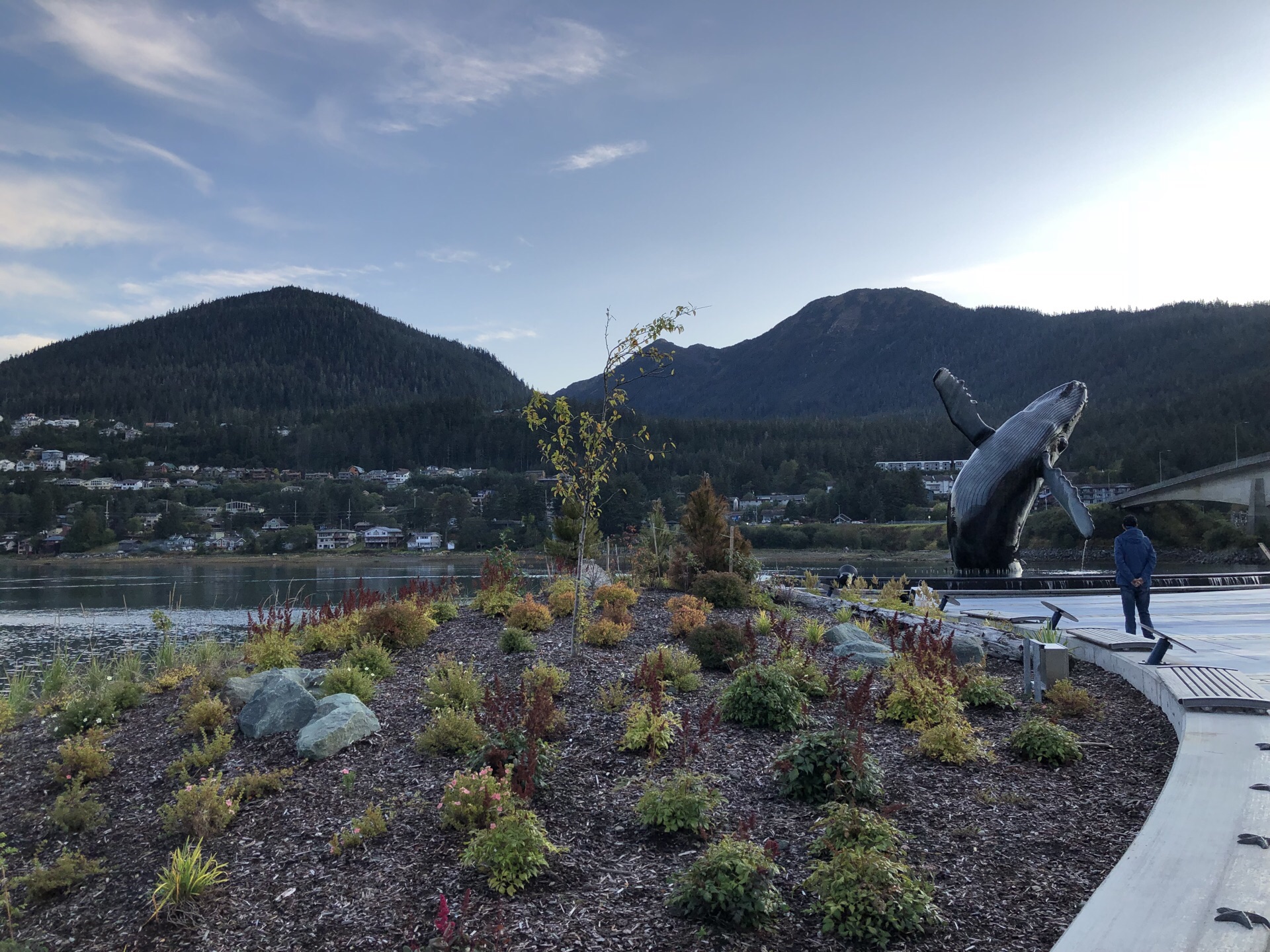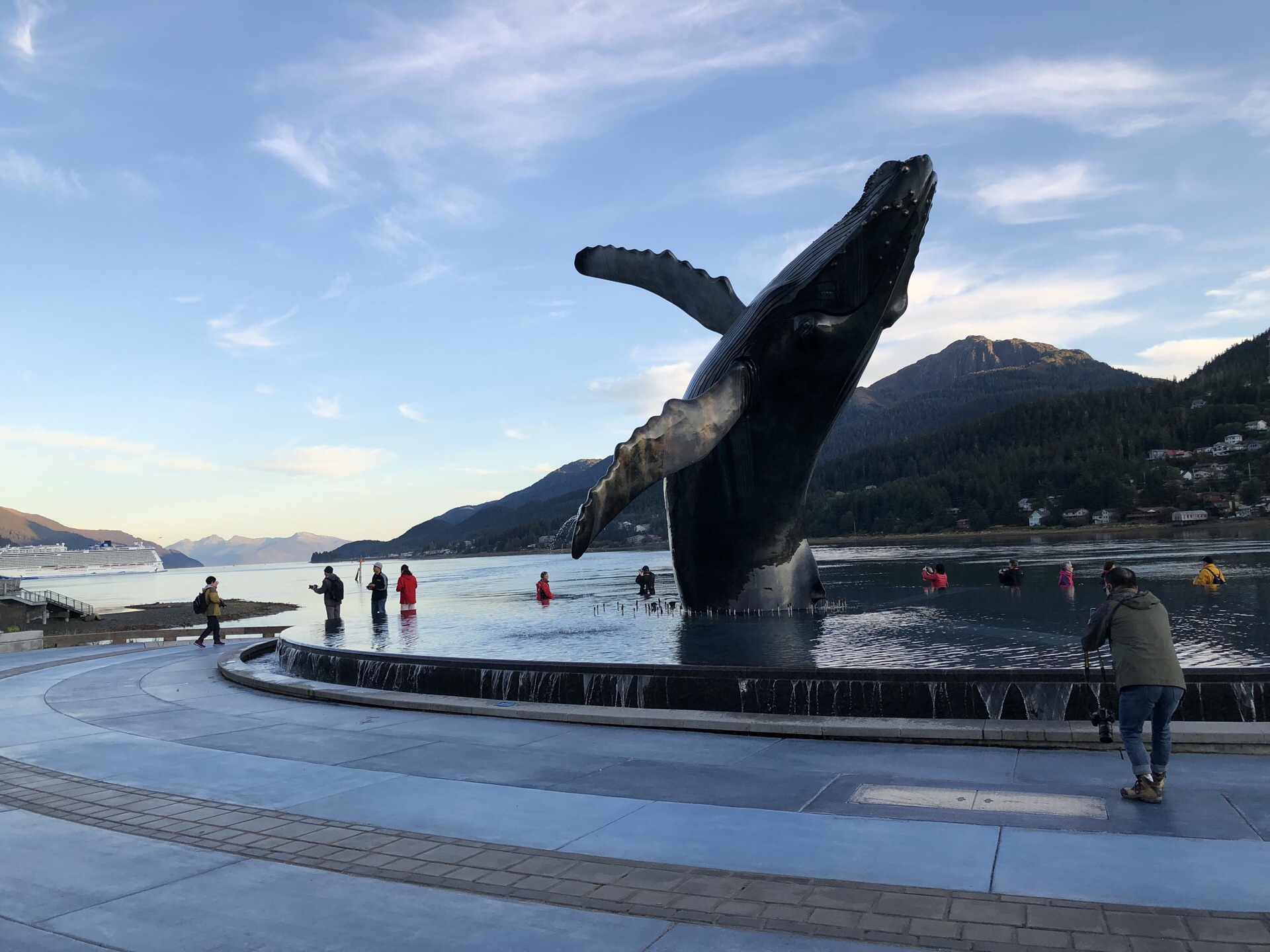 这里有一座雕塑,是一条跃出水面的大鲸鱼,鲸鱼周边会间断喷水,营造鲸鱼跃出水面的真实感。因为离朱诺的街道比较远,所以游人不多,景观还是不错的。附近就是道格拉斯桥。在这里遇到一位女士带着两条小狗,其中一条好可爱,不少人都给它拍照啊。