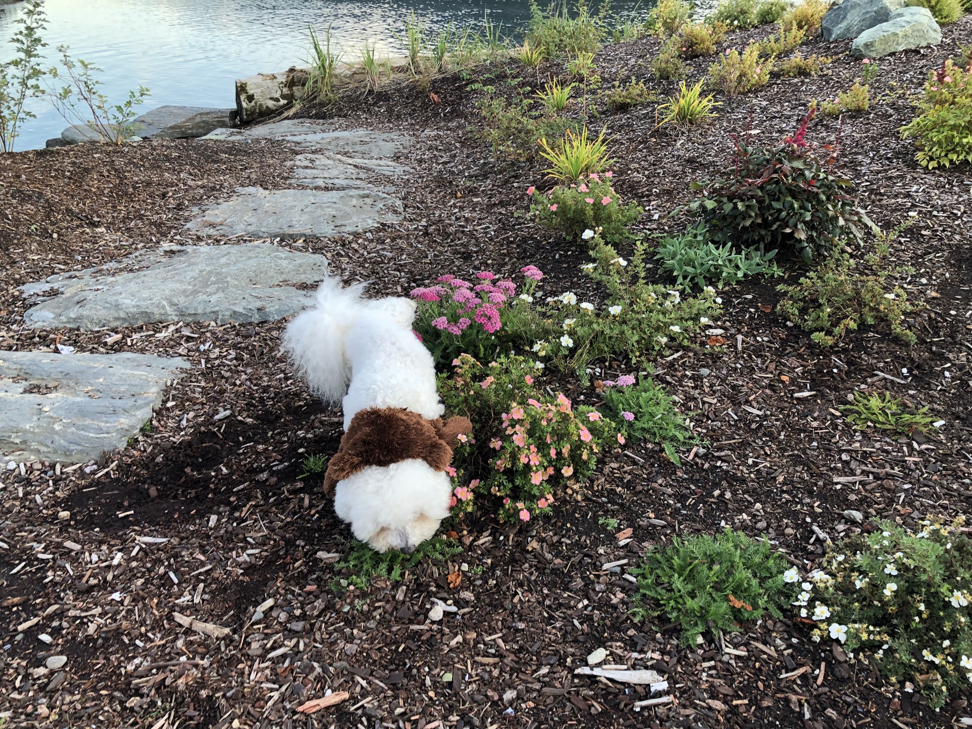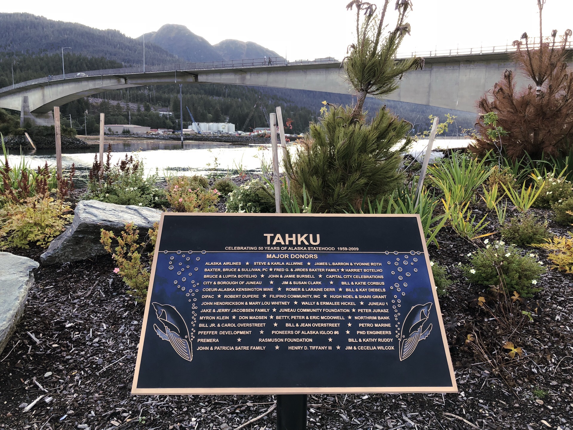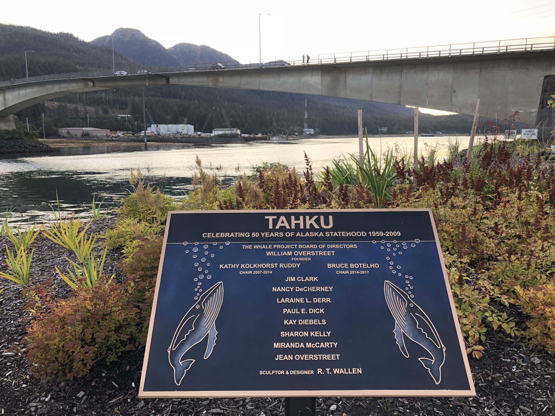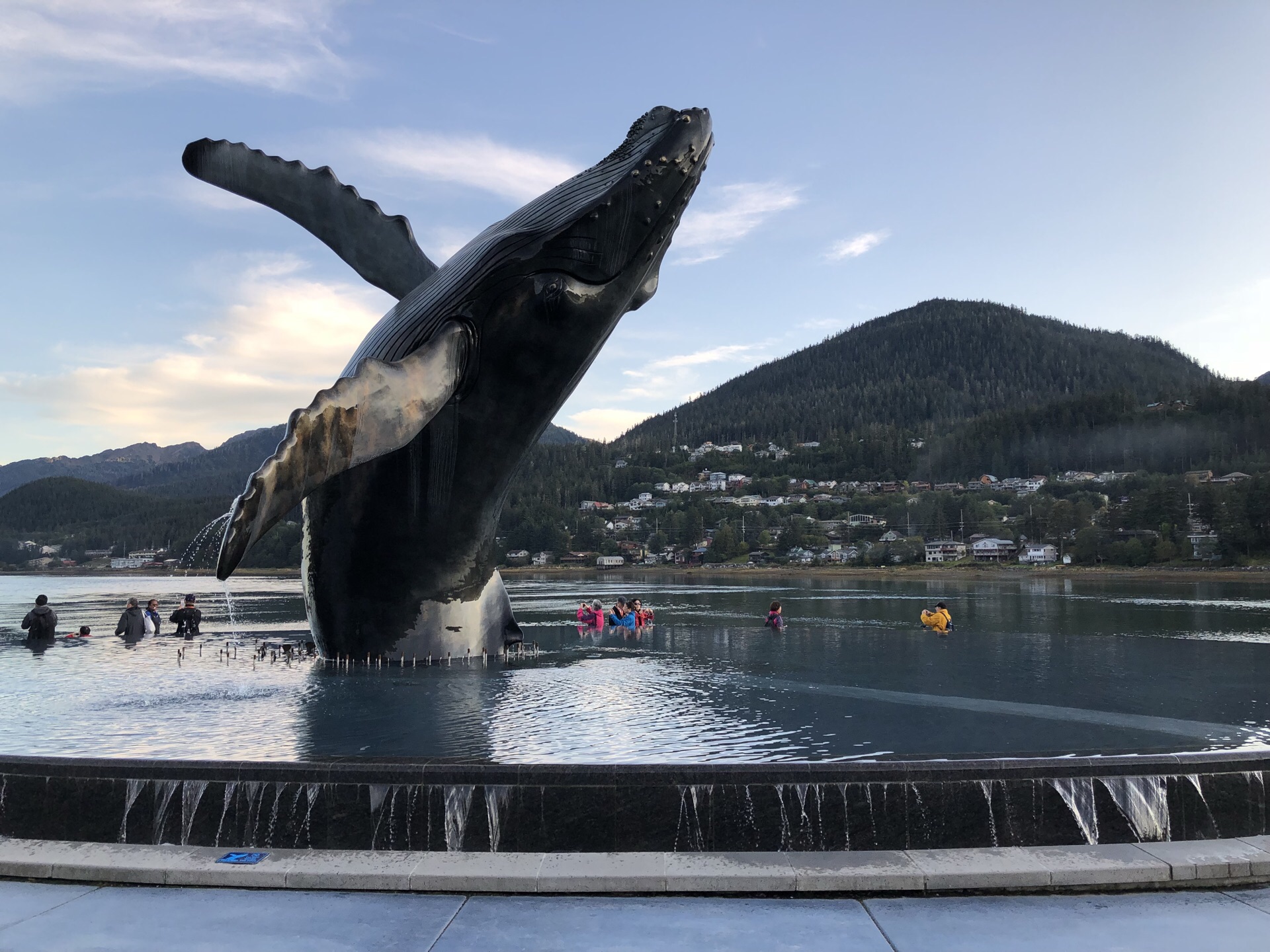 这里有一座雕塑,是一条跃出水面的大鲸鱼,鲸鱼周边会间断喷水,营造鲸鱼跃出水面的真实感。因为离朱诺的街道比较远,所以游人不多,景观还是不错的。附近就是道格拉斯桥。在这里遇到一位女士带着两条小狗,其中一条好可爱,不少人都给它拍照啊。