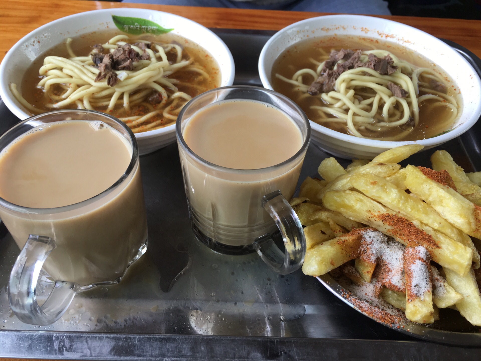 藏面,牛肉饼,甜茶,藏式午餐三件套,可惜牛肉饼卖完了。那个土豆条扎得真好吃。 藏面是用青稞做的,比较粗,也还行。甜茶奶味太重了。林芝的口味和拉萨就明显不同了。 油炸的那个土豆条真的非常好吃,配上海椒面,非常好吃。没有吃到牛肉饼,可惜了。 性价比非常高,两人吃下来才28。