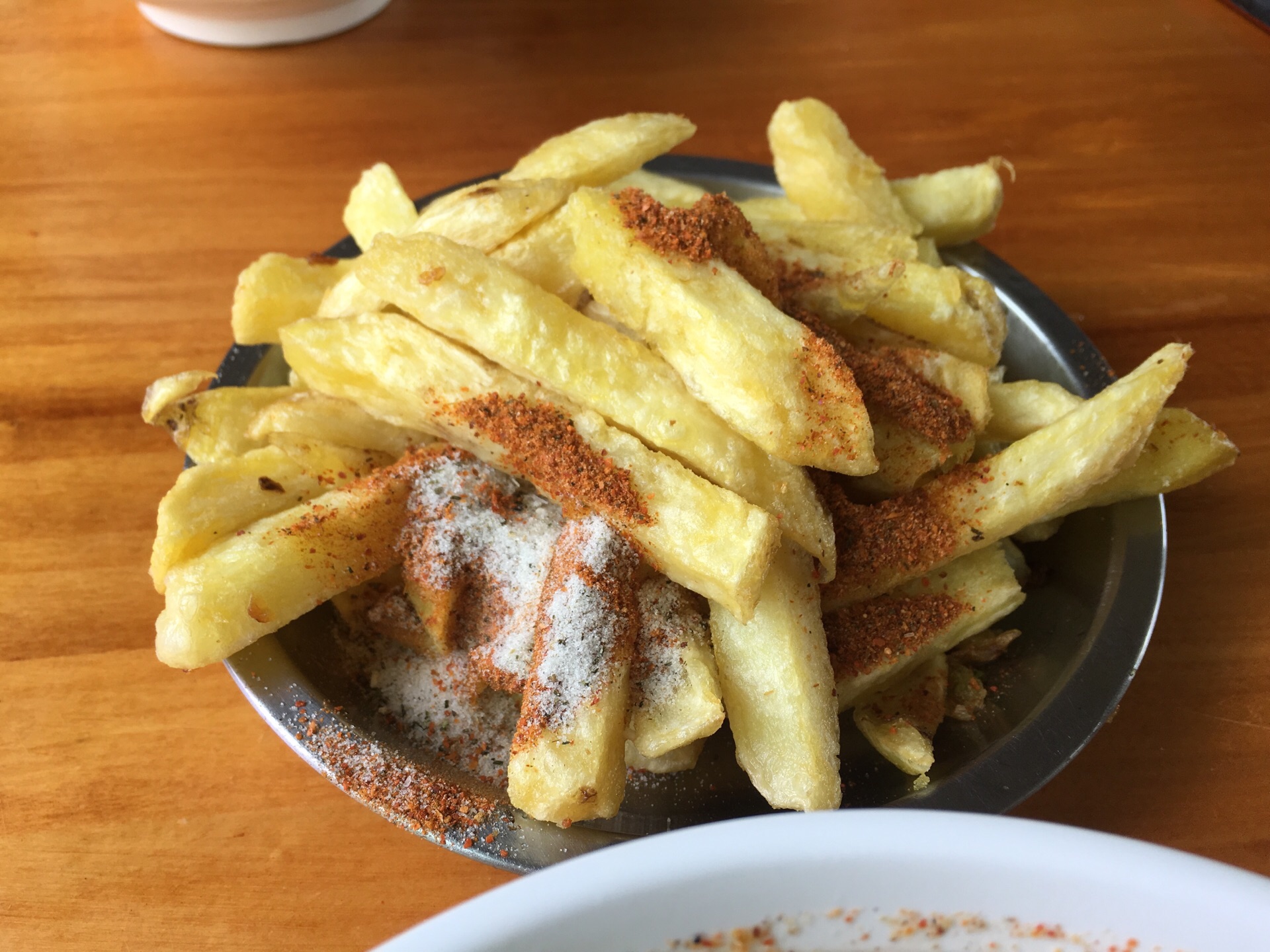 油炸的那个土豆条真的非常好吃,配上海椒面,非常好吃。那个土豆条扎得真好吃。没有吃到牛肉饼,可惜了