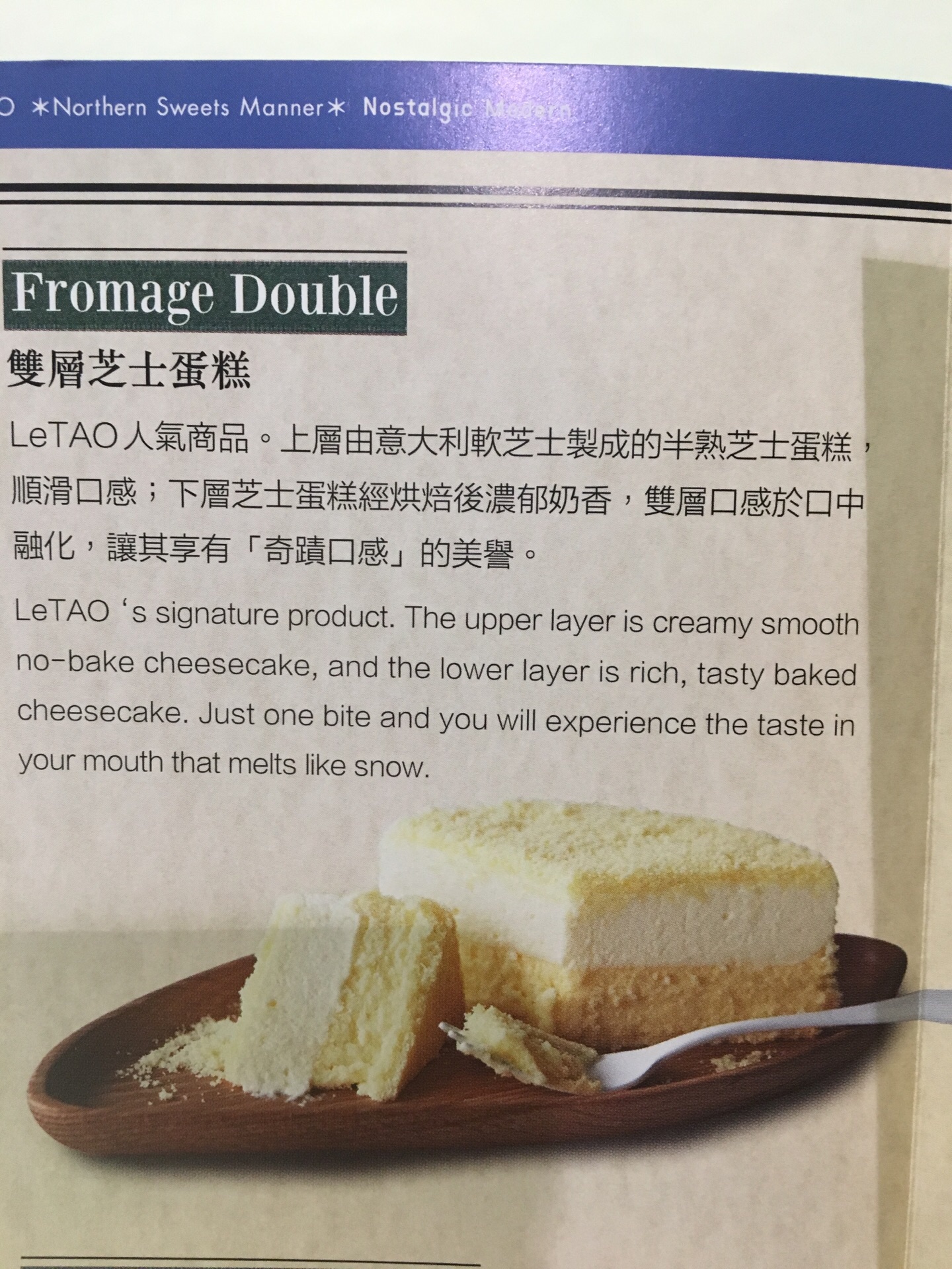 来自北海道最好吃的cheese蛋糕,之前在香港是有两家店Ifc和圆方,不过位于Ifc的分店不久前已经改为别家店了。所以趁目前在香港还吃得到,letao的蛋糕就赶紧的吃一下吧,免得以后只能在日本才买得到了。刚买到手的起司蛋糕都是冻得硬硬的,要拿回家后让它慢慢的化冻。双层乳酪起司是上下两个不同的颜色,上层的颜色较淡,下面的比较偏鹅黄色,所以是两种不同的口味。如果化冻到刚刚好的时候,上层吃起来有一点冰冰凉凉的小碎冰的感觉,而下层是口味浓郁的起司,吃一口就会爱上它。