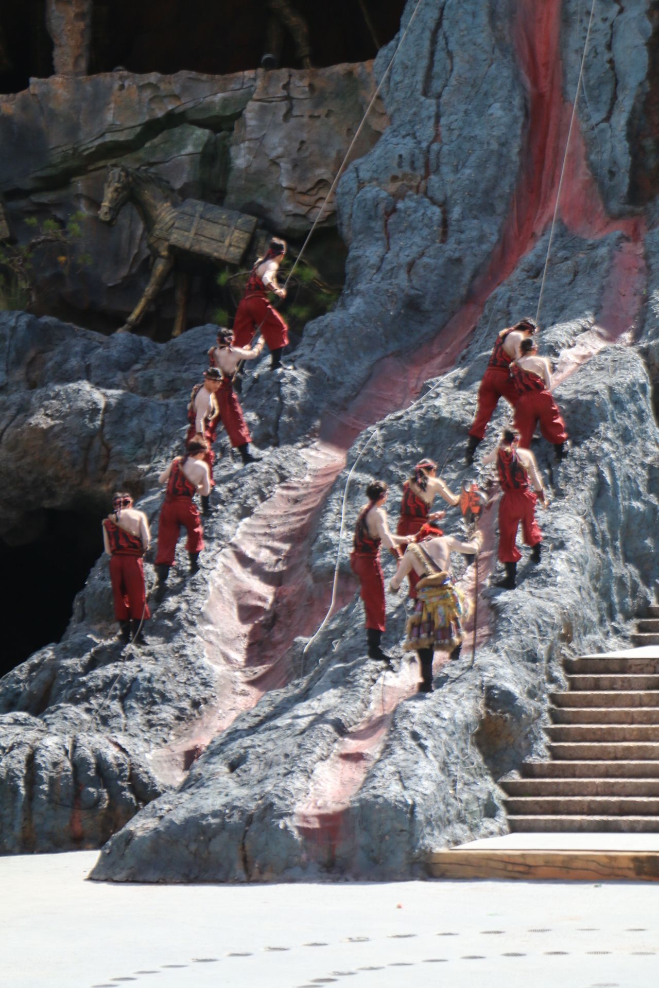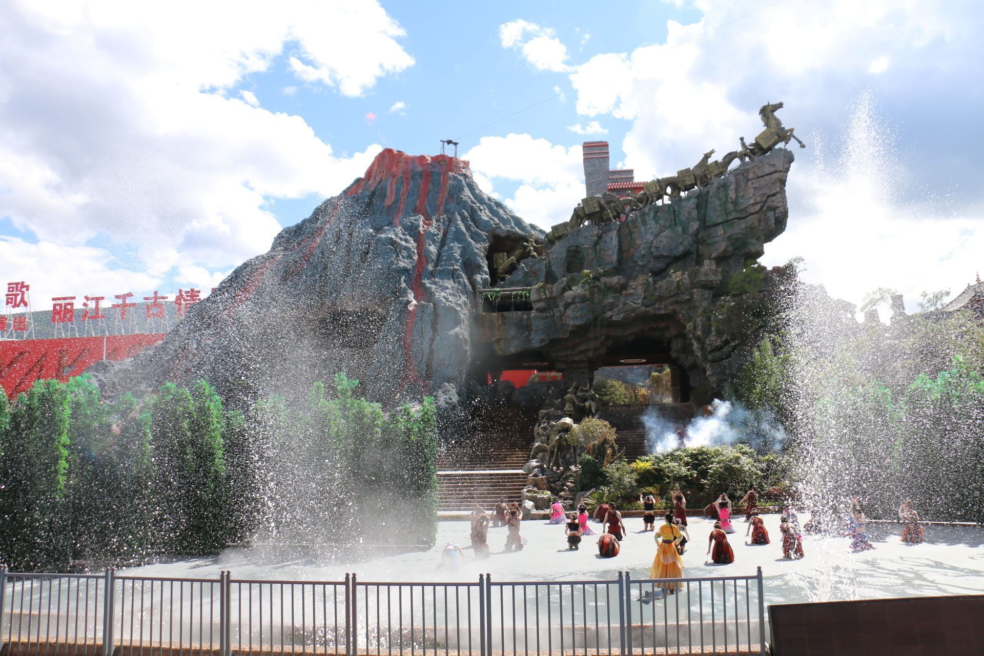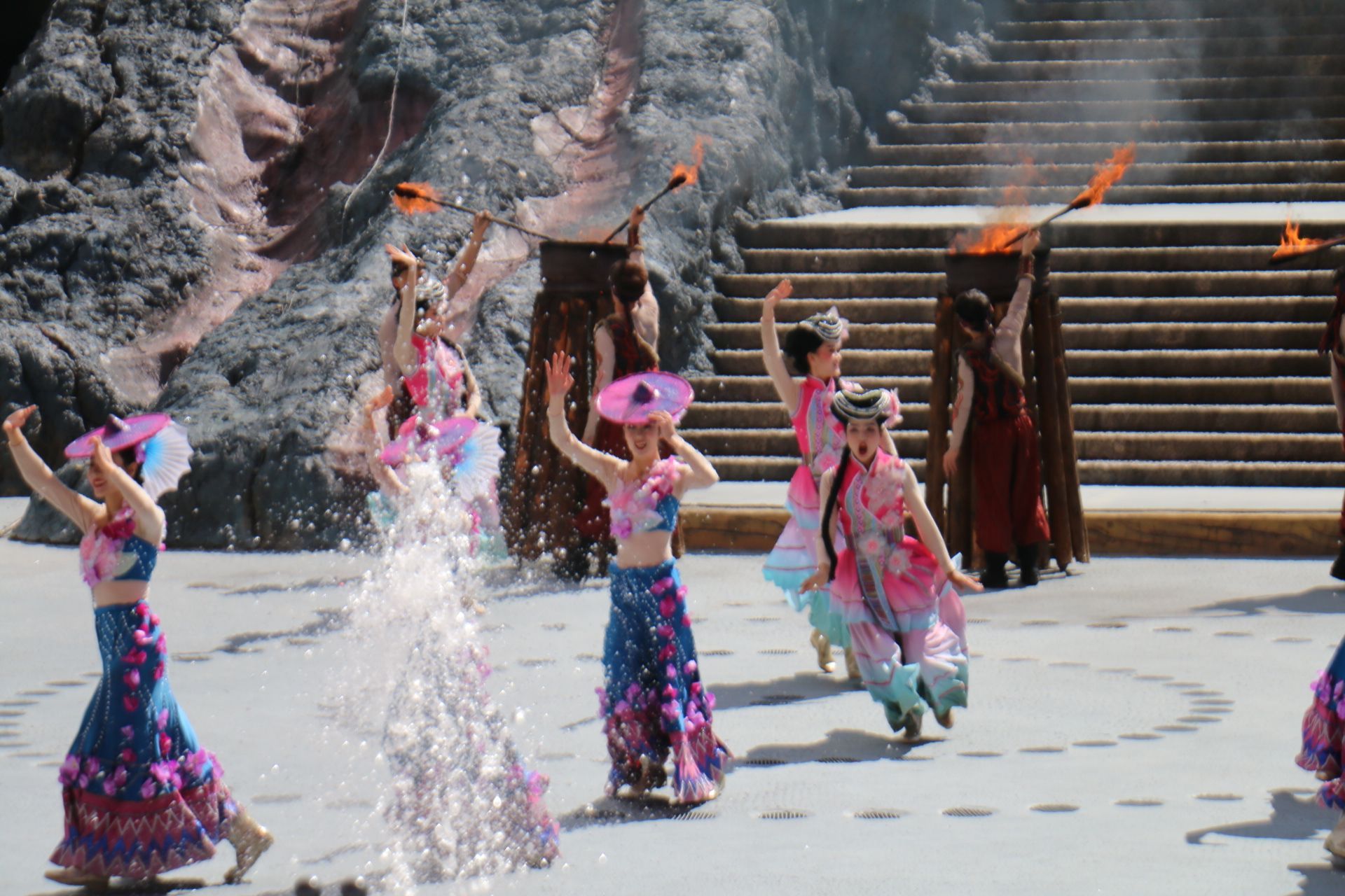 在丽江千古情景区内,属于赠送演出,没有固定席,前六排不让坐,因为会喷火流水,实际上我坐第七排最后也打伞了,还好工作人员提醒了,水太大。而且往前坐拍照会照上栏杆,还是往后一点比较好。节目还不错,最后就是山洪爆发,坐蓝色坐区比较正中间。