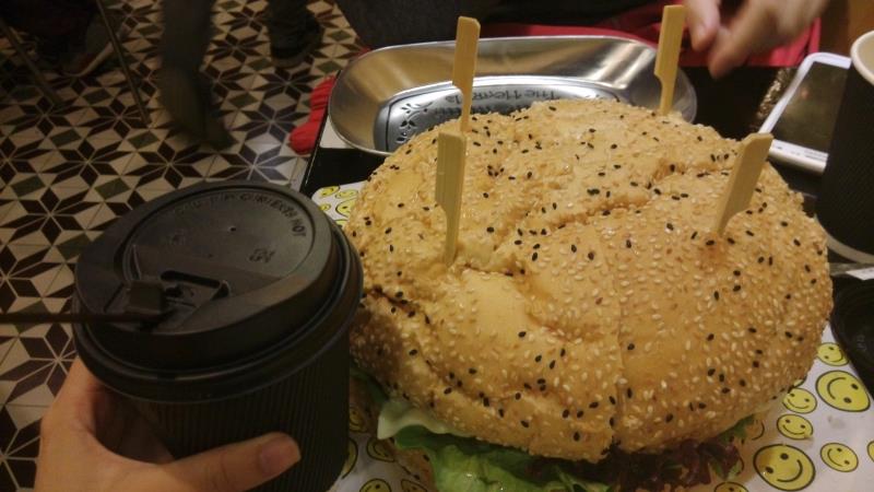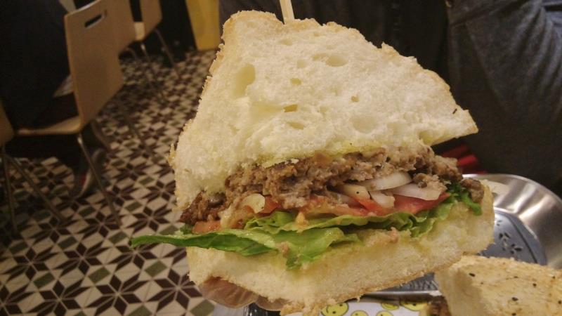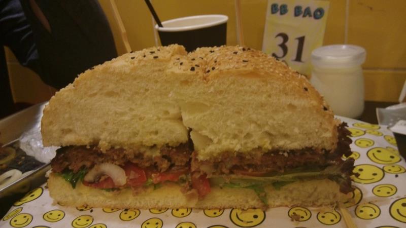 听朋友说建设横马路有一间很特别的汉堡店,于是就去一试究竟。坐公交车在东风大酒店下车后转入去建设六马路慢慢找,往前行见倒公交车站,再行前少少见倒报纸亭的路口转左再一直行就见倒,晚上经过建设六马路附近还挺多食肆的。不过今日的目的是试汉堡... 离远就见倒大大的招牌BB BAO,是一间比较细,但环境装修得有少少怀旧的店铺,门口正对着就是透明玻璃的厨房。最为吸引的就是墙上的粉笔文字,有介绍汉堡包的,还有菜牌,还有一些特别的语句。被他一句”比你的脸还大“的汉堡包吸引,看看菜牌,原来是这里的招牌,BB芝士牛肉汉堡,48元,这里最贵的一个包,但也是最大的,可以给3-4个人消灭,制作时间需要8分钟。如果加16元可以升级套餐,有鸡翅和小吃拼盘。加26元会多个小吃拼盘,饮品和芝士。还挺超值的。如果是但点其他正常的汉堡也只是9-16蚊的价钱一个。值得一提的是他家的菜牌,很特别,都是手写,而且还附带汉堡包的照片,下面手写了汉堡包的材料和等待时间,很细心。字也很漂亮。很喜欢这种DIY的菜牌。 我们要了一个招牌大汉堡,1杯柠檬茶,1杯bb奶茶,也只是6元一杯,很实惠,最后还点多了一个榴莲布丁。榴莲布丁很香滑,浓郁的榴莲味,好吃。本来还想点多一个芒果布丁,可惜已经卖完了。 另外柠檬茶和BB奶茶上来的时候都是原味的,需要自己加糖。 等了8分钟后,BB芝士牛肉汉堡终于上来了,果真比面还要大,一共分开了4份,还配备了一次性手套给你,方便食用。先来看看汉堡内的馅料,有芝士,牛肉,番茄,生菜,原本还有洋葱的,由于我唔吃,所以下单的时候叫他不要加。面包要上去很松软,夹杂内里的馅料,牛肉的味道很浓郁,真材实料,感觉比麦当劳的汉堡好吃多了。