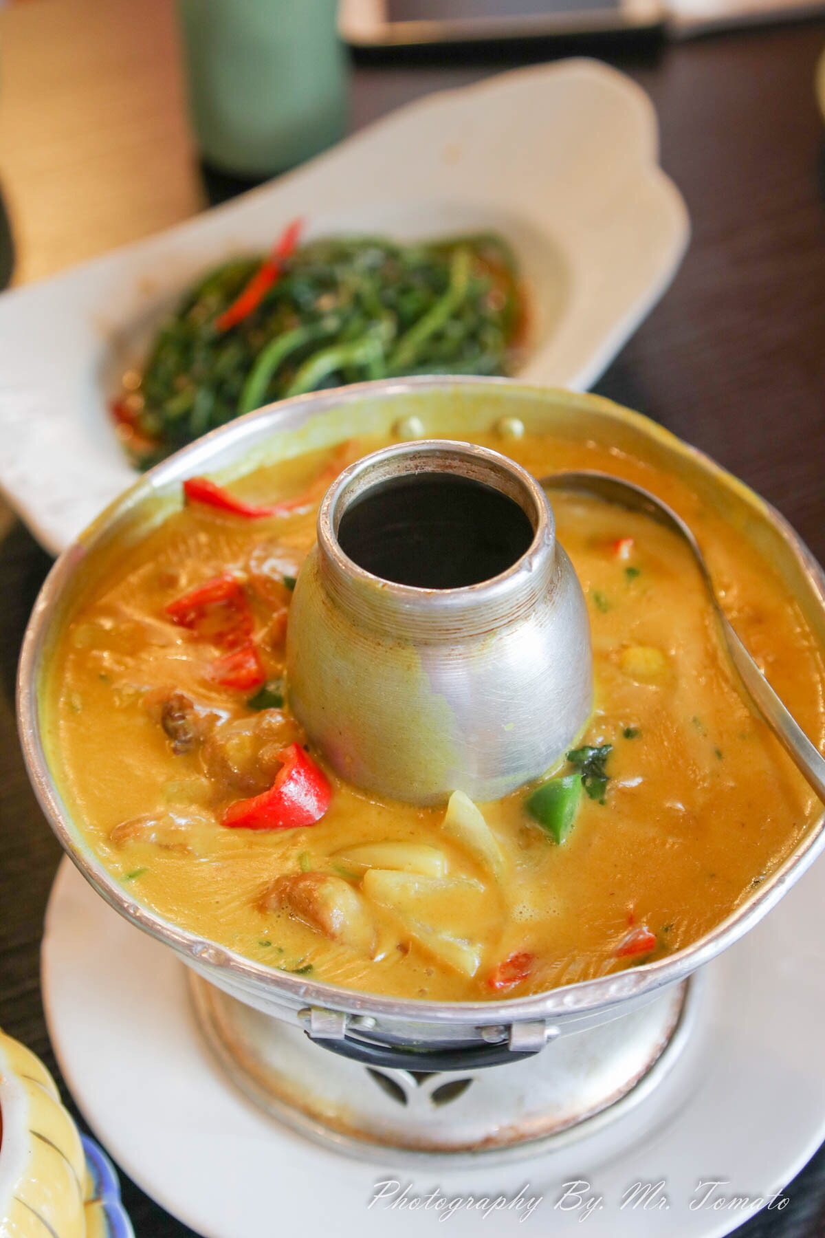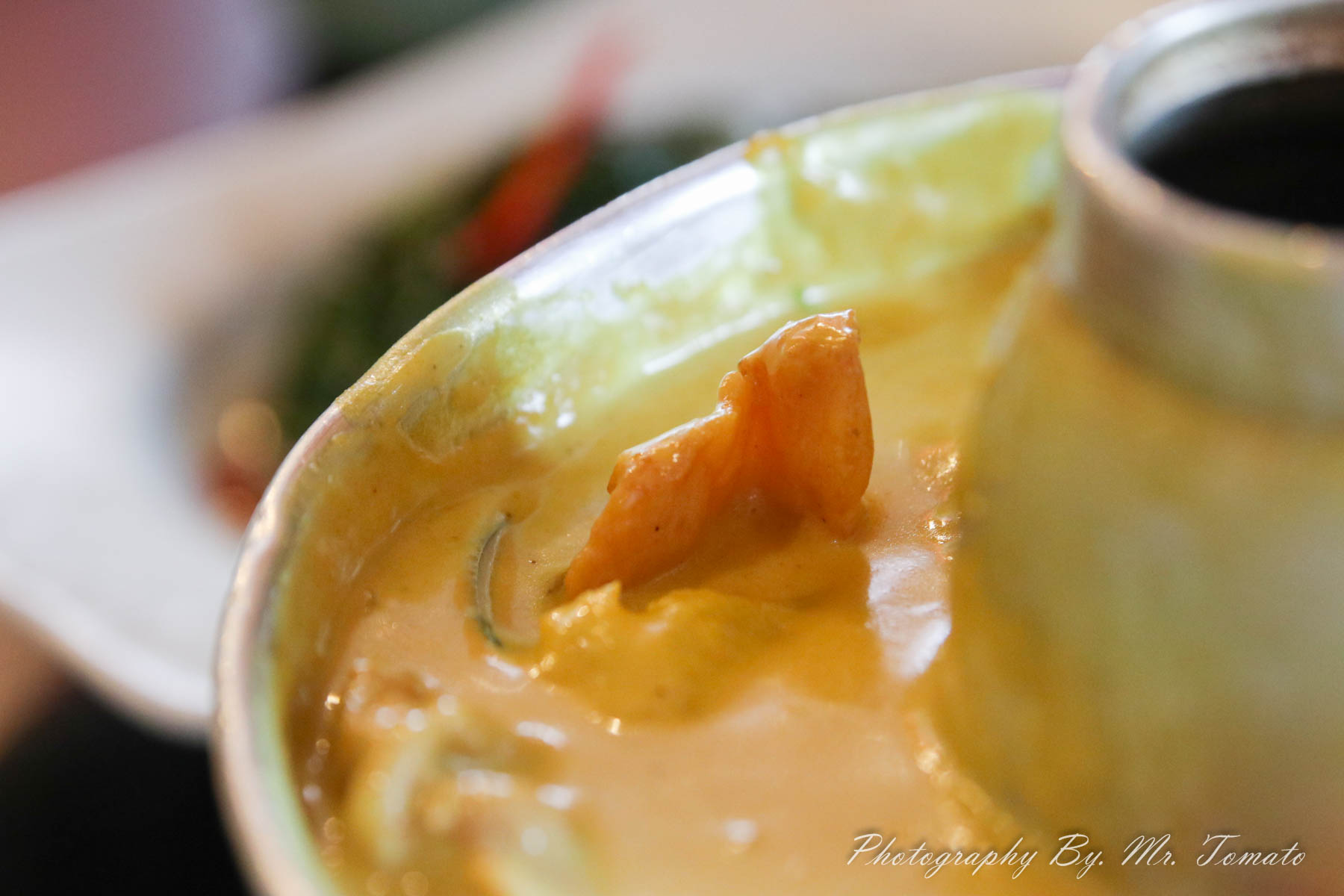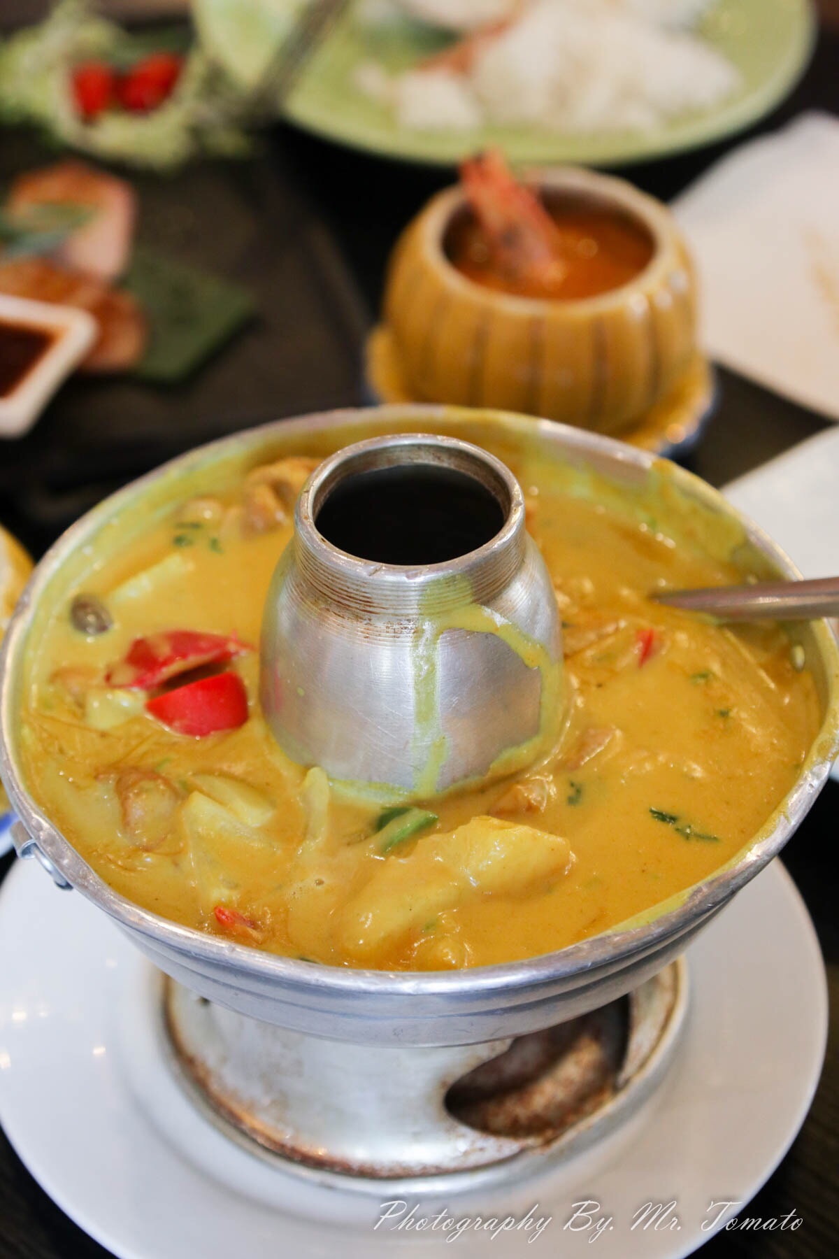 上一次来金榜这家分店,我可能还是个翩翩少年啊,头发大把大把的。如今…… 金象湾是我最喜欢的餐厅之一,这家泰国料理真的很棒,进店找了个角落坐下,十一点多已经有好几桌客人在用餐了。 「马来咖喱鸡」两个人的话点一桌马来咖喱鸡其实就够了,那浓郁的咖喱汤汁就已经能配下好几碗米饭。何况还有鲜嫩的鸡呢和最爱的土豆呢。 「冬阴功汤」每人来一份,吃泰国菜必点。散发着独特的香茅与冬阴功的香气,微辣的口感,每喝一口都让人心旷神怡。 「炭烧猪颈肉」猪颈肉常吃,但是他们家的我最喜欢,嫩到不行。