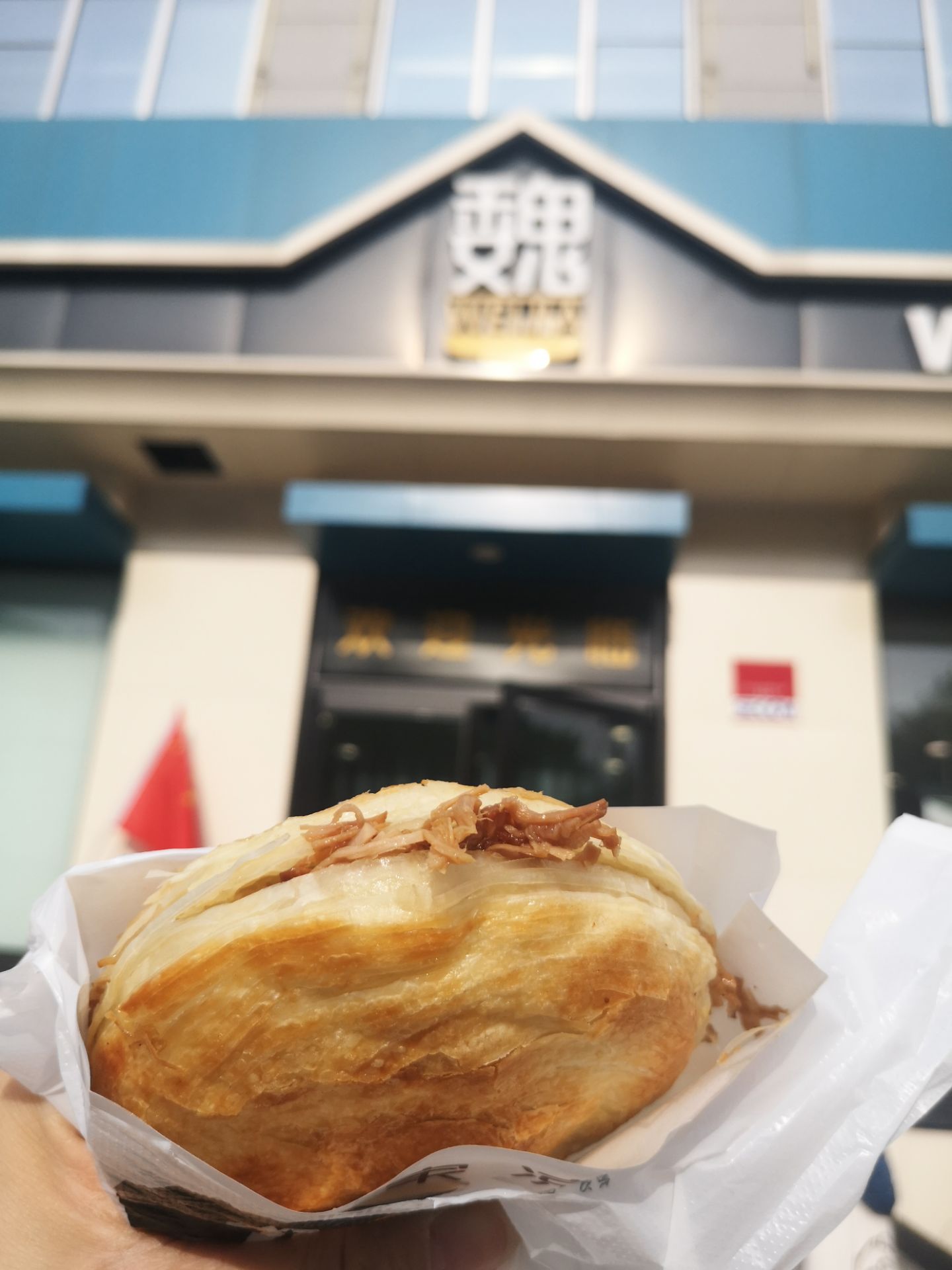 连续吃了四天酒店相同的早餐,今天不吃了。 馍香脆无比,买的是升级版的,肉也很多,就是肉的酱汁少了些