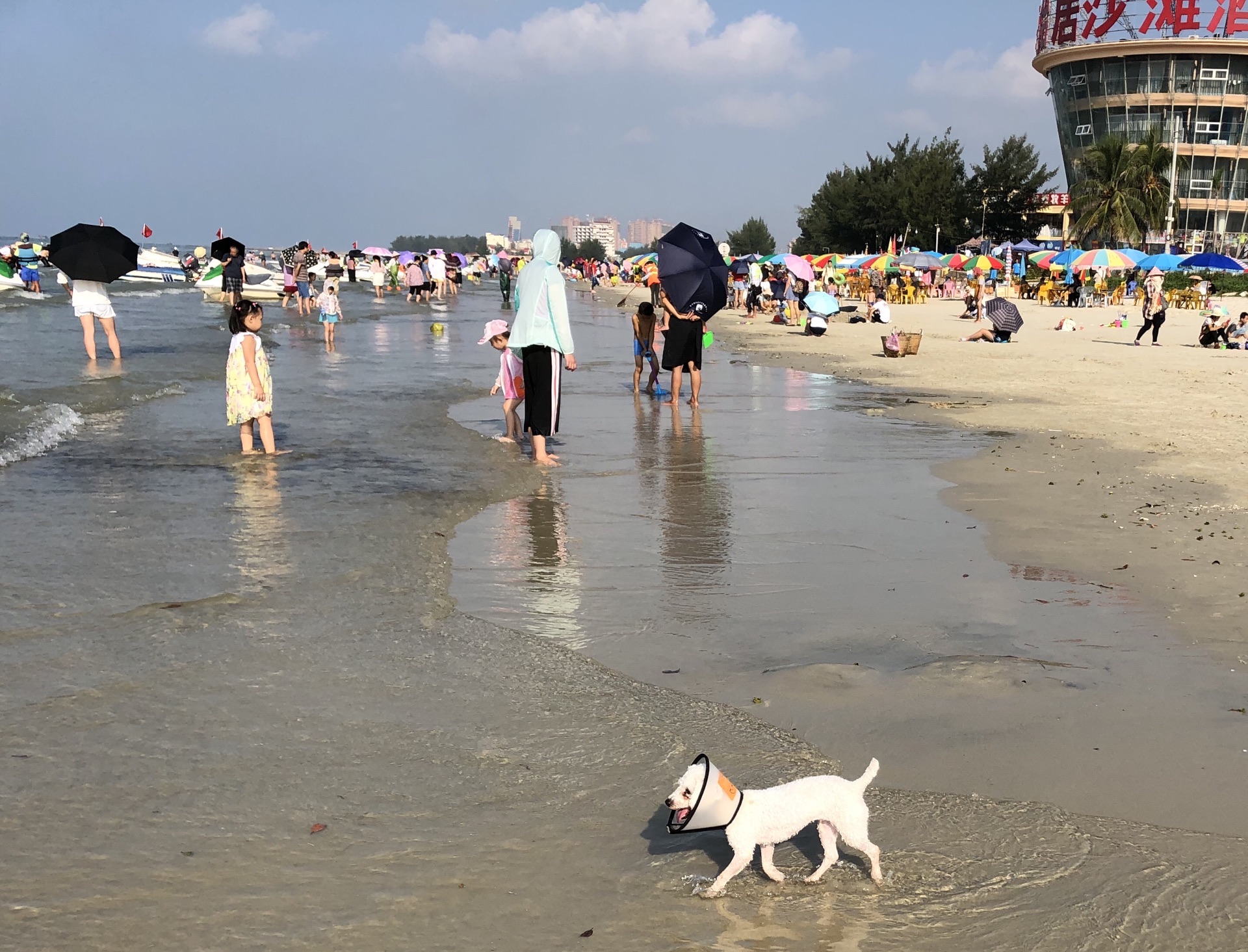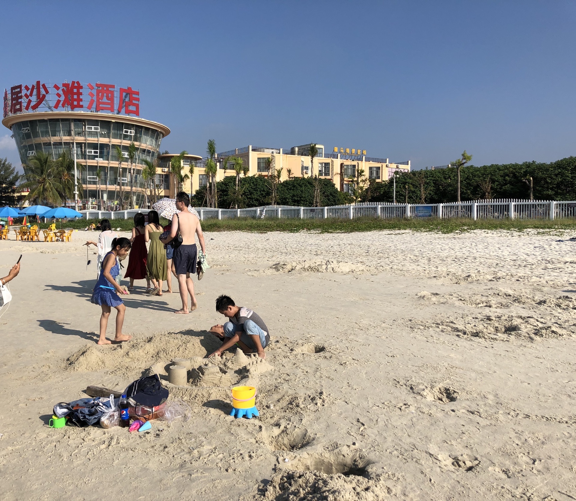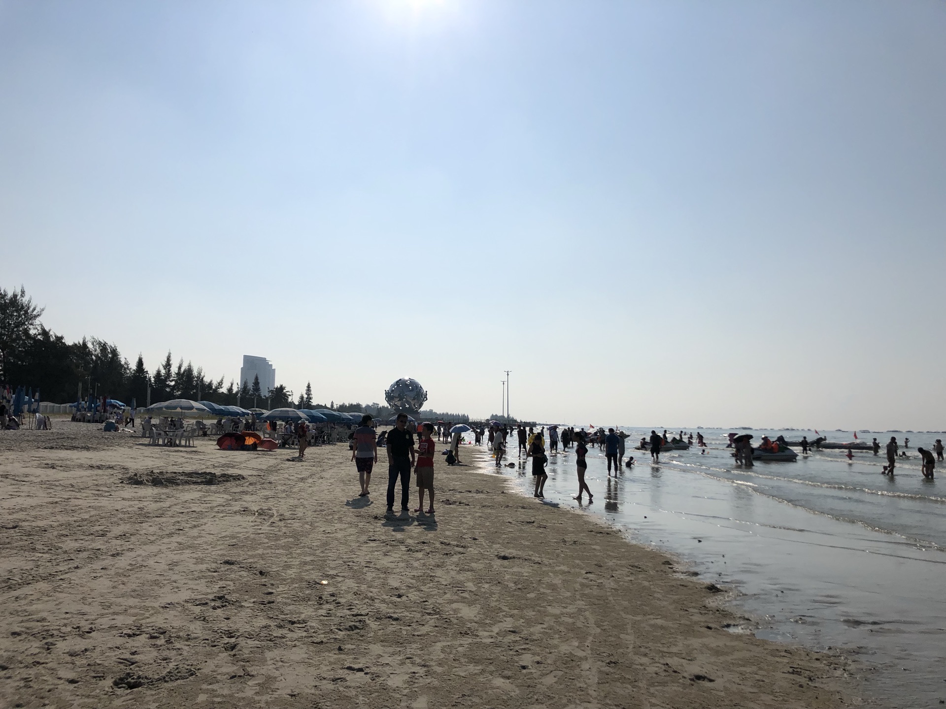 海滩公园与银滩相连,差一点误以为就是银滩,玩了准备离开时,才听开环游车的师傅说了二者不同。觉得海滩公园的沙更细,沙滩上很多小孔,仔细观看发现是许许多多小指指甲大小的沙蟹的出入通道,它们上上下下窜个不停,但非常警觉,只要稍有光影靠近,立即入孔遁形;它们用沙把吐的泡泡包裹几下,然后刨开,形成一粒粒园沙球,非常有趣!