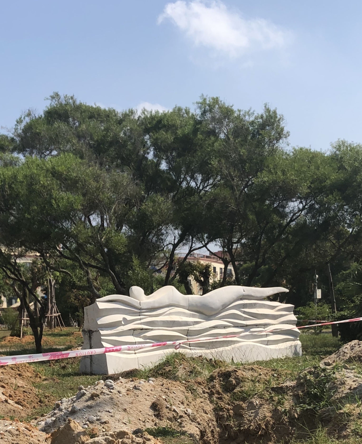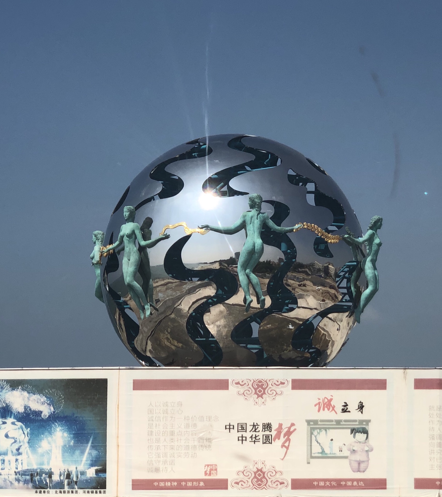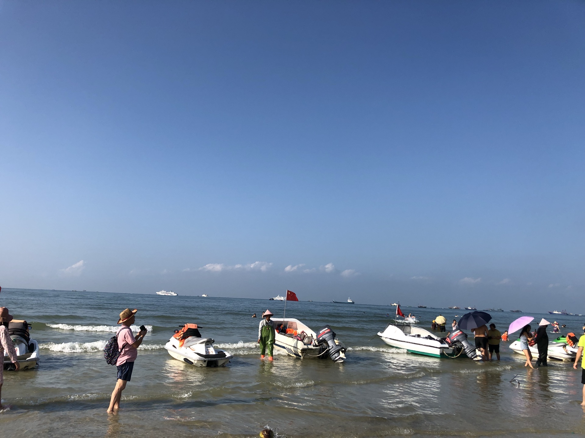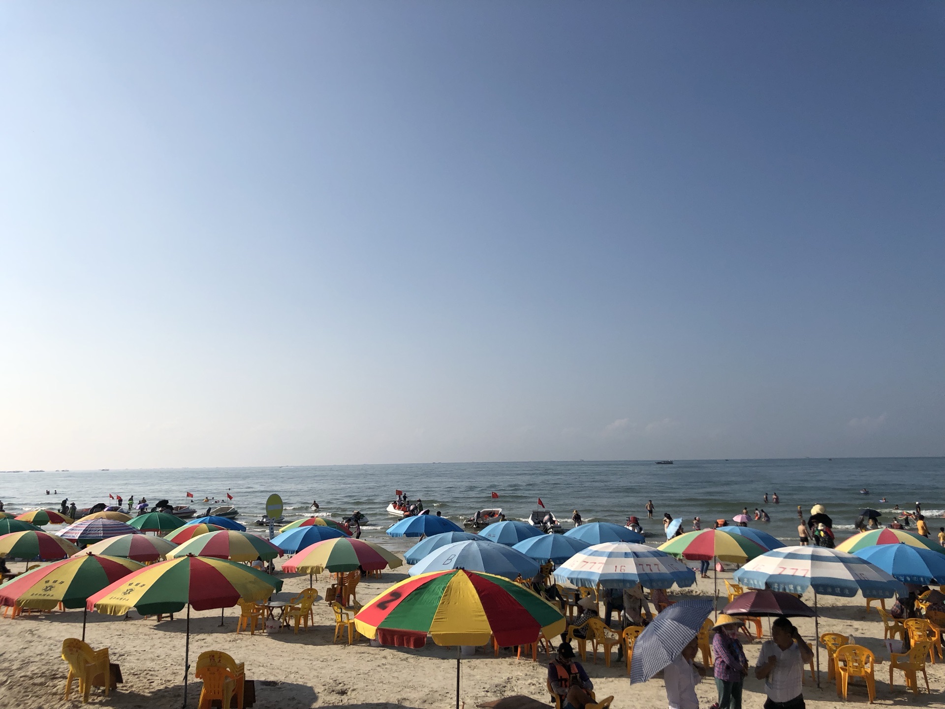 海滩公园与银滩相连,差一点误以为就是银滩,玩了准备离开时,才听开环游车的师傅说了二者不同。觉得海滩公园的沙更细,沙滩上很多小孔,仔细观看发现是许许多多小指指甲大小的沙蟹的出入通道,它们上上下下窜个不停,但非常警觉,只要稍有光影靠近,立即入孔遁形;它们用沙把吐的泡泡包裹几下,然后刨开,形成一粒粒园沙球,非常有趣!