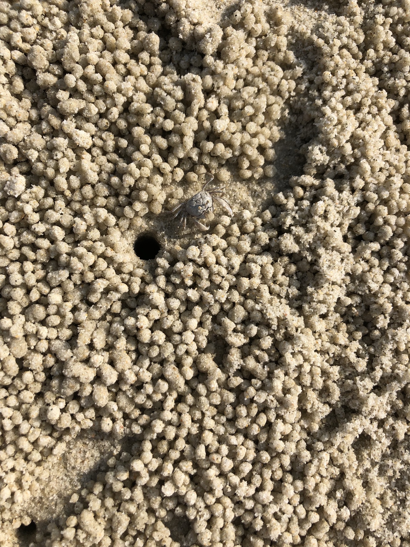 ...小指指甲大小的沙蟹的出入通道,它们上上下下窜个不停,但非常警觉,只要稍有光影靠近,立即入孔遁形