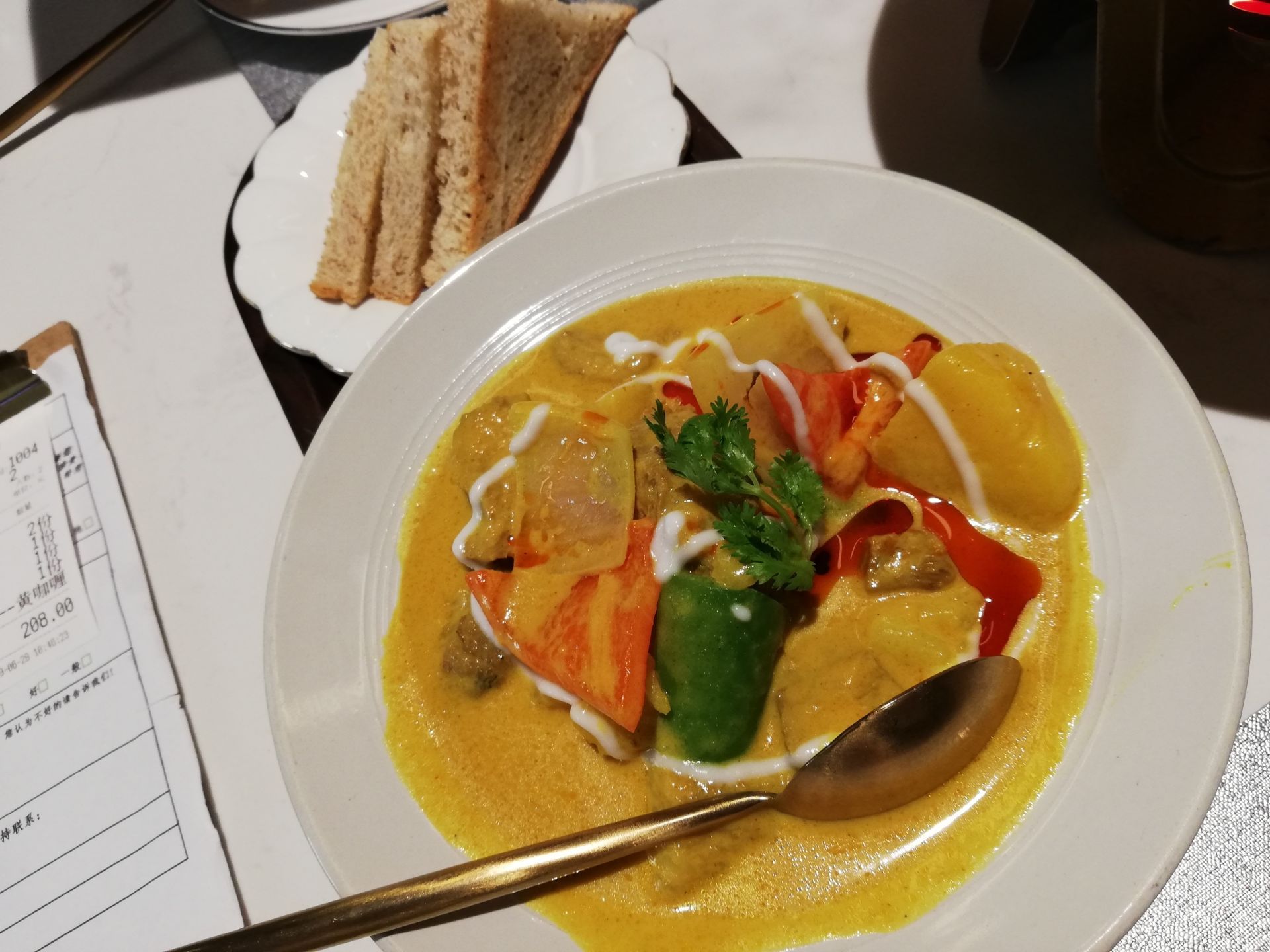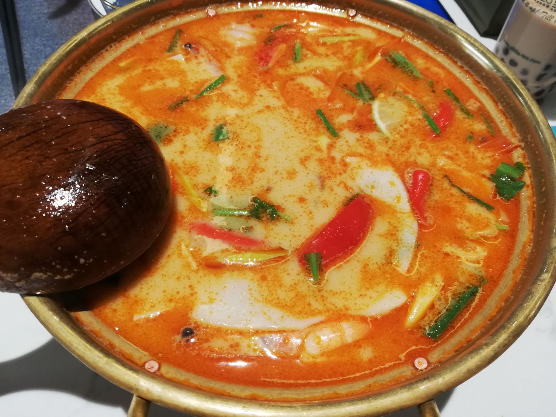 无意间发现了这家店店,在观音桥的天和里的楼上,说实话天和里最顶楼上面基本全是吃的,但是从人气来说,这家店排第一了。这个商场没什么人流量,楼上的餐饮倒是有点人了。点了经典菜品,冬阴功汤,味道真的是很麽好喝,反正是我个人喜欢的口味。一锅基本遭喝完了的,好喝惨了。咖喱牛腩,咖喱味道也是很不错的,就是牛肉稍微有点肥了。点一碗米饭,咖喱全包啦。饮品第二杯半价,这个柠檬红茶里面放得有薄荷,味道还有点特别的。这顿饭吃得美滋美滋的,甚是欢喜。。。价格嘛,团购的69抵100,只能用一张券,2个人消费200零点,能够接受。