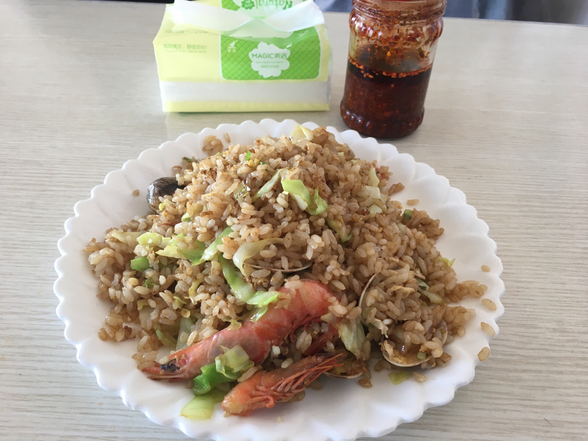 就迫不及待来到这家网上很出名的小林面馆,要了一份海鲜炒饭,里面就是海虾,花甲与白菜的组合,饭的...一到庙子湖镇放下行李,就迫不及待来到这家网上很出名的小林面馆,要了一份海鲜炒饭,里面就是海虾,花甲与白菜的组合,饭的份量很一般,味道还是挺赞的。这里是岛上为数不多可以团购的,很划算的。