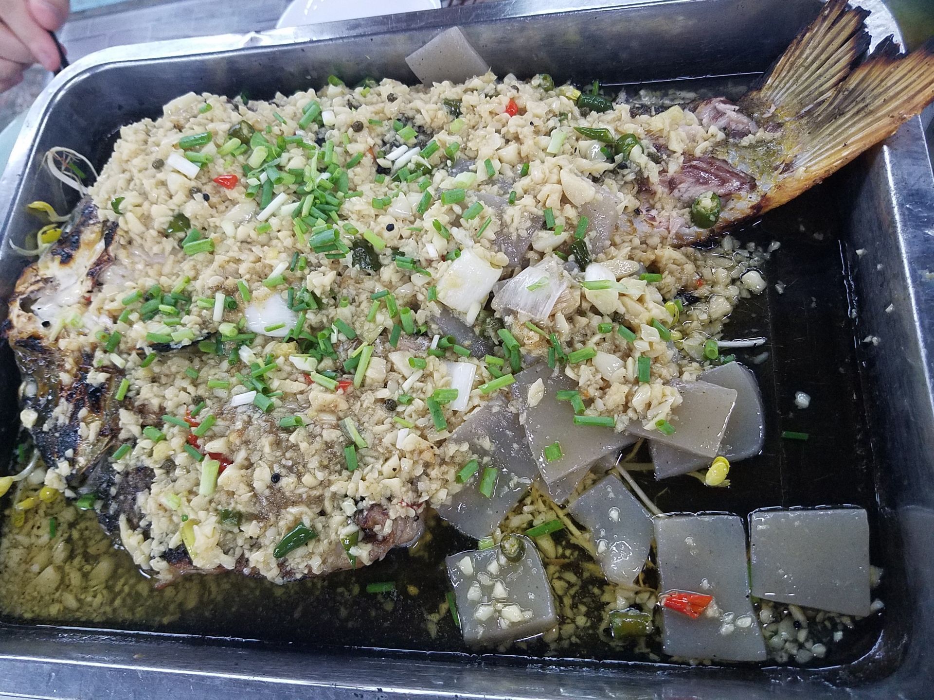 来万州一定要吃烤鱼的。万州的心连心广场上,一长排全是吃烤鱼的铺子。晚上去的,这家生意最好,完全坐满了,而且还在翻台。烤鱼有好几种味道,一条鱼一种味道。因为一条鱼就有3斤多,人多的话就可以吃到更多的味道。鱼是剖成两半夹住放在一个大炉子中烤。因为不敢吃辣,点了个鱼香,一个蒜香,味道都不错,鱼肉新鲜也很嫩。鹌鹑蛋皮蛋味道也不错。
