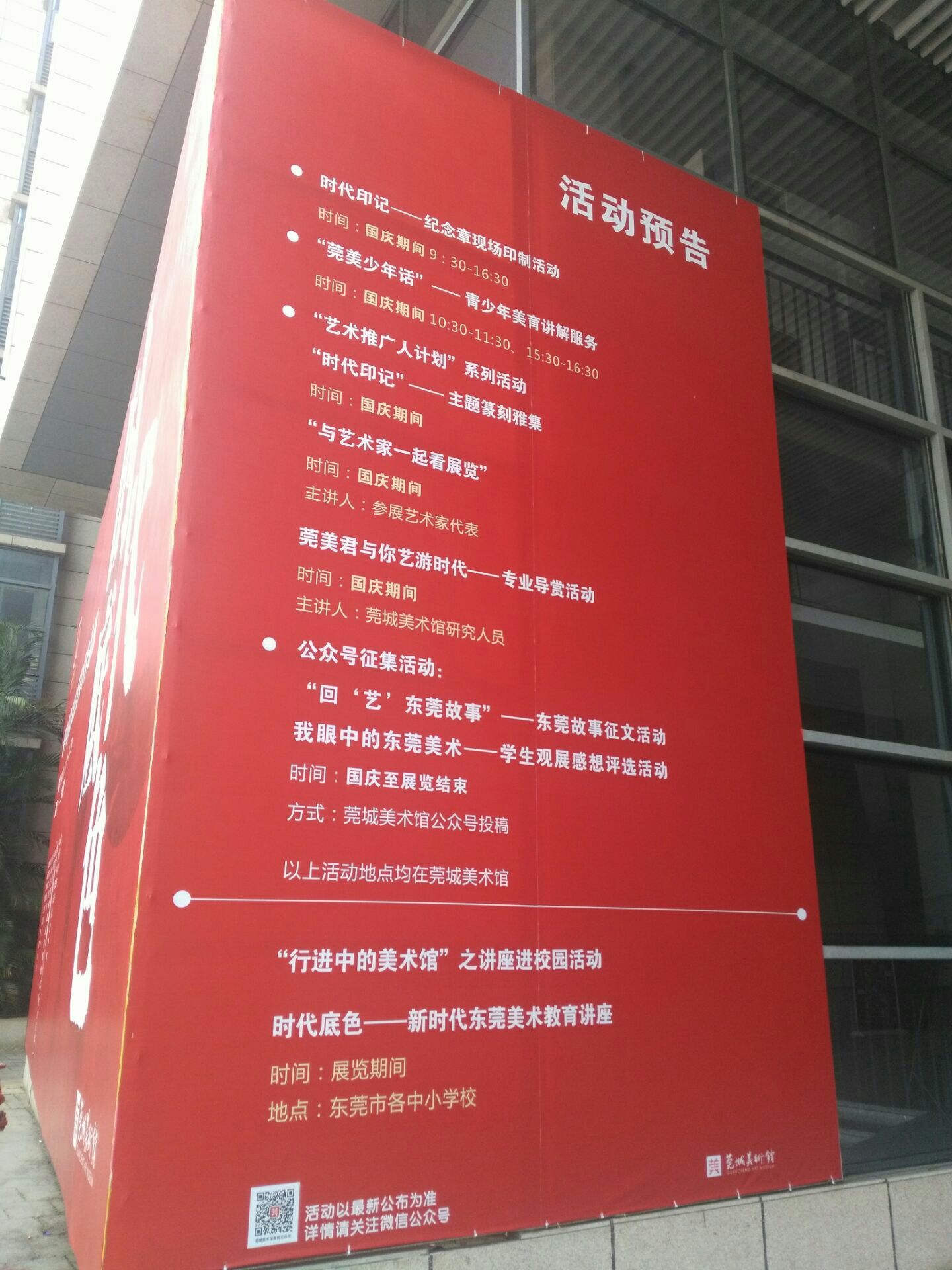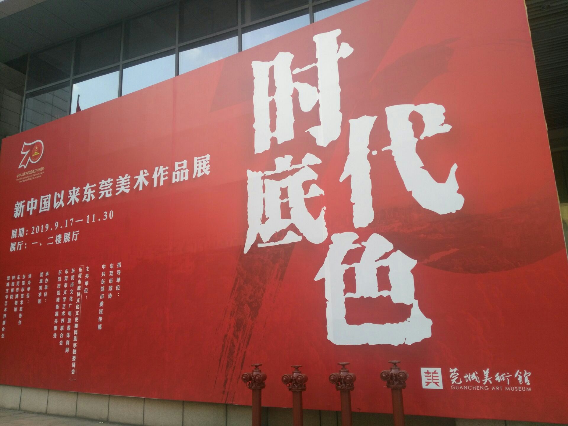 莞城美术馆位于文化广场旁,附近有西城楼、百佳超市,离人民公园正门也很近,有挺多公交车经过,交通便利。美术馆的正门简单朴素,墙边的绿植挺有特色(见图一)。正值国庆期间,有题为〃时代底色〃的展览,可以去看看(见图二和图三)。