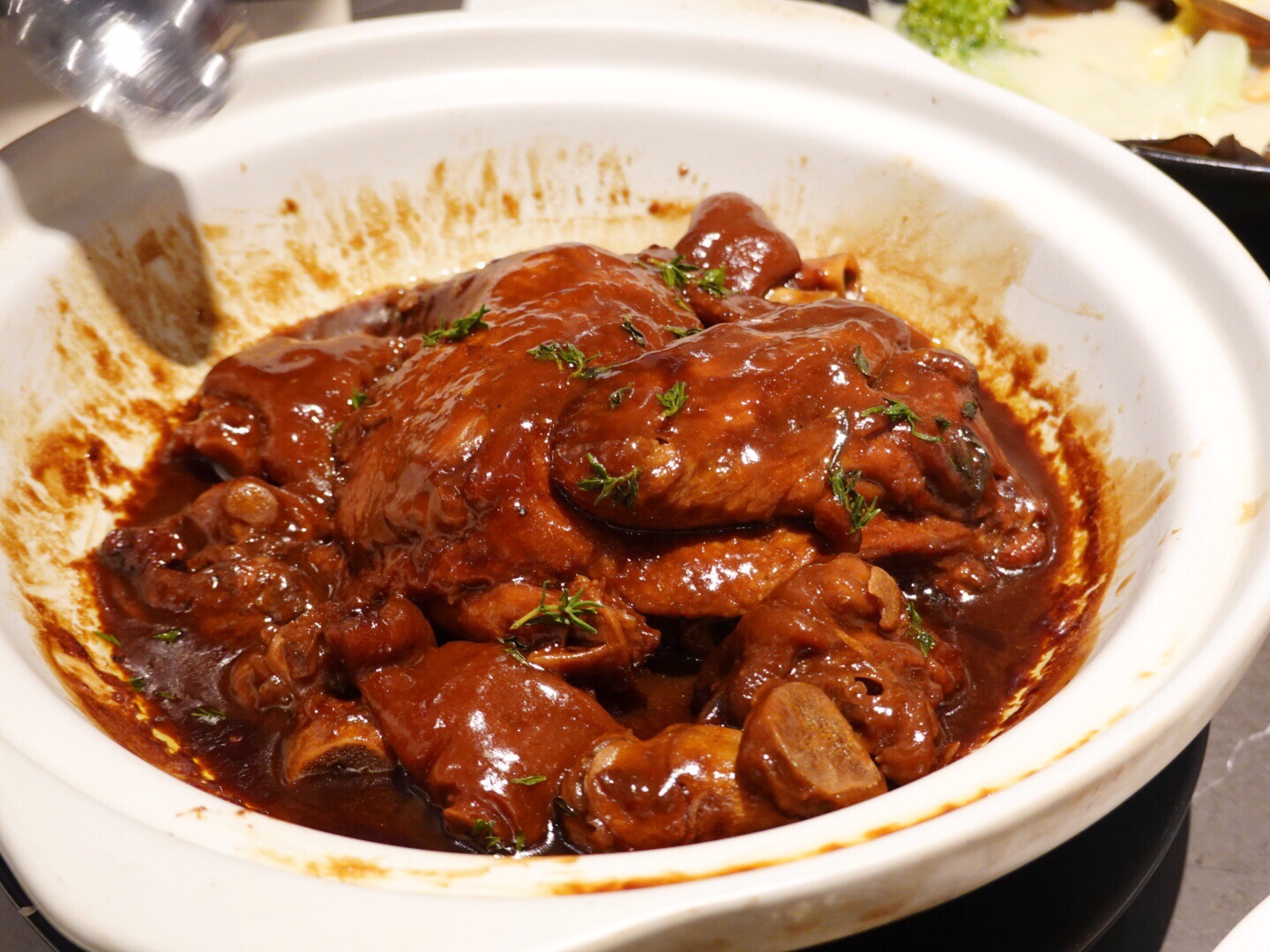 「百里香猪手鸡」,香气扑鼻,色泽诱人,鸡肉入味,猪手醇香软烂。 在港式料理的基础上融合了不同的风味