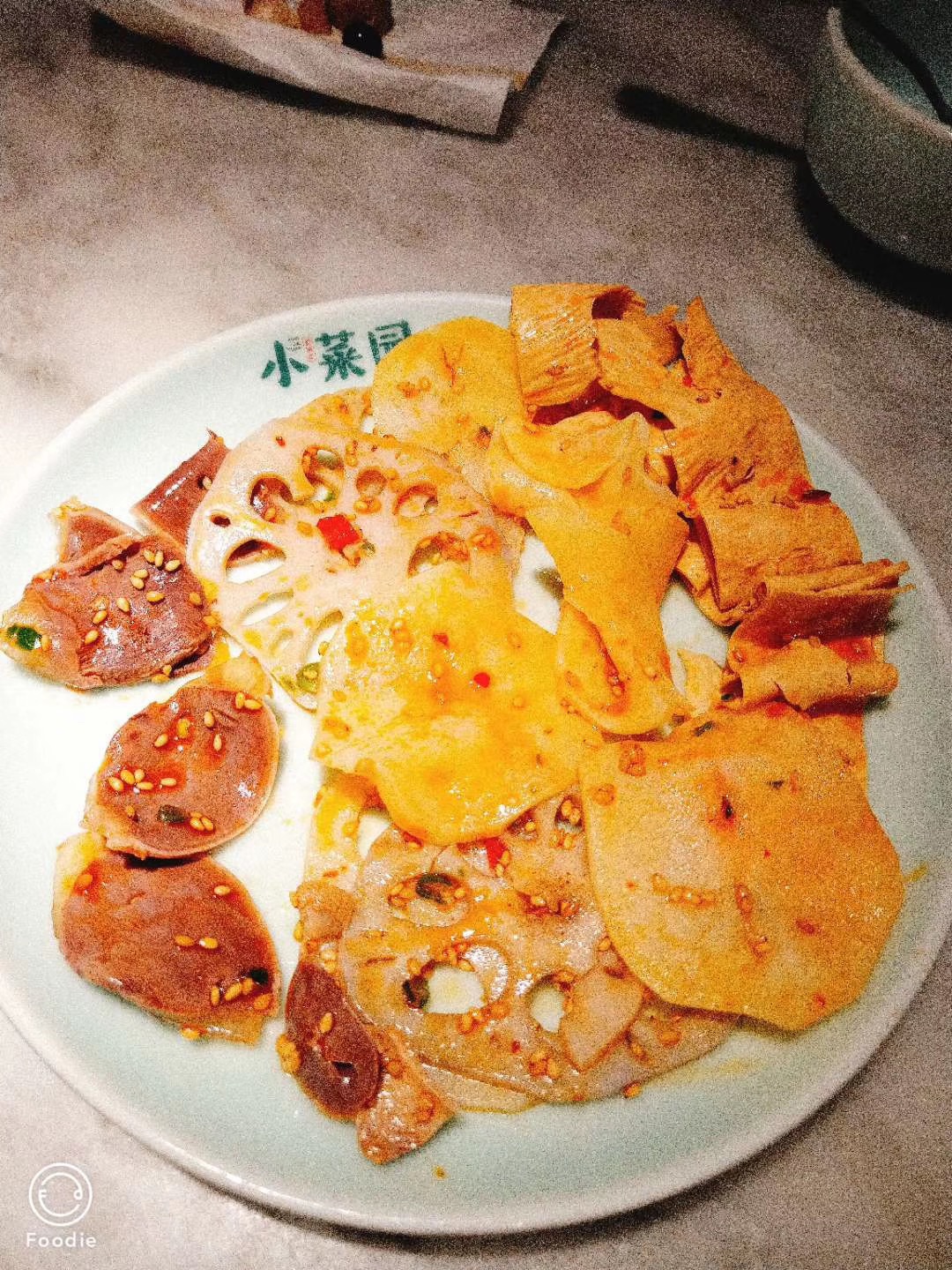 红烧鸡爪,不愧为招牌菜,味道确实非常的好,所也特别受欢迎,到了小菜园我朋友首先点的就是这道卤水豆腐,也就是我们平时说的老豆腐,虽是老豆腐,但豆腐一点也不老,味道也不错,这也是一款推值得品尝;海鲜炒粉丝,是用鱿鱼丁和虾丁炒的粉丝,味道很棒,我比较喜欢;还有免费的自助水果和小菜。