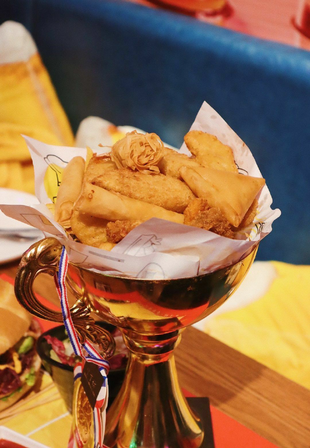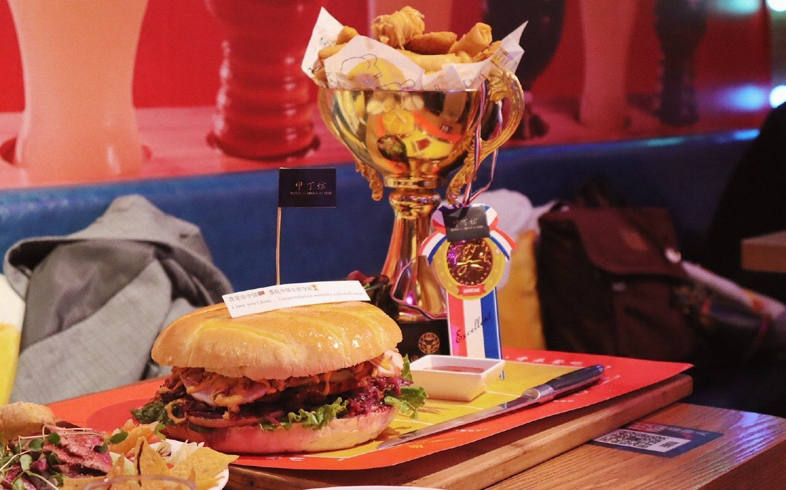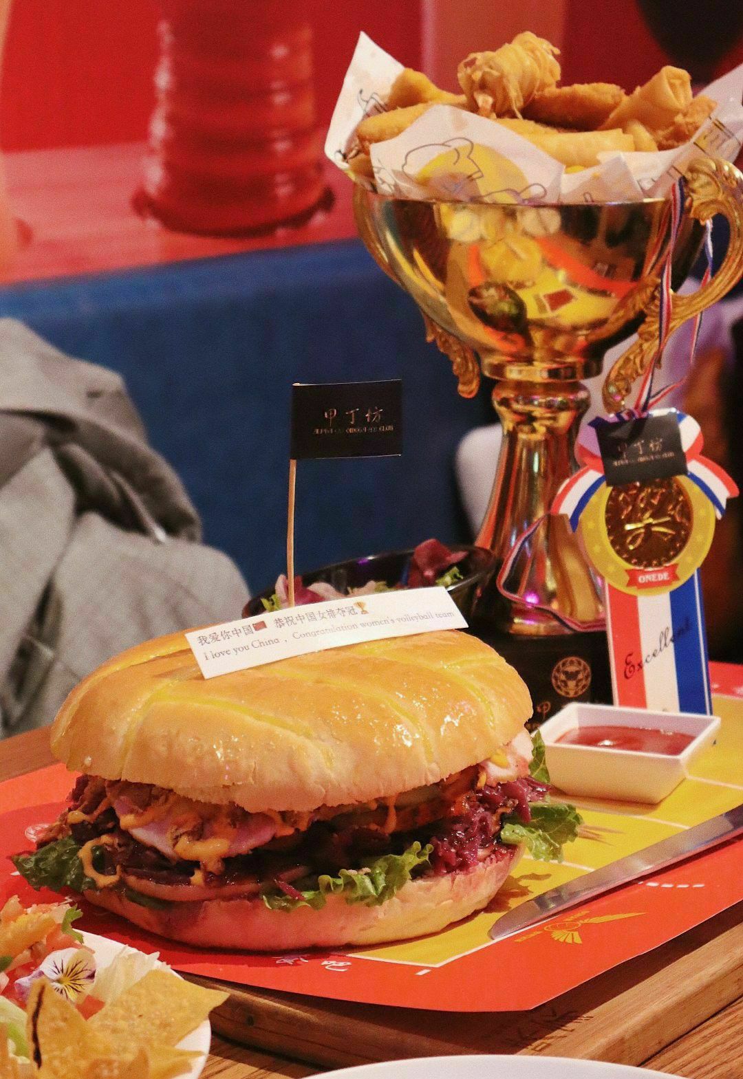 【 排球汉堡 】真的超大size!难怪叫排球汉堡,当然了!更是庆祝咱中国女排夺冠,面包烤制的非常赞,外酥内软,内里是火鸡胸肉,火鸡腿,火鸡香肠,蔬菜牛油果等,一口吃下去,多汁且层次分明。 【 冠军杯 】炸物很丰富,鳕鱼块、鸡块、鱿鱼圈、虾酥卷、咖喱角、玉米片,炸衣薄脆,火候刚刚好。 【 德国脆皮大猪肘 】猪皮超级酥脆!!一定要尝尝!烤制的咸味中还带了一些鲜甜,非常喜欢,猪肘肉嫩,连着酥皮蘸蜂蜜芥末酱or蕃茄酱都很不错。