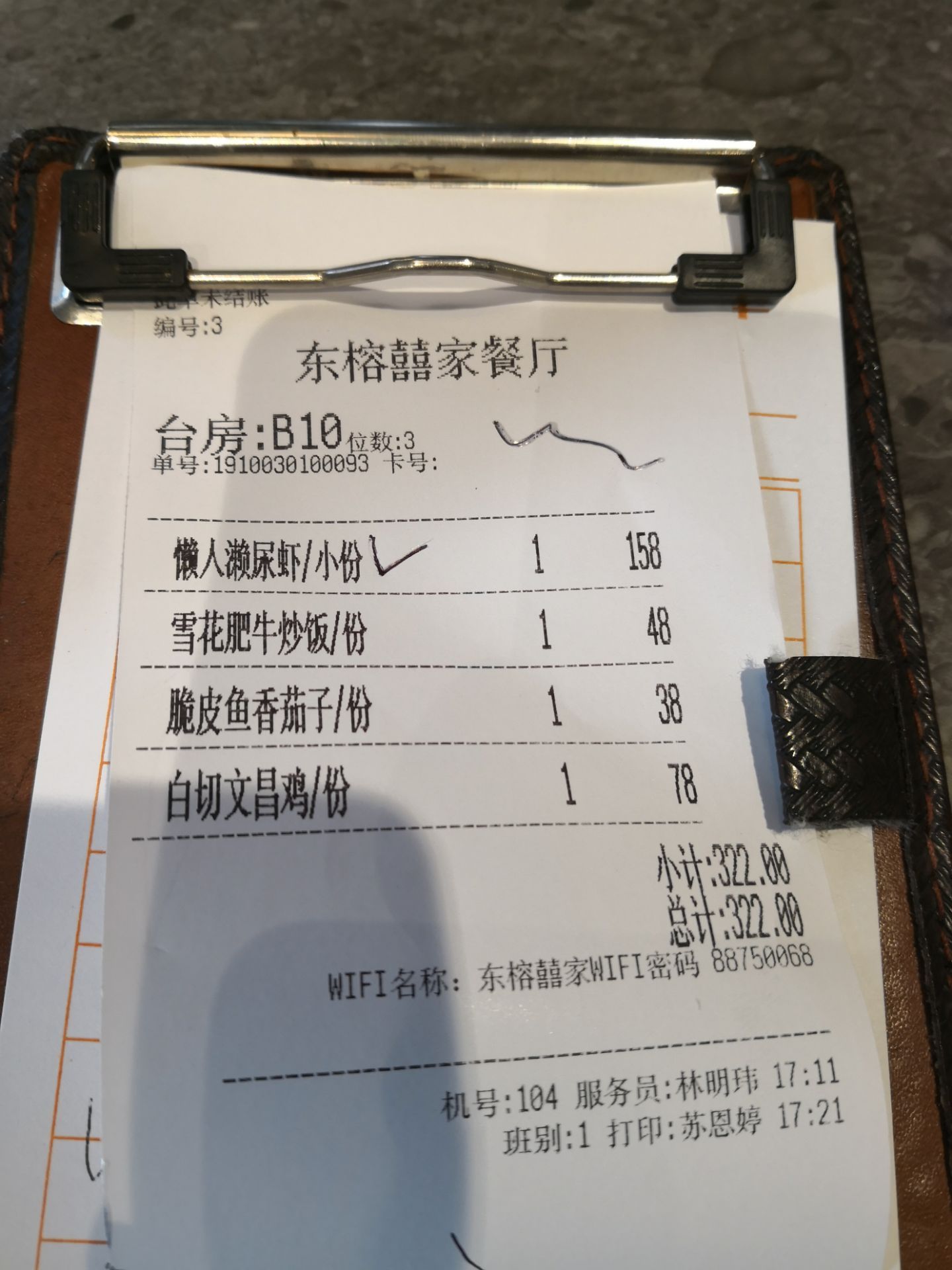 第一次吃东榕是在亚龙湾,在海棠湾68美食广场感觉东榕开了好多家,这家是主打粤菜的,其他还有家主打海南家常菜。 5点左右来的,人还不是很多,还以为他们家生意一般,到6点多的时候人就渐渐多起来了。从旁边海鲜店买来食材加工的顾客也不再少数。 |薄荷水^比想象中的味道更加寡淡一些,用来解腻是不错的。 |脆皮鱼香茄子^招牌菜,就是茄子裹上一层椒盐面衣,然后可以蘸点甜辣酱,味道一般。 |避风塘懒人濑尿虾^濑尿虾肉裹一层面衣配面包粉,总觉得这家很喜欢裹面衣[呲牙],还是一般那种带壳椒盐比较好,能够体现濑尿虾的鲜味。 |真味白切文昌鸡/只^点了小份文昌鸡,吃过了上海白斩鸡的同学可能觉得没啥惊喜,差别不大。 |雪花肥牛炒饭^牛肉沫炒饭,有点咸。 总体来说菜品一般,旅游景点价格,建议自己带海鲜加工,配点小菜和白饭比较好。 香菇干和酸辣海带是推销员送的,很好吃[愉快]