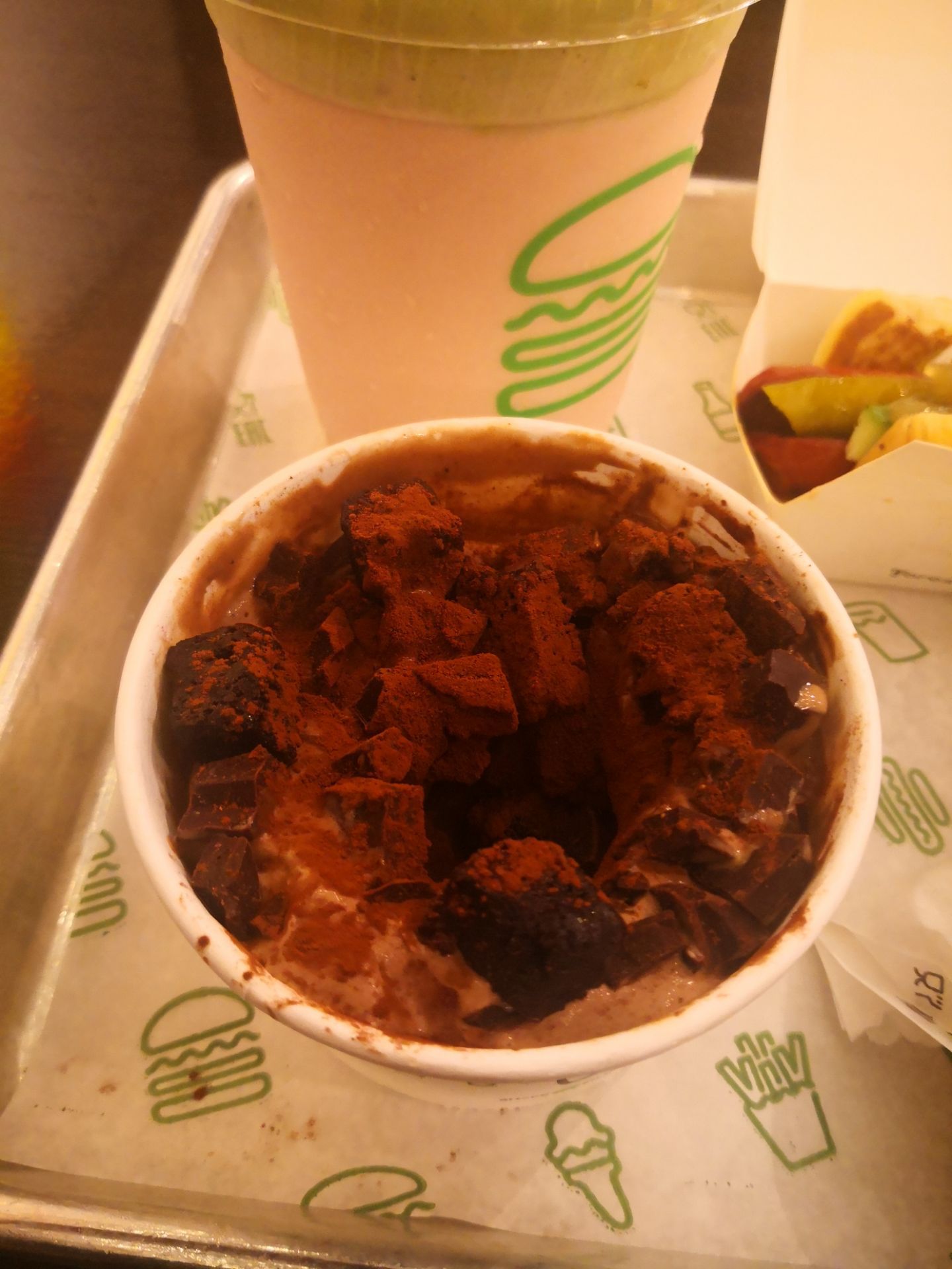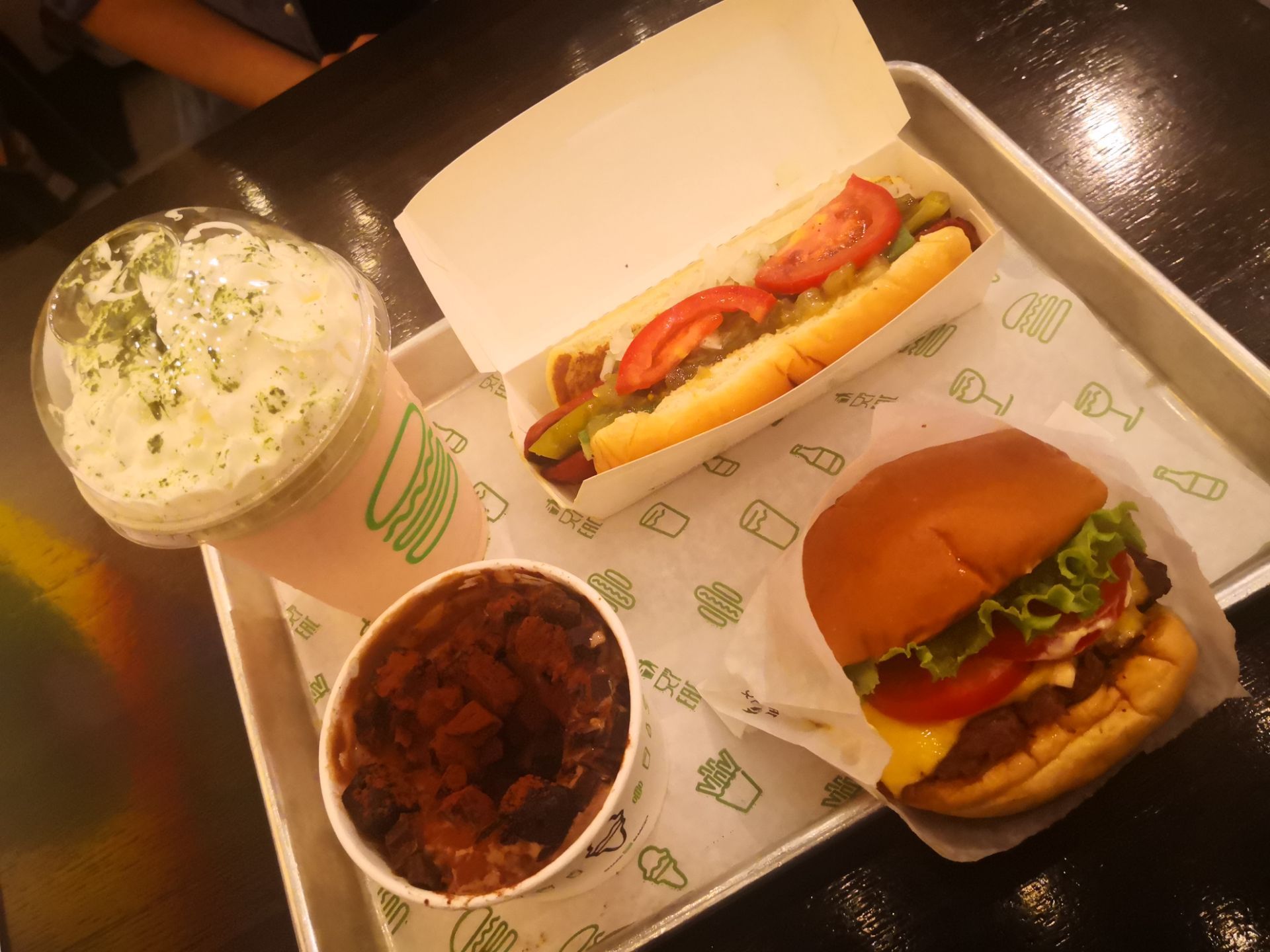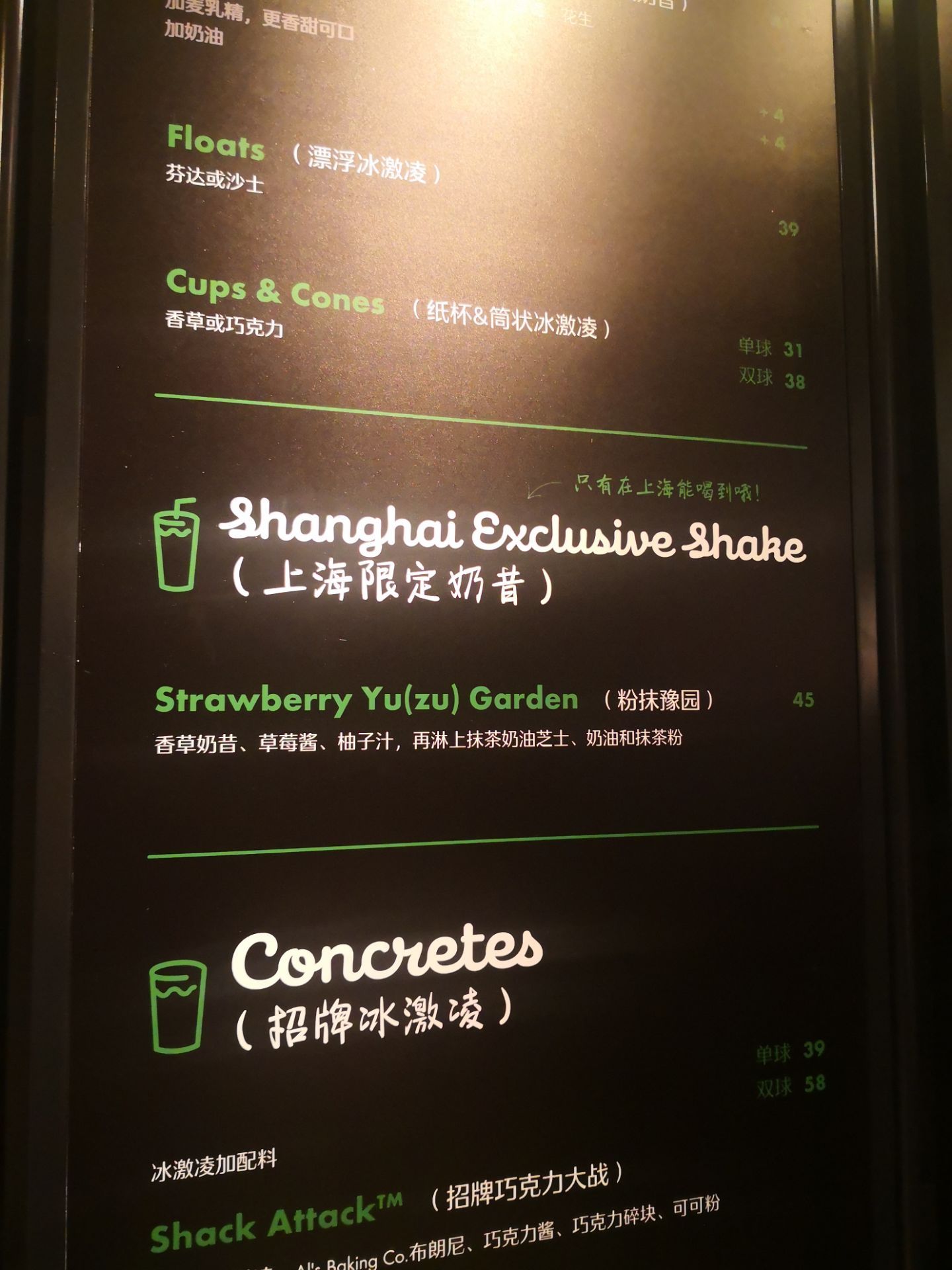 shake shake 嘉里中心开了第二家分店,这里生意真的也很好,不愧是网红汉堡啊,晚上去吃的,依然人很多,上海限定奶昔粉抹余元,这个是香草奶昔、草莓酱柚子汁,再抹上抹茶奶油芝士,奶油和抹茶粉,味道有点奇怪,哈哈,还是巧克力的好吃!