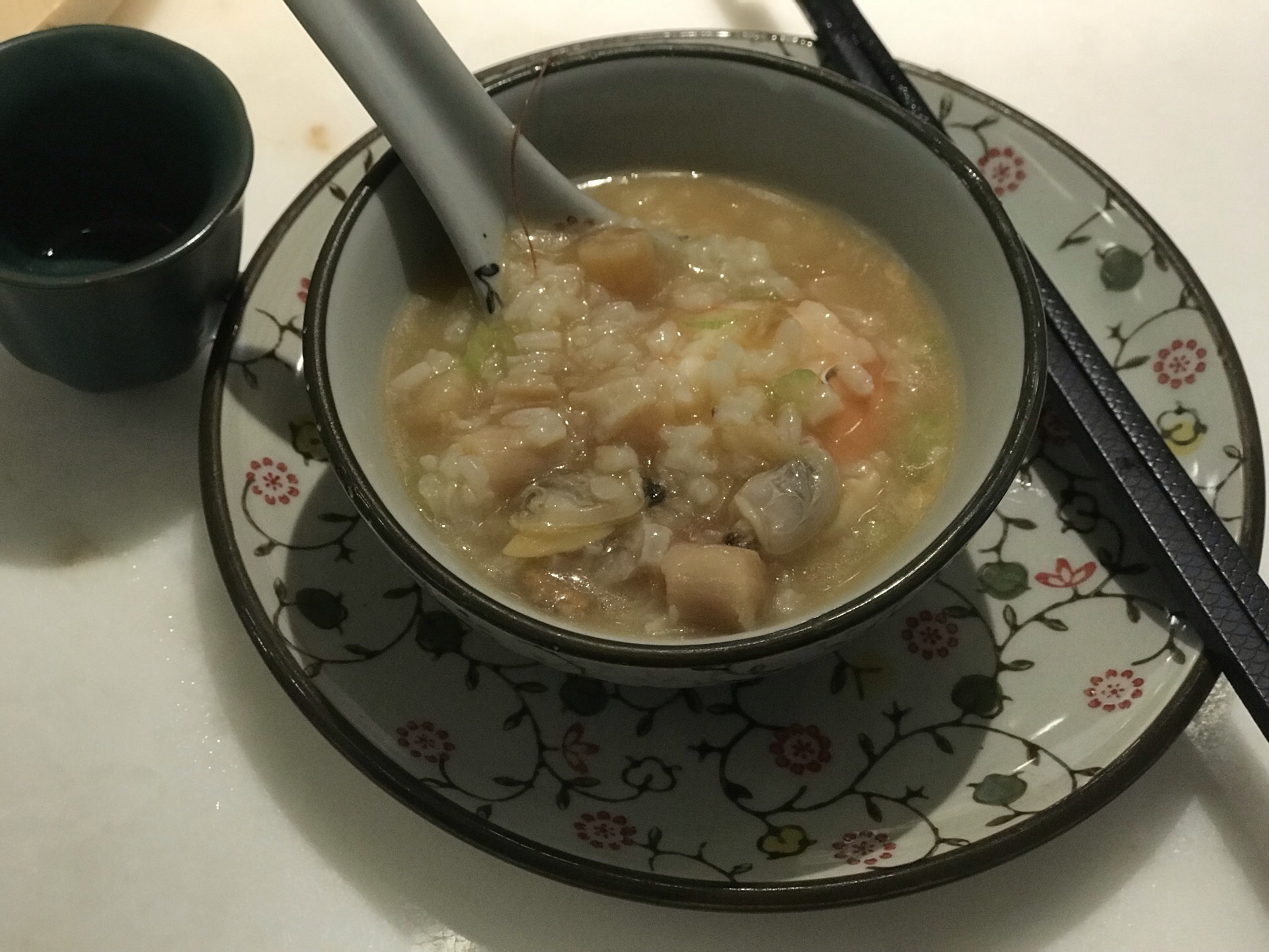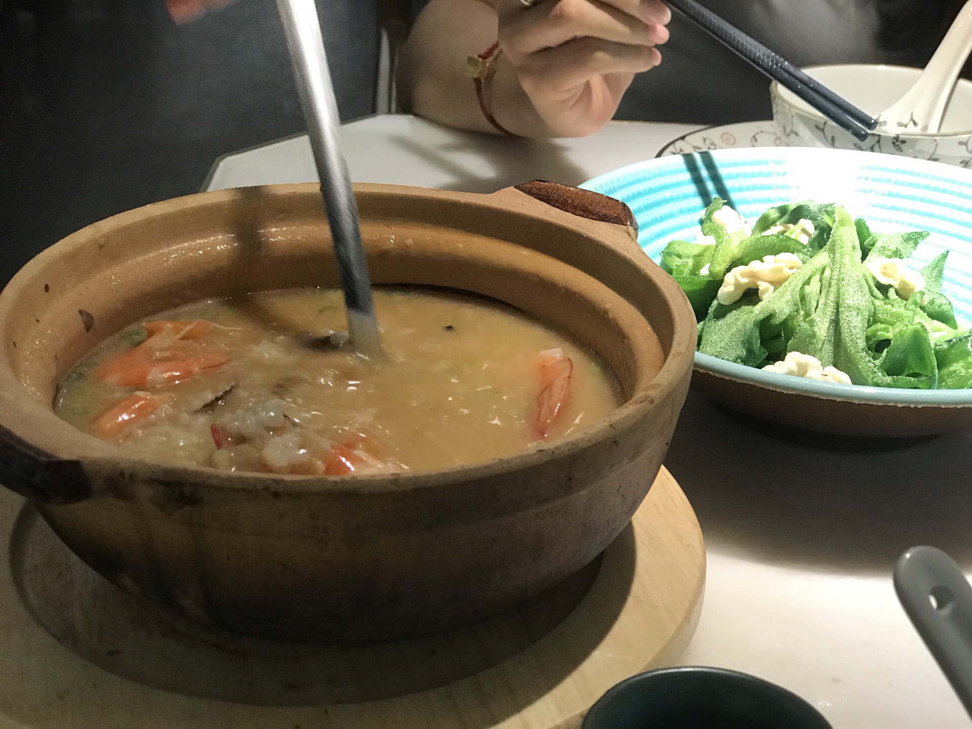 砂锅海鲜粥特别鲜美 大块的虾仁和瑶柱 非常适合养胃 冰菜中的核桃是生核桃 越吃越香 拌着芥末 ...环境淡雅 服务好 两人二人餐 砂锅海鲜粥特别鲜美 大块的虾仁和瑶柱 非常适合养胃 冰菜中的核桃是生核桃 越吃越香 拌着芥末 味道特别吧 甜点一般 牛肉丸子量挺足的