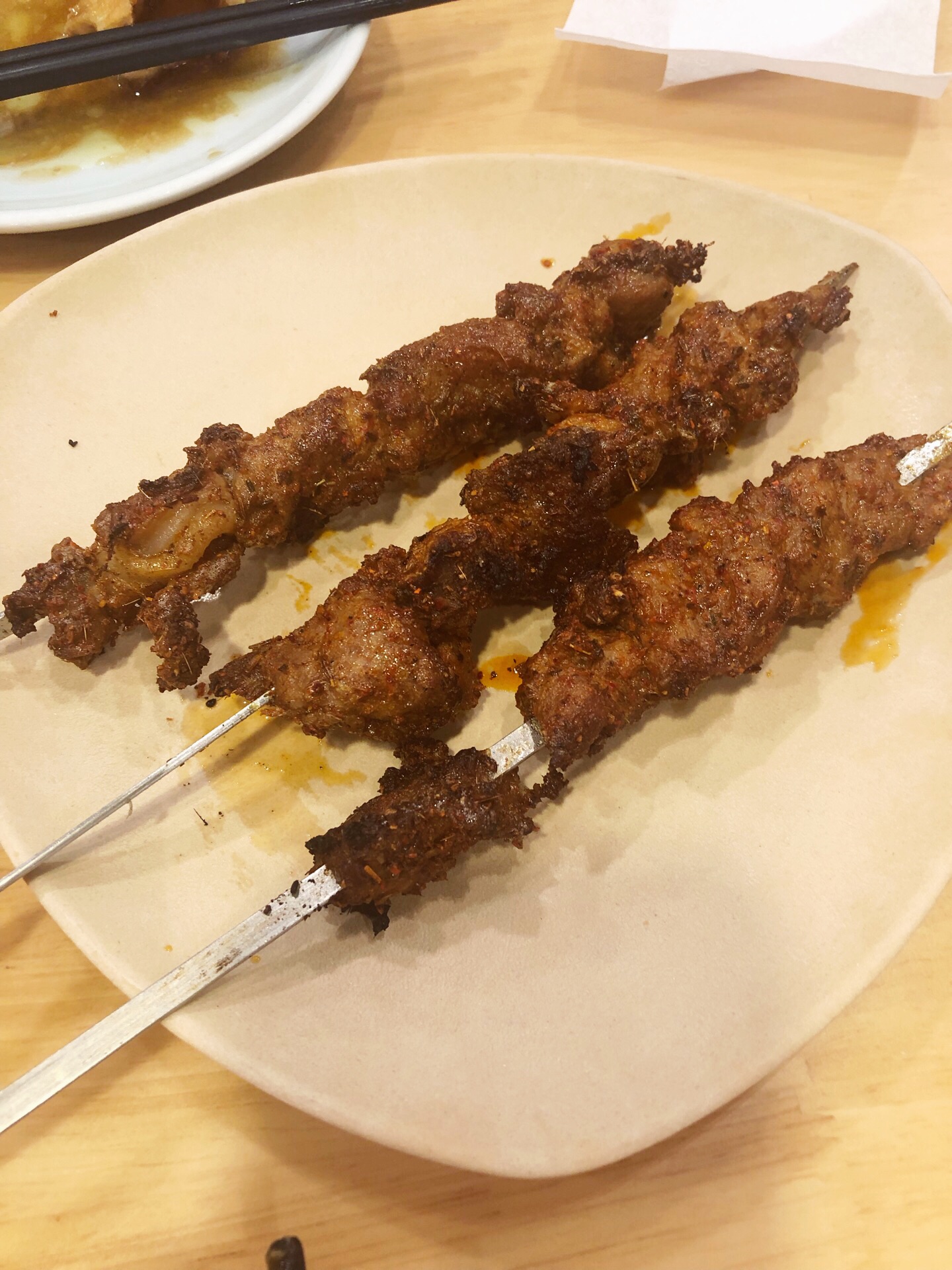 和老公俩人吃的,没有点炒菜,就点了一份门丁肉饼和电烤羊肉串。门丁肉饼的味道真的很赞,皮薄馅大牛肉馅也很新鲜,咸淡合适,肉饼也是现吃现烙,上来时服务员大姐会很贴心的提醒小心咬里面有汁儿,别烫到。羊肉串吗味道一般肉净是些筋头巴脑,10块钱一串价格略贵。还是非常推荐他家门丁的