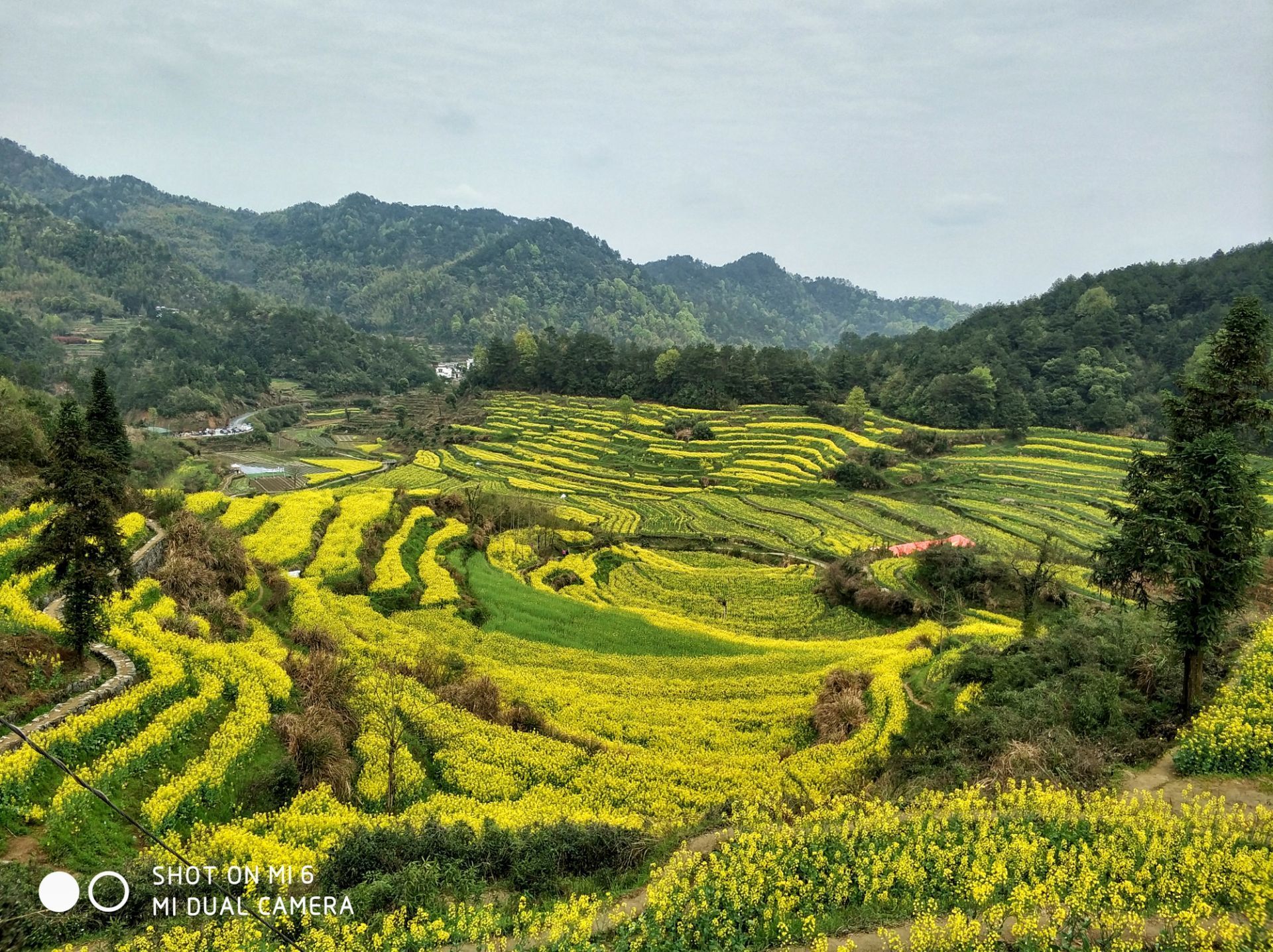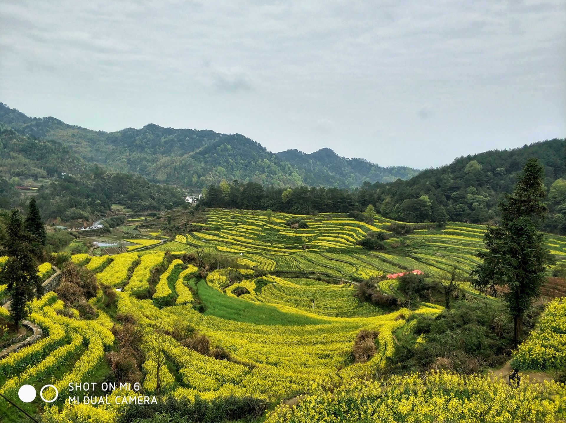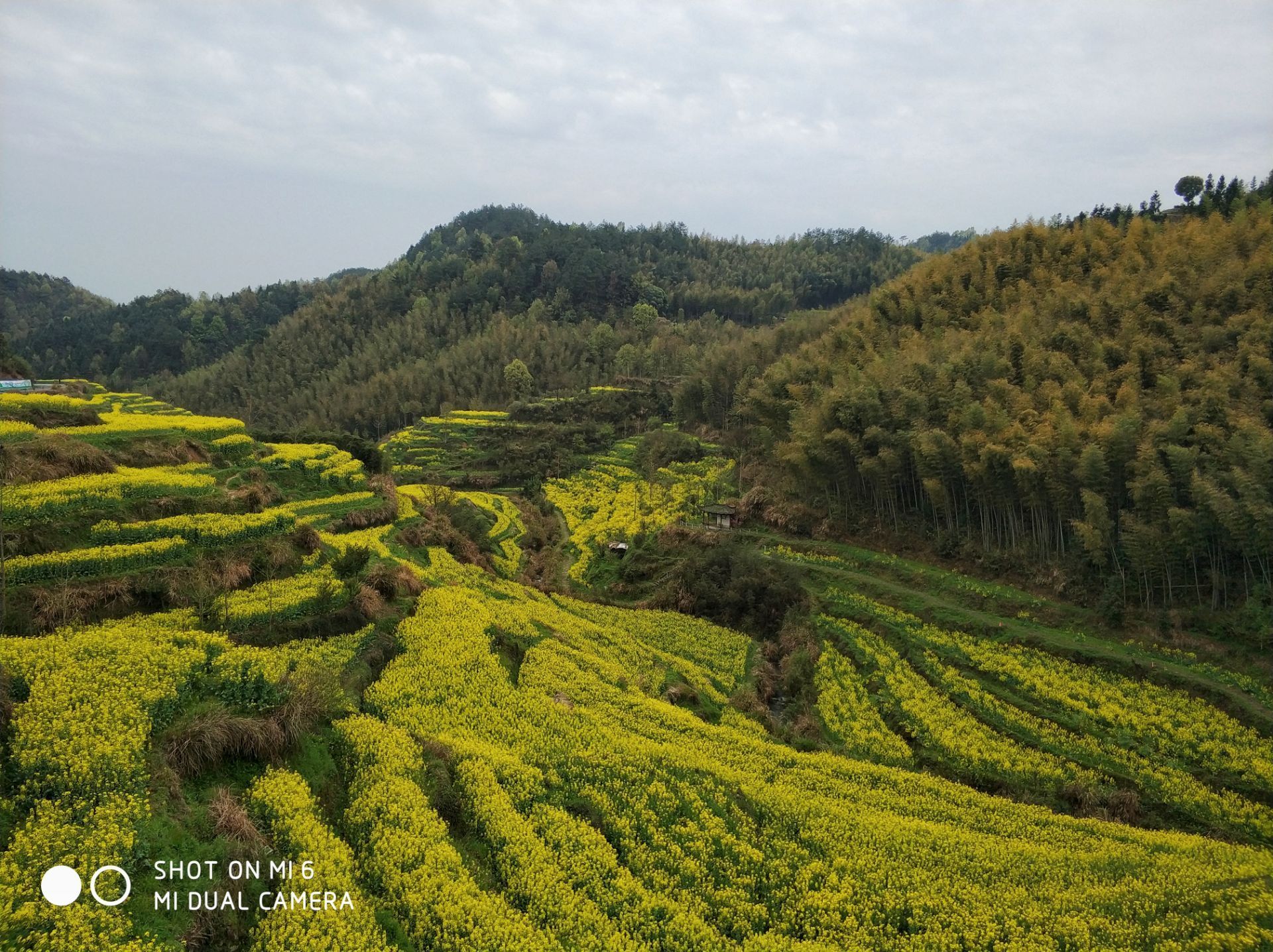 在皖南黄山市徽州区呈坎镇境内隐藏着一个叫灵山的地方,山坳里的油菜花、梯田半腰上的桃花、和远处的粉墙黛瓦,构成了一派田园牧歌的美丽景象。这里保存完整的明代古梯田一千亩,竹海三千亩,自然景观独特,生态环境绝佳。