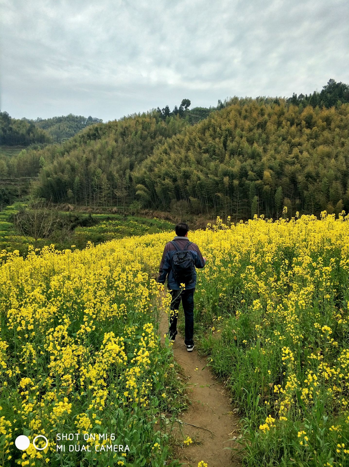 ...叫灵山的地方,山坳里的油菜花、梯田半腰上的桃花、和远处的粉墙黛瓦,构成了一派田园牧歌的美丽景象