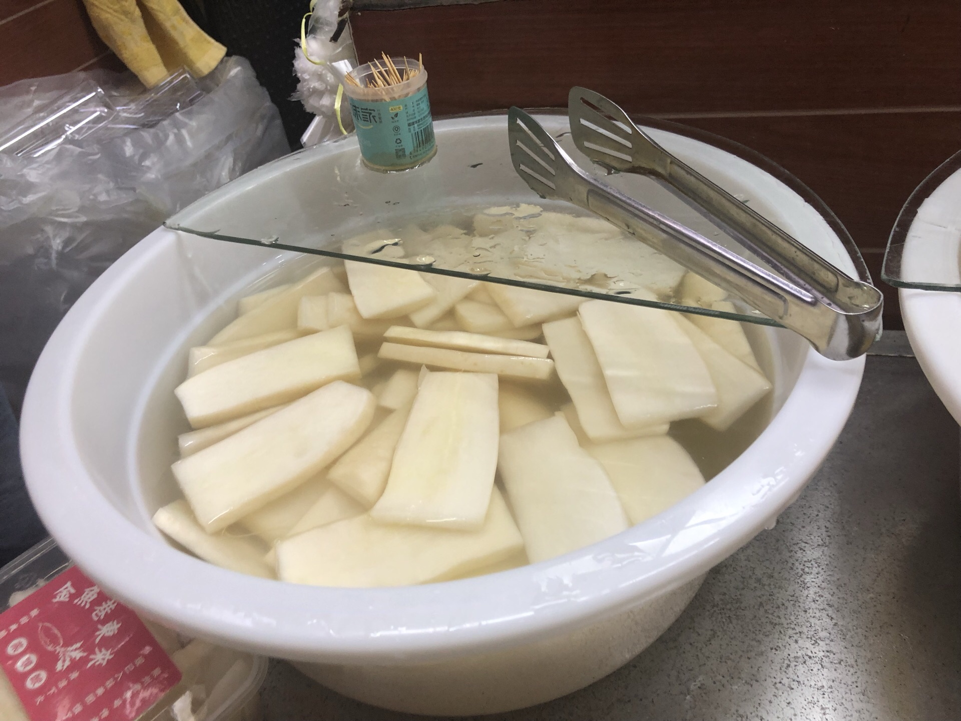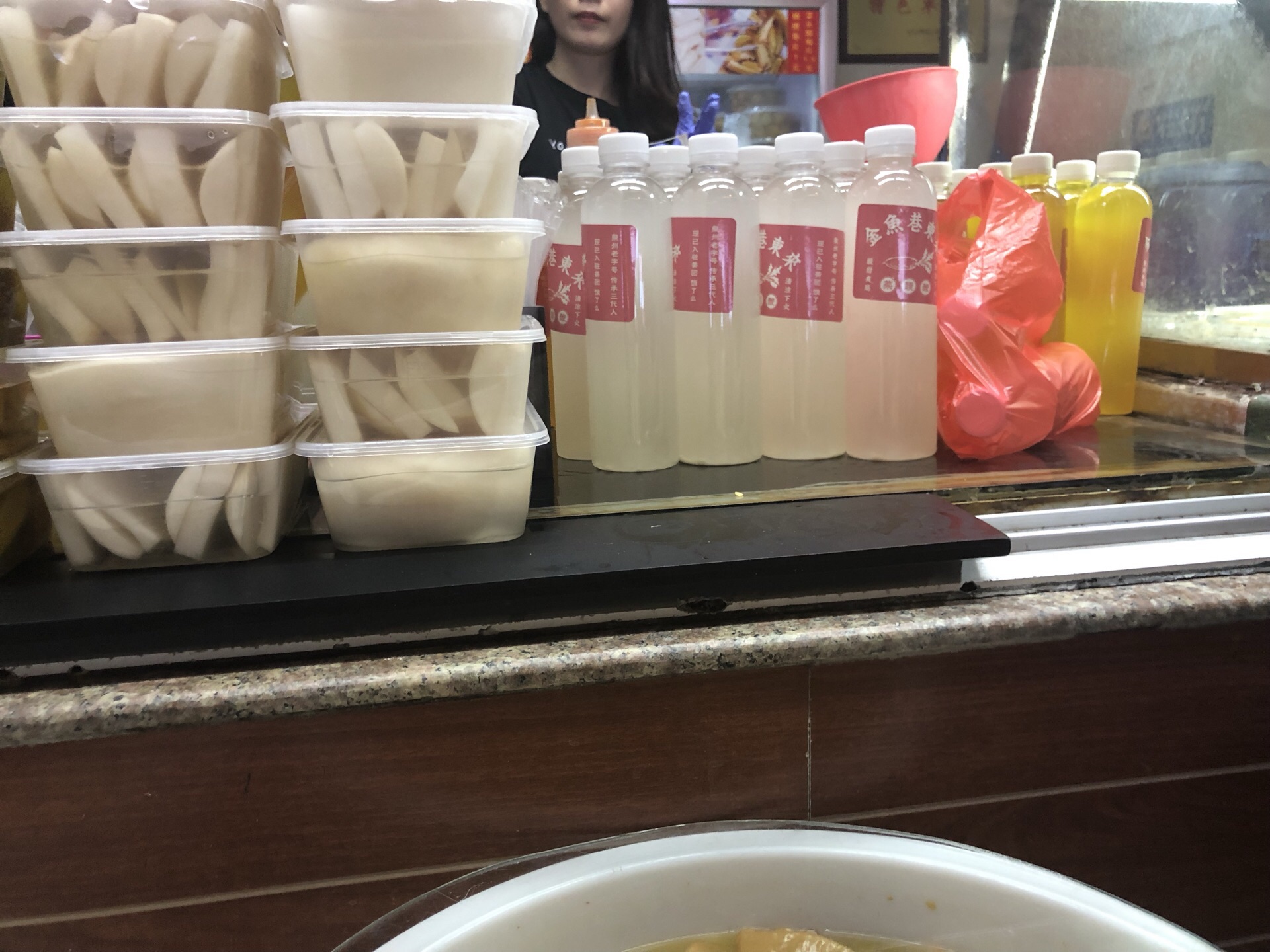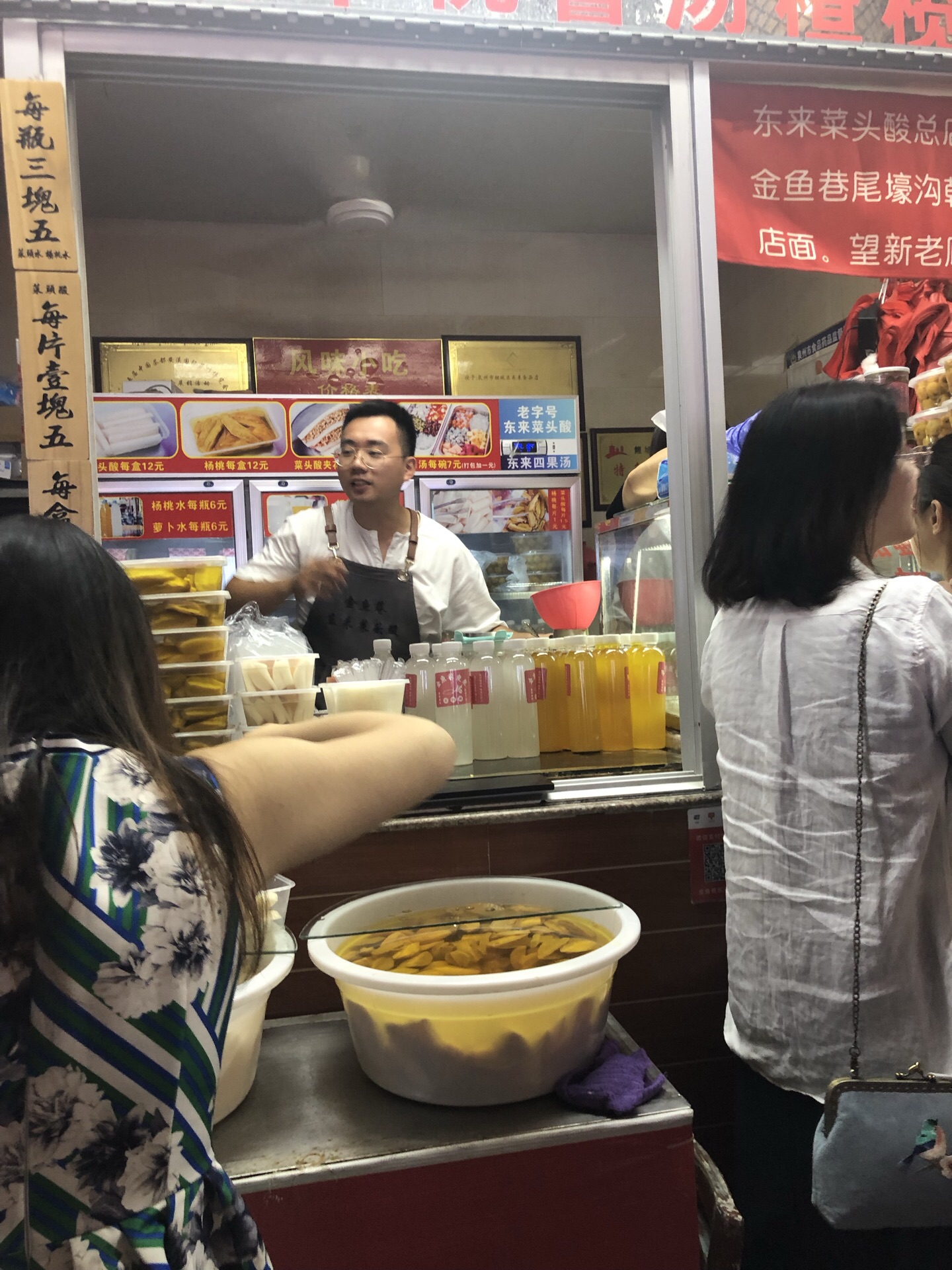 金鱼巷巷头巷尾各一家,靠近步行街的那头生意更好,另一头的人会少一点,点了网红吃法夹花生碎,确实还不错,爽口又香又脆。 看到好多人买那个水,我以为是萝卜汁和杨桃汁呢,就买了一瓶杨桃汁,打开一喝原来是腌的水,哈哈哈。请慎买。