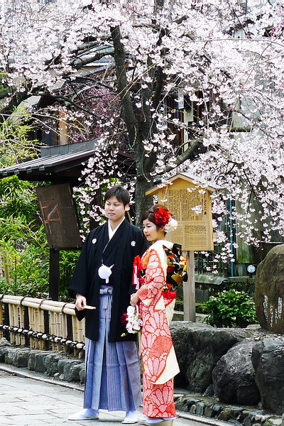 白川通,才真正置身樱花的海洋中。河边是小巧的传统居酒屋,坐在这里赏樱小酌,看窗外落花有意流水无情。这里的樱花品种很多,有些树很大,造型很漂亮。小河两边的房屋很古朴,偶尔会碰到化着艺妓妆的走过。日本人也挺喜欢来这里拍写真和婚纱等等。