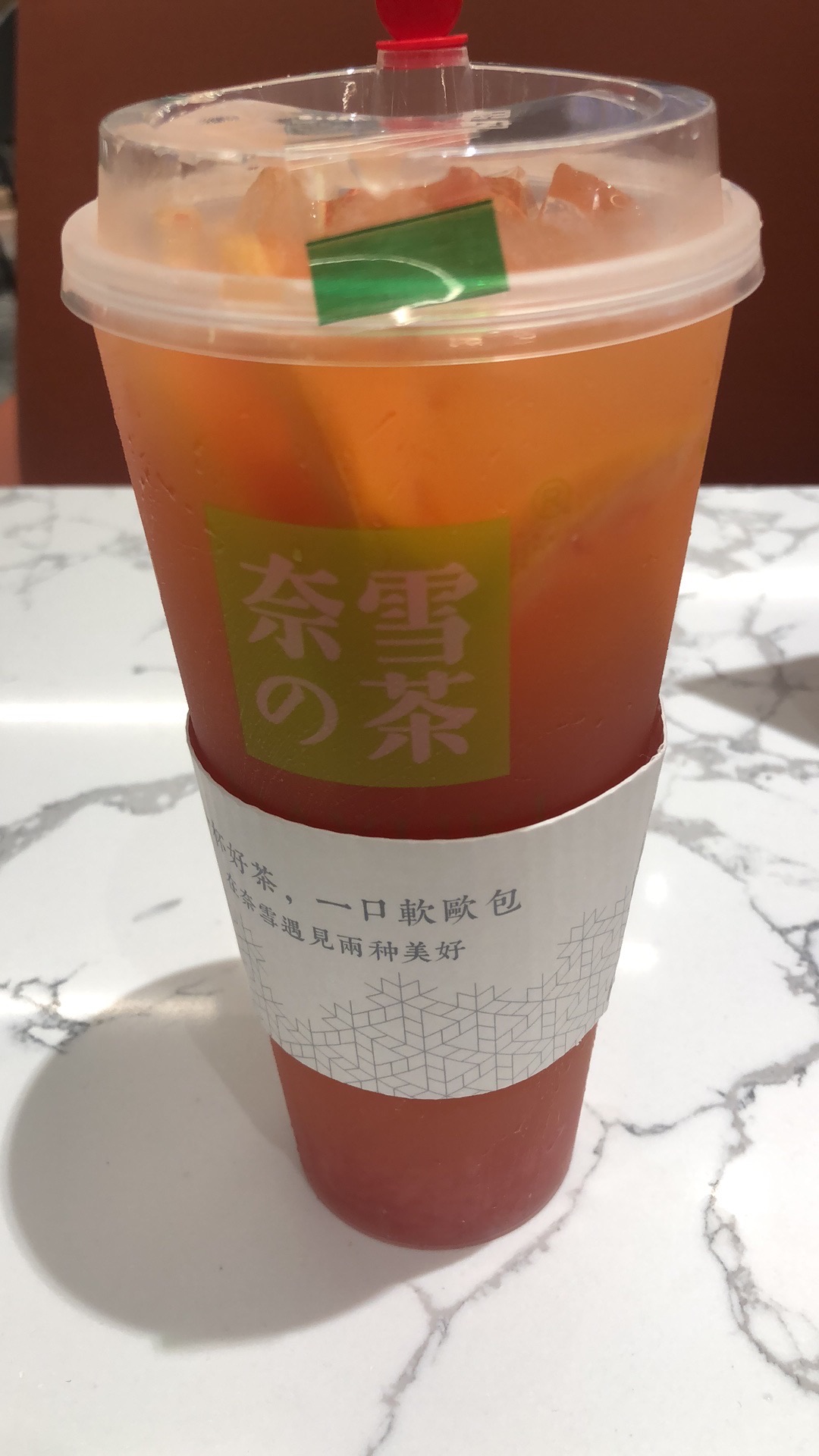 网友2019-10-19吃完火锅必须来一杯奶茶啊,一边叫着减肥,一边奶茶愉快的一杯接一杯,为了心里少点愧疚感,芝士不要...吃完火锅必须来一杯奶茶啊,一边叫着减肥,一边奶茶愉快的一杯接一杯,为了心里少点愧疚感,芝士不要了,糖少一点,来了杯霸气西柚,22元,跟某茶味道差不多,价格便宜了3块,水果茶果然还是要甜的才好喝!