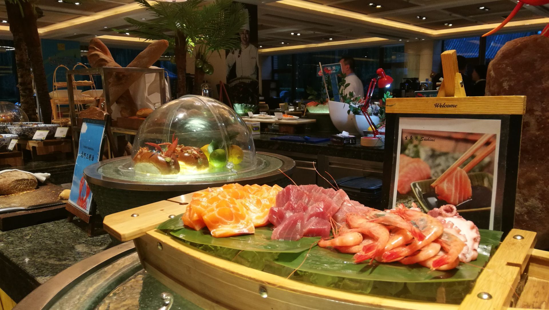 送的大闸蟹很好吃,服务很到位,还会带朋友过来吃。真心不错的一家餐厅,自助餐种类丰富,品种齐全真心不错的一家餐厅,自助餐种类丰富,品种齐全。龙虾不限量,各种沙拉色味俱全,意大利的冰淇淋也很好吃,印度菜很有特色。送的大闸蟹很好吃,服务很到位,还会带朋友过来吃。