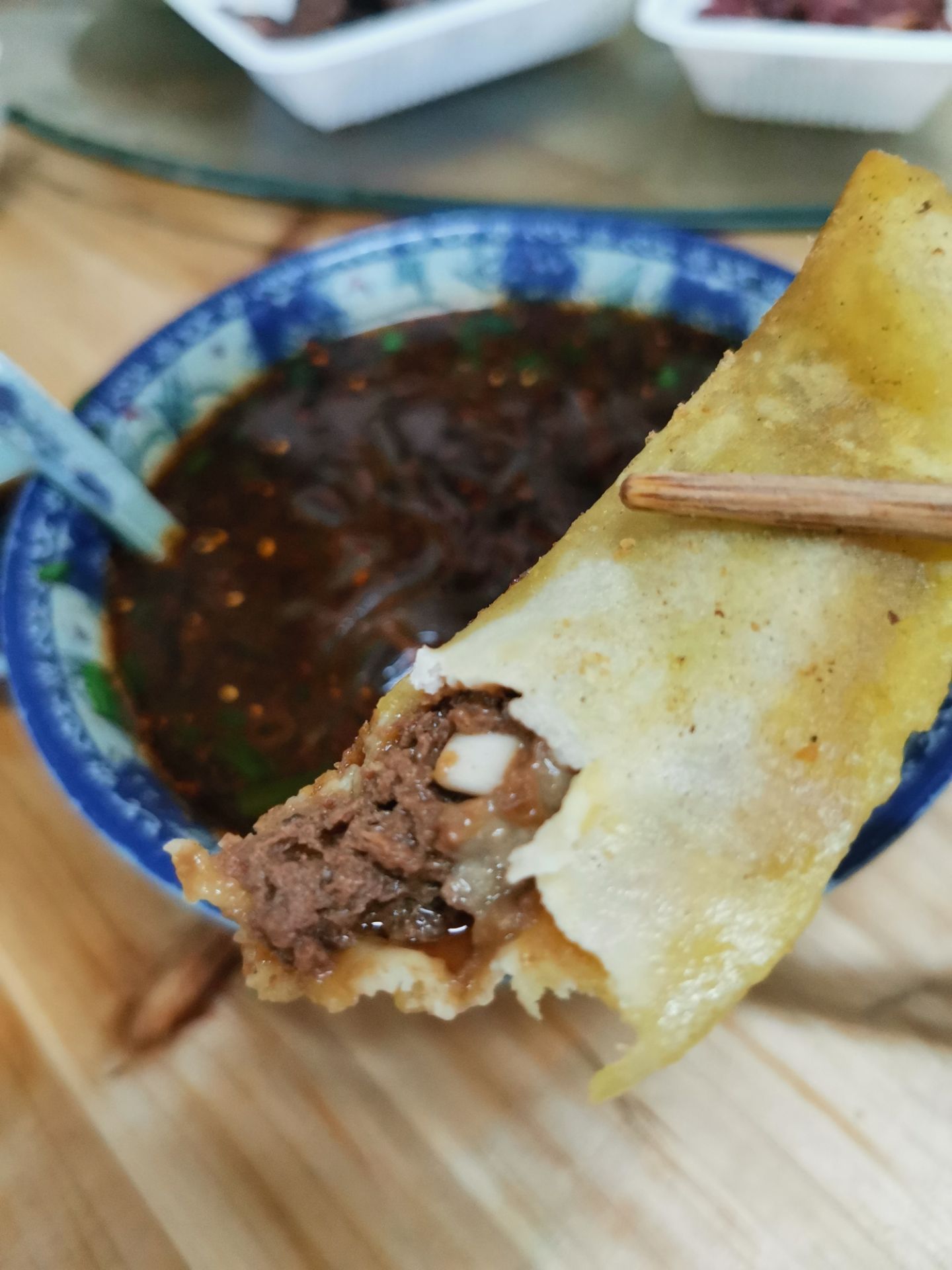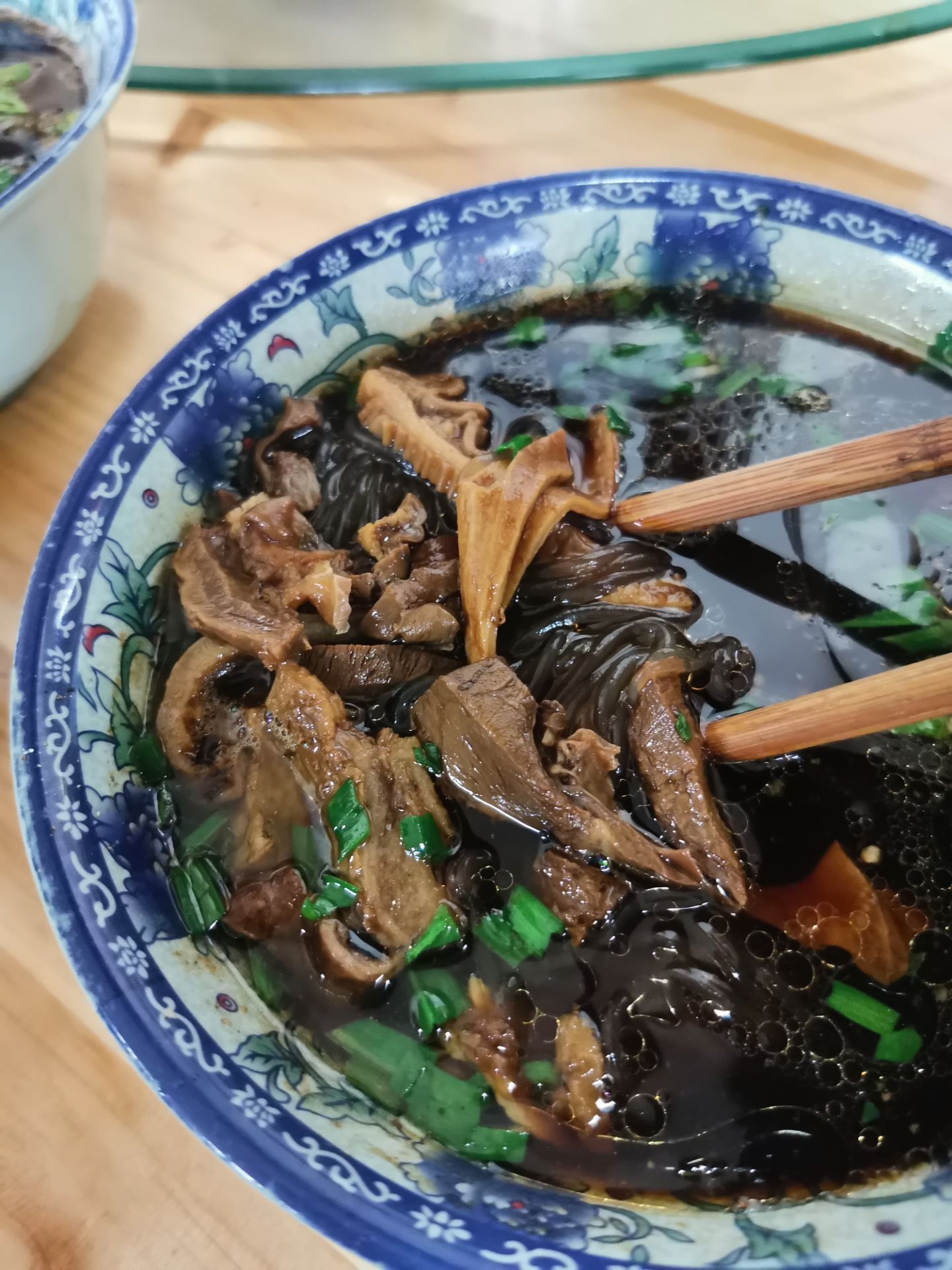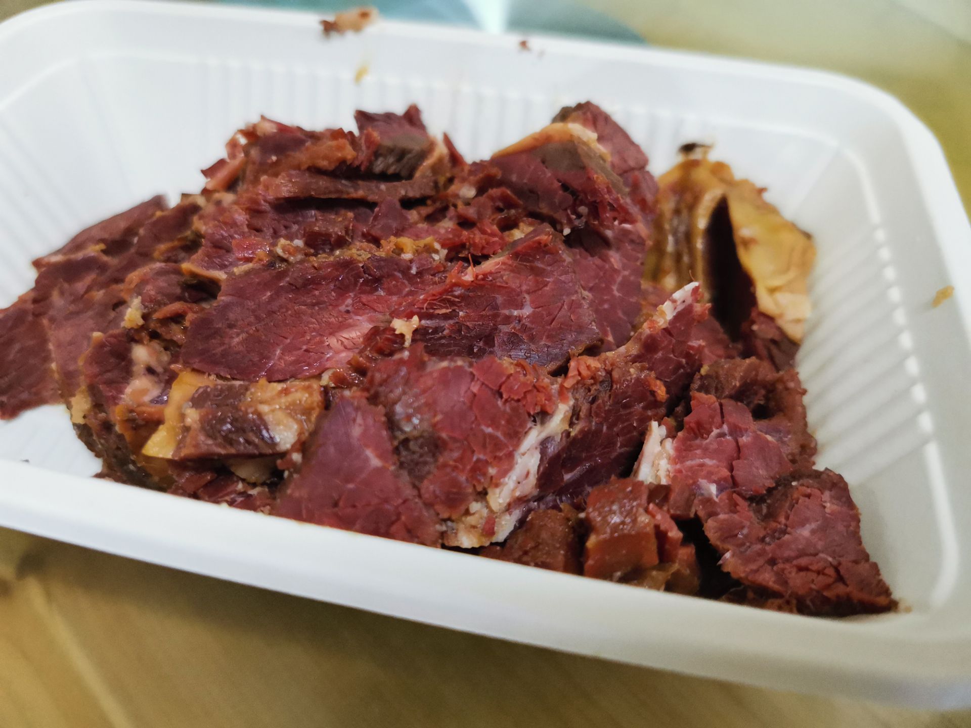 牛杂粉丝汤,汤是荤汤,油亮暗红,美味无比,牛杂软糯入味,粉丝爽滑,完美。 熏牛肉,口感口味均上佳