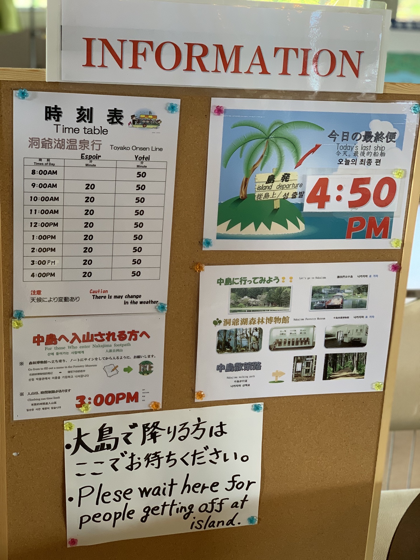 住店客人向酒店前台索要洞爷湖游览船票的优惠券 节省150日元左右住店客人向酒店前台索要洞爷湖游览船票的优惠券 节省150日元左右。游湖接驳船从洞爷湖温泉街出发 停靠在湖中心洞爷湖公园 游客在园里随意游玩 接驳船返回温泉街的时间可见下图。