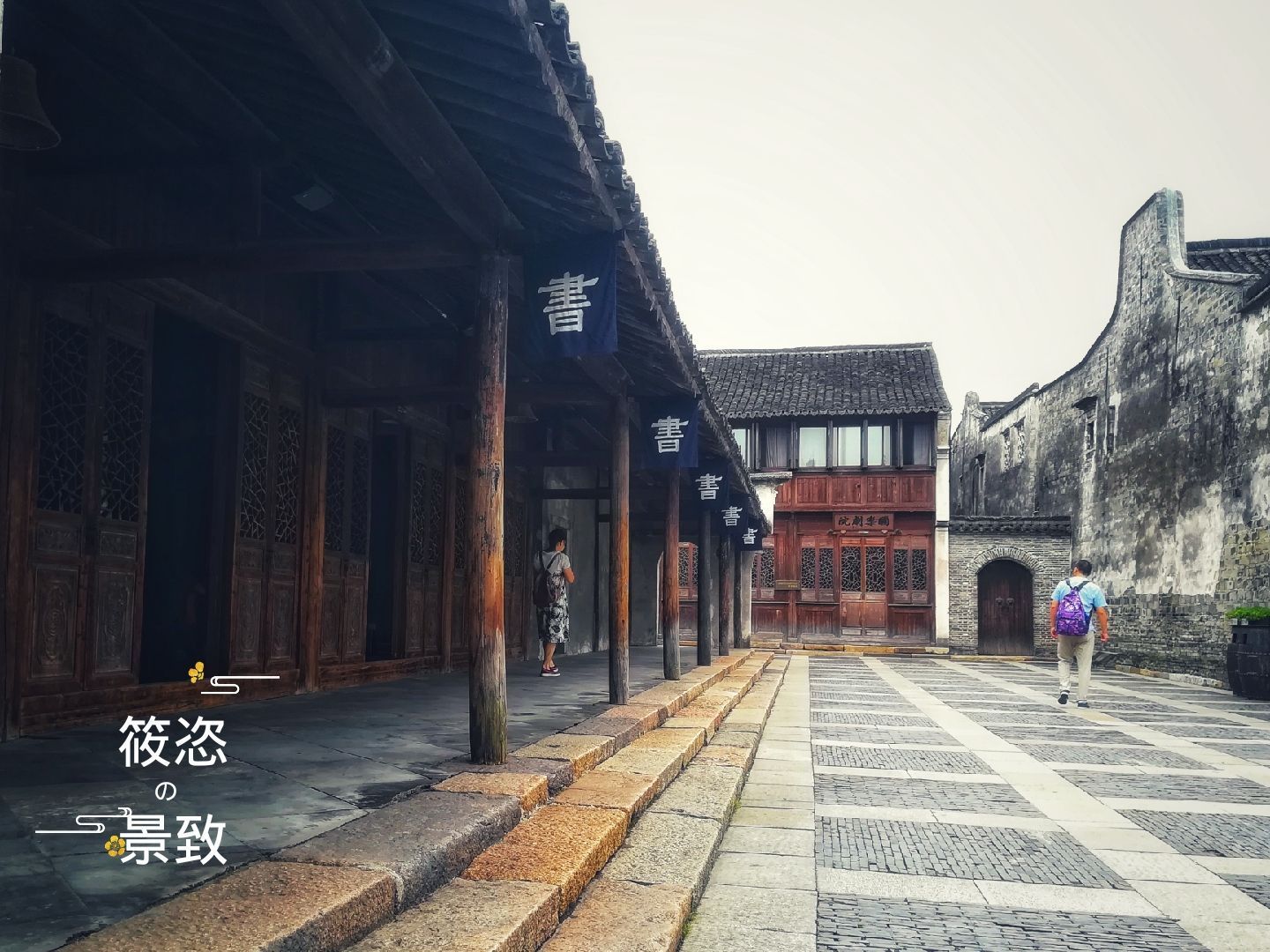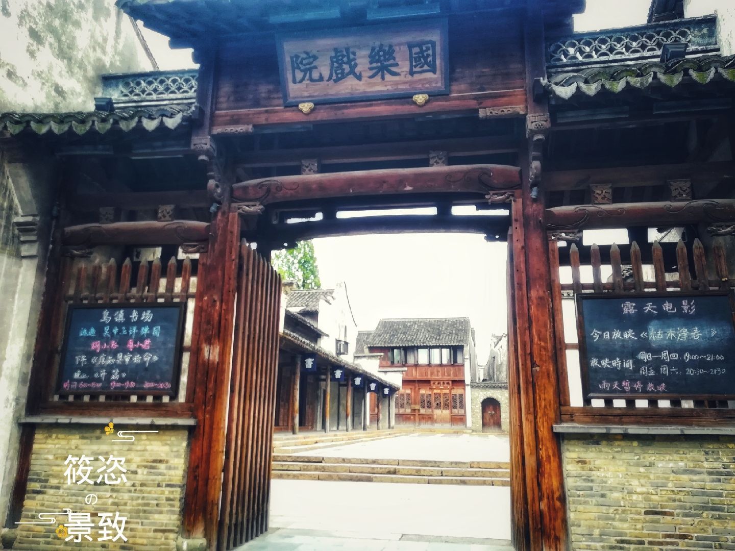 国乐剧院也叫"水上戏院",在这里可以听评弹,还有露天电影播放。剧院门前的小黑板上有节目单和放映时间。在河对岸的观众席上遥望这里还是挺萧条荒芜的,但是近距离的走近这里却很有人气,虽然两个地点观看的是同一景观,但是心气上却完全不一样。
