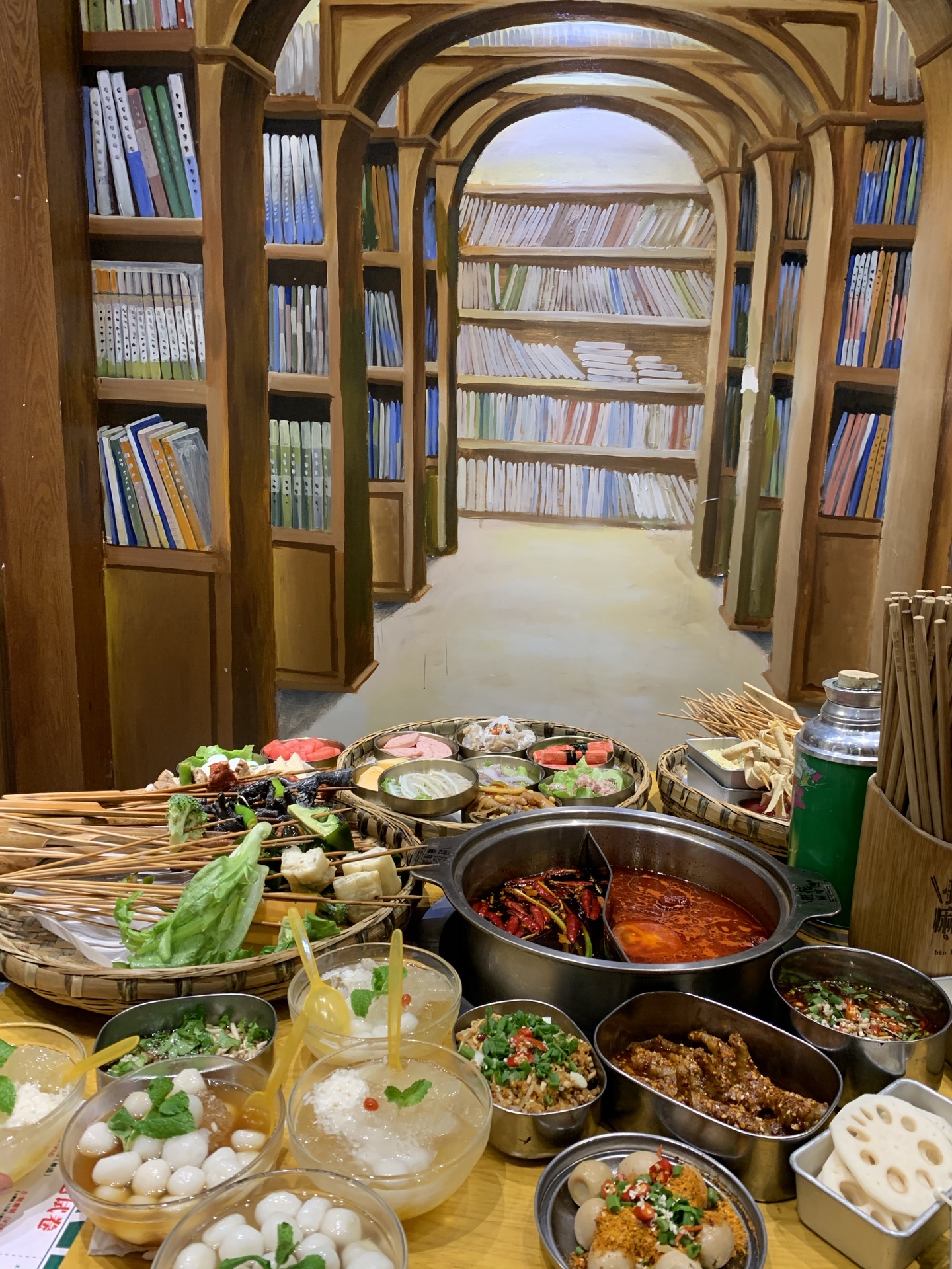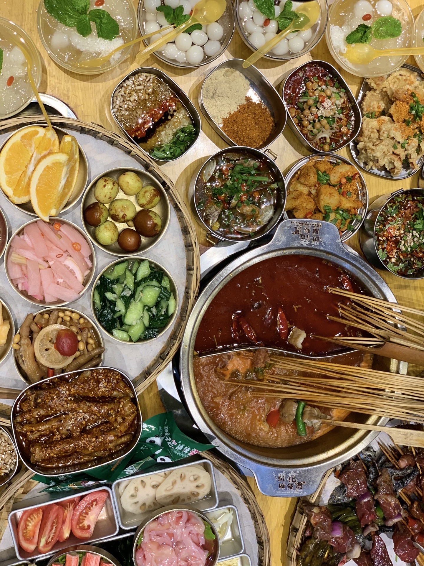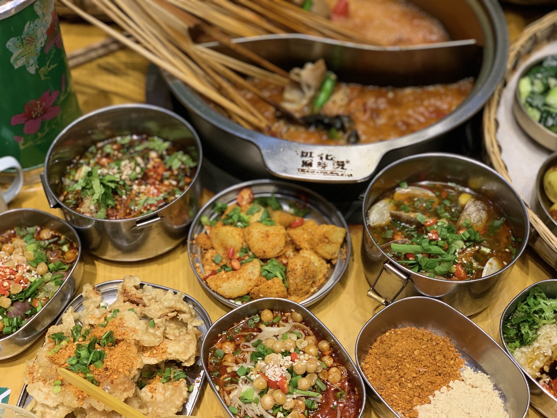 班花麻辣烫,虽说卖的主要是串串香,但是各种小吃和碗碗冒菜款式特别多,味道都各有特色,好吃得此起彼伏的。地理位置好,本地老饕和外地游客都纷纷前来打卡,生意好得店员都快飞起来了。如果有外地亲朋来成都旅游,建议带着来尝尝这家,吃完逛逛春熙路、太古里,吃喝玩乐一站式满足。 ------- 餐厅环境 ------- 作为一家优秀的主题麻辣烫,餐厅整个是怀旧的青春主题风格,大厅、包间被划分为不同的区域,有图书馆、自习室、音乐教室等等,真实还原我们当年的青葱岁月。 ------- 餐厅服务 -------- 小哥哥小姐姐们都身穿统一校服,一脸的青春洋溢,笑盈盈的面对客户,就跟年少时的同班同学一样亲切可爱。 -------- 菜品推荐 -------- 【串串】 保鲜柜里的荤菜、素菜整整齐齐的摆放着,每一串都大坨大坨的很扎实,新鲜得很。 喜欢什么就可以拿两串试试,没吃过的也可以随意拿来尝尝,这就是串串的优势所在。 人多人少都可以吃得很满足,想吃什么拿什么,吃多少拿多少,也不会浪费。 “笋子牛肉”嫩气的牛肉裹着一节笋子,不同的脆嫩口感,口感很饱满; “小番茄牛肉”这个是小亚第一次吃到,牛肉片里面裹得是小番茄哟,很好吃的娇嫩多汁; “黑胡椒牛肉”特别粗的一根签子穿着,牛肉坨坨也很霸气,一口吃一个那种,特满足; “苹果牛肉”哈哈,苹果块儿裹在牛肉里面哟,果味的酸甜可以综合锅底的油腻,刚刚好; “黄辣丁”一串并排穿着,鱼儿很肥,肉很厚,熟了一口就抿得干干净净的,巴适! “卤肥肠”肥肠切得很长一段,大粗签子穿着,一根抵以前的小签子五根,超过瘾的。 ……….. 好吃的菜品实在是太多了,列不完,个人口味也有差异,请自己去寻宝。 【秘制鸡爪】6元 铁皮老式饭盒装着的肥鸡爪,香香糯糯的鸡爪子,入口一抿就稀溜耙,根本不需要啃的呀。 看起来辣椒有点多,但是根本不太辣的哈,只是特别香而已。 一盒有3根,我一个人分分钟解决干净了。 【兔头】 它一定是我这辈子吃过最耙最好啃的兔头,真的是用手就可以把兔头轻松肢解,一点儿不费劲儿。兔头裹着厚厚的调料和花生碎,吃完还不忘舔舔手指头。哈哈。 【干拌火锅面】6元 方便面在火锅底料里烫煮,捞起,加入调味料再干拌,请自行脑补这活色生香的重口味场面。 一上桌就被哄抢一空,果断又加点了2份。 【最强大脑】15元 软糯可口,特别吸味的冒脑花