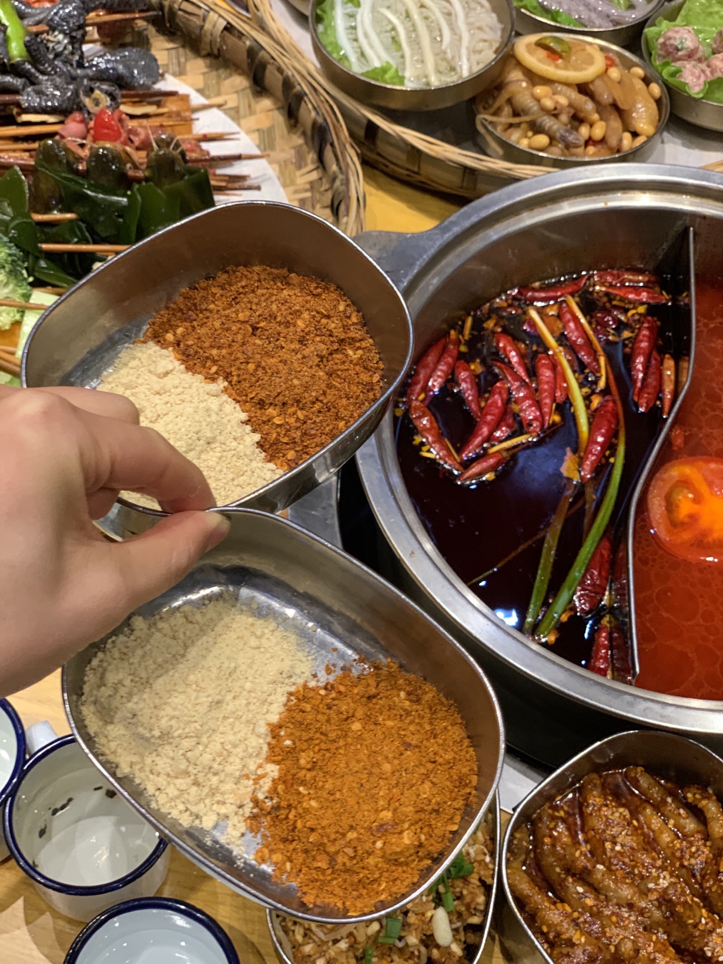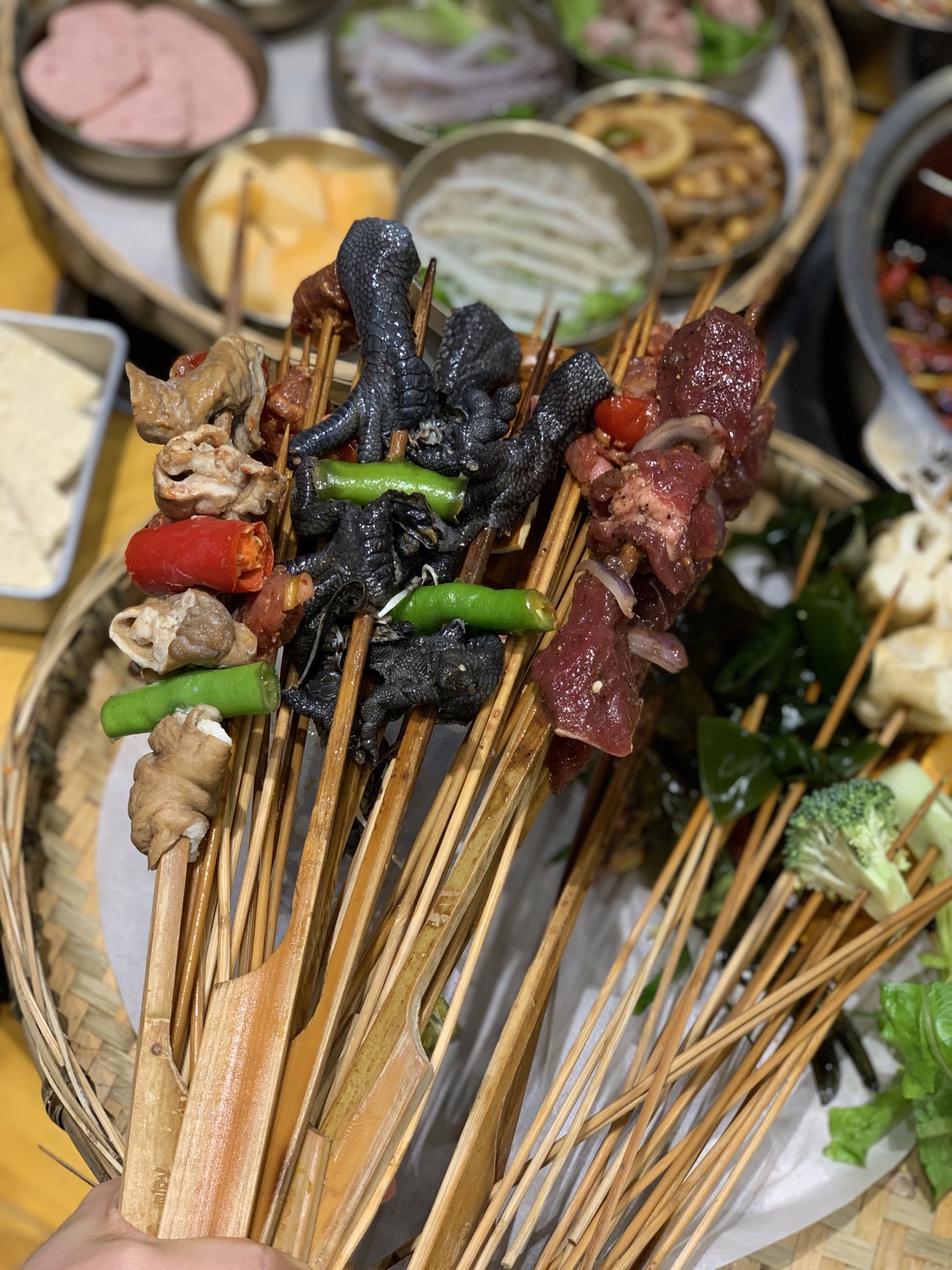 -------- 菜品推荐 -------- 【串串】 保鲜柜里的荤菜、素菜整整齐齐的摆放着...
