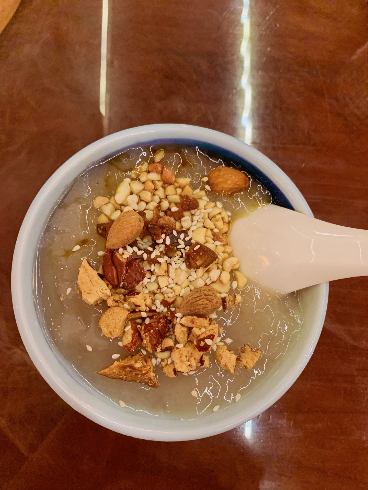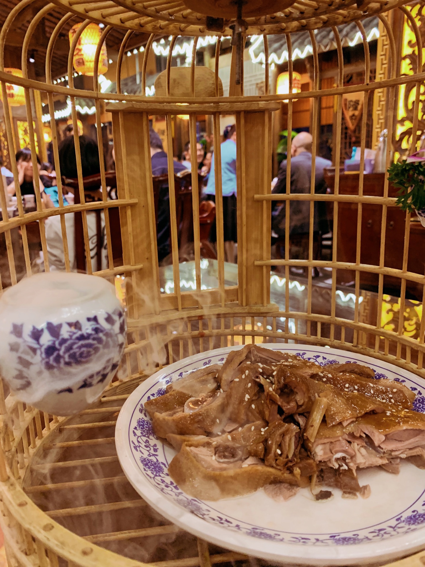 非常正宗的卤味,鹅肉紧实,越嚼越香卤鹅的出场非常吸睛,竟然是装在鸟笼子里的,笼边还挂了一个装着干冰的小瓷瓶,自带仙气。非常正宗的卤味,鹅肉紧实,越嚼越香! 在砂锅中滋滋作响的生煎菜心,香气扑鼻,菜心很嫩,没有咬不断的老叶。