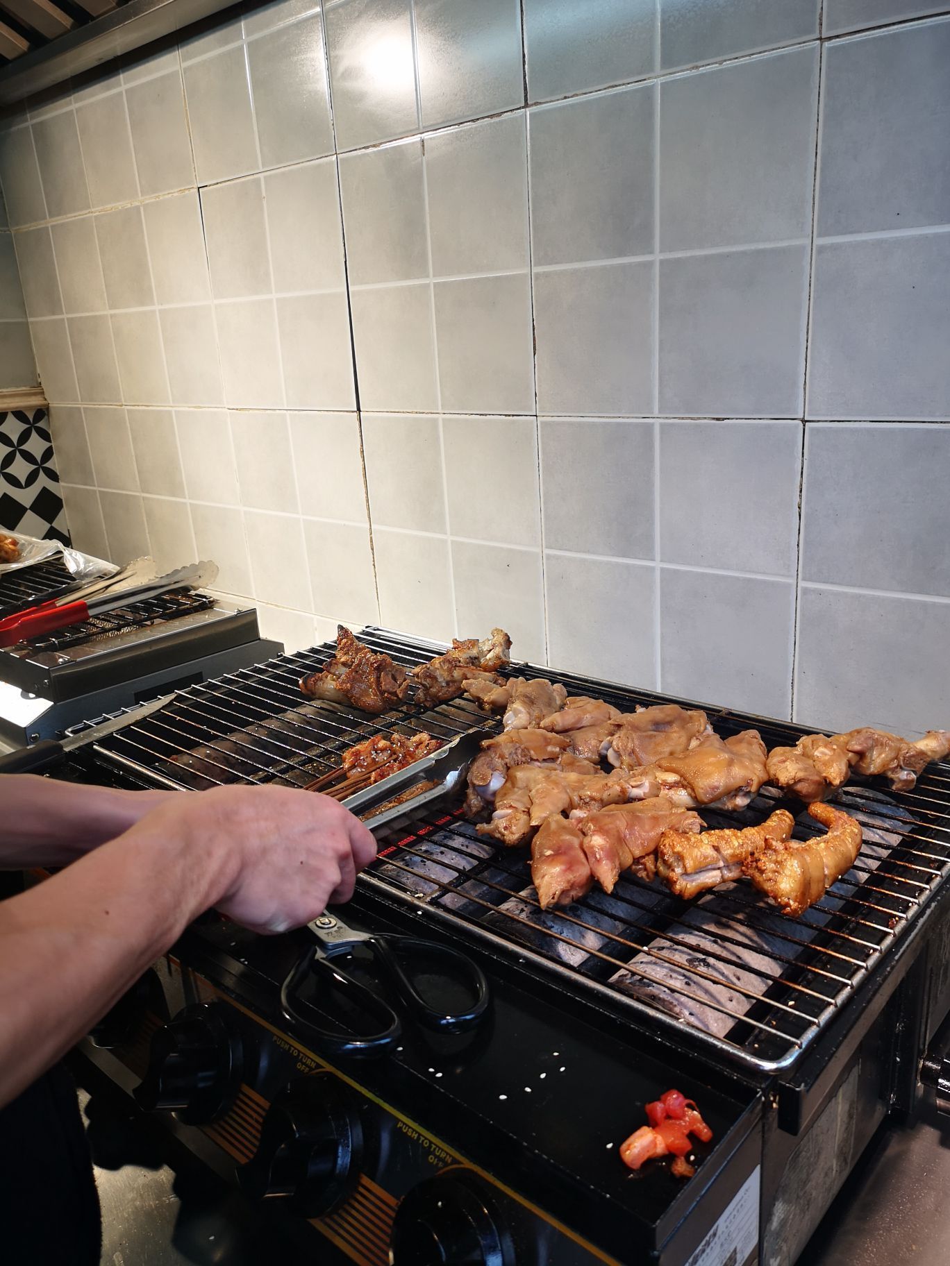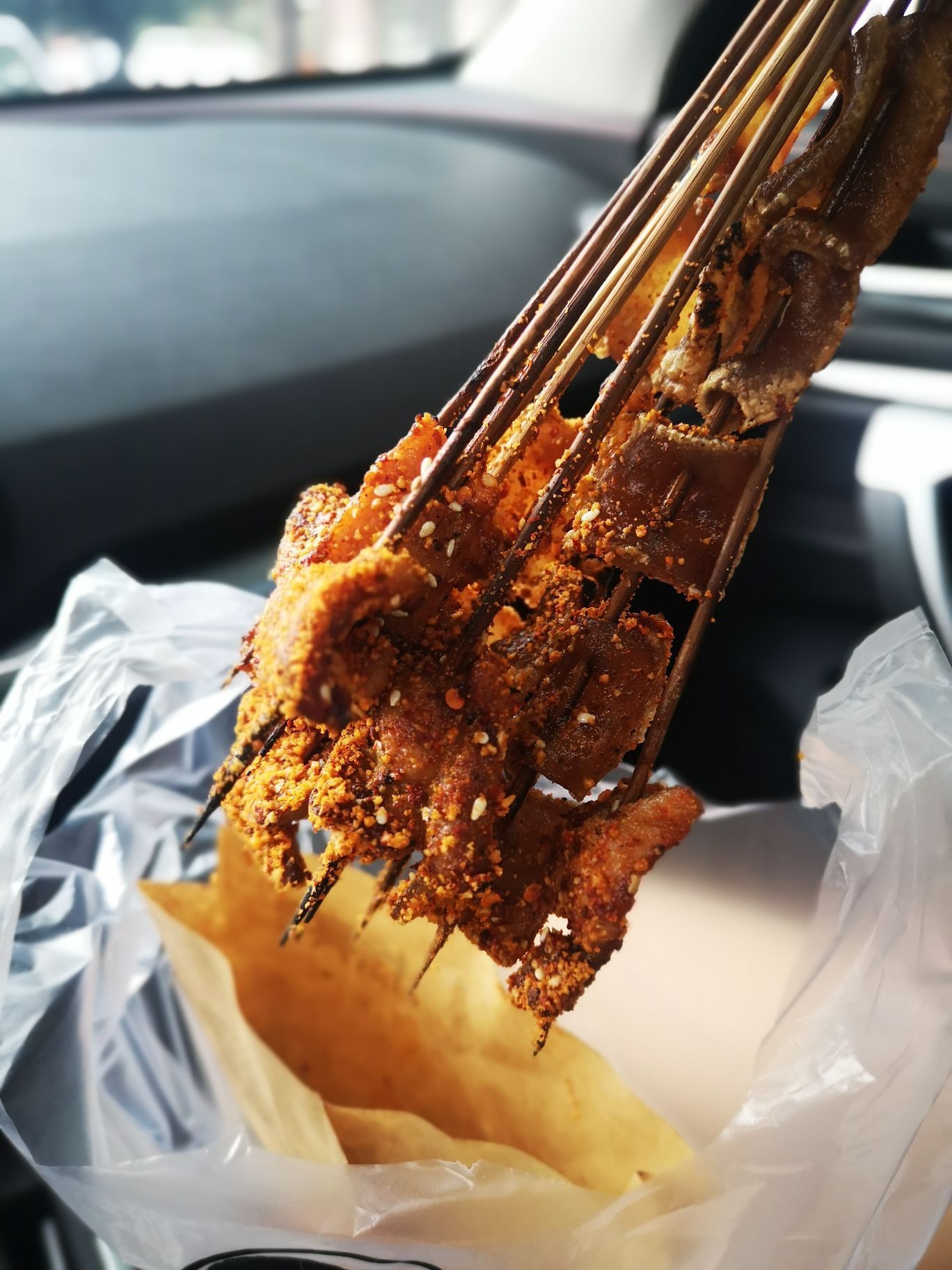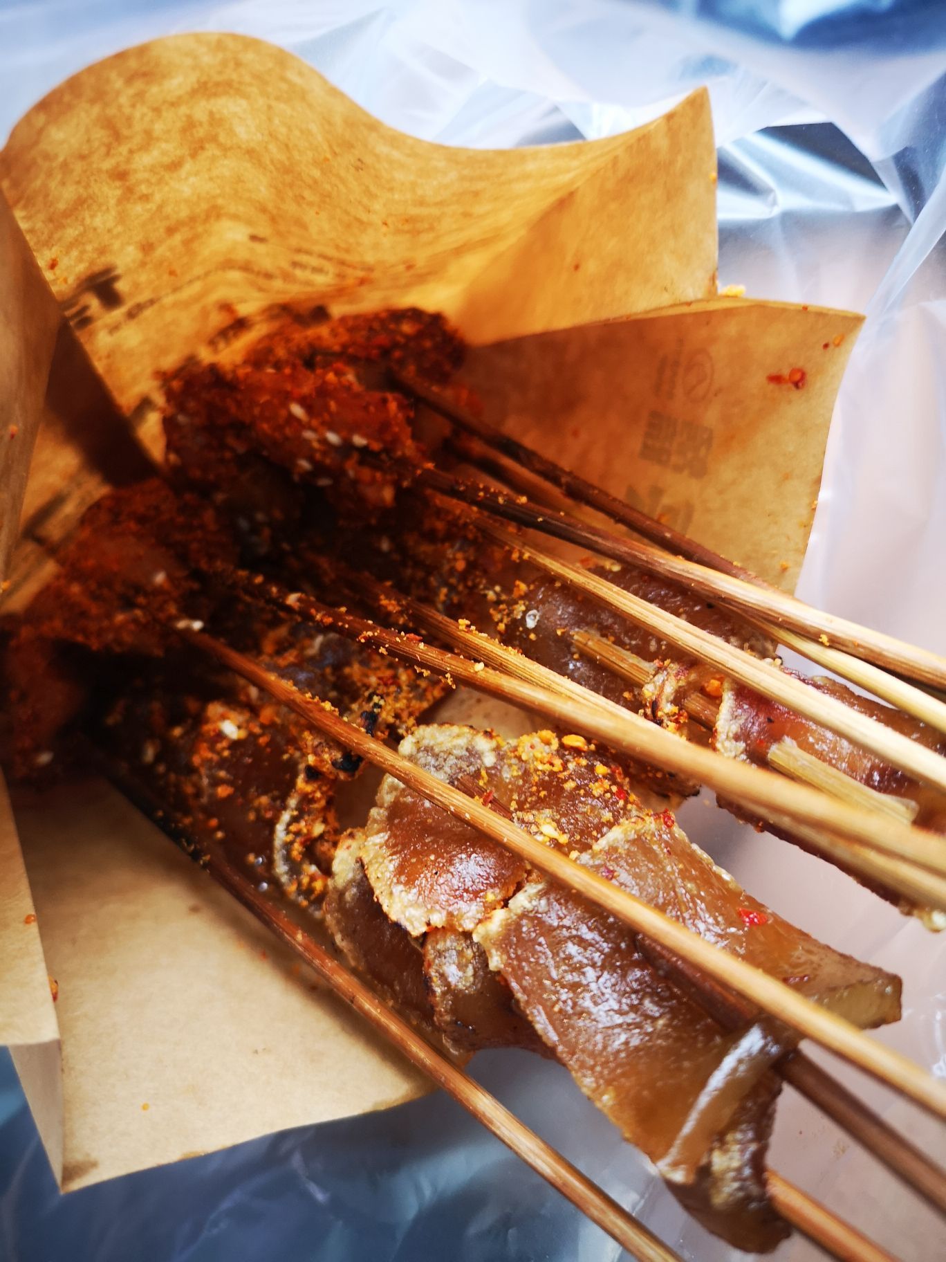 这家店在建设路小吃街也挺多年了,以前生意好的不得了,排很长的队,现在可能是吃的选择太多了吧,排队人没那么多了。买了一份把把烧和猪皮。把把烧挺好吃的,佐料也到位,刚烤出来吃着很香。猪皮要吐一下槽,刚刚烤出来还勉强能吃,虽然已经有点太筋道了,稍微等了5分钟以后再吃就已经味同嚼蜡了,完全咬不动感觉已经不是猪皮的质感了。