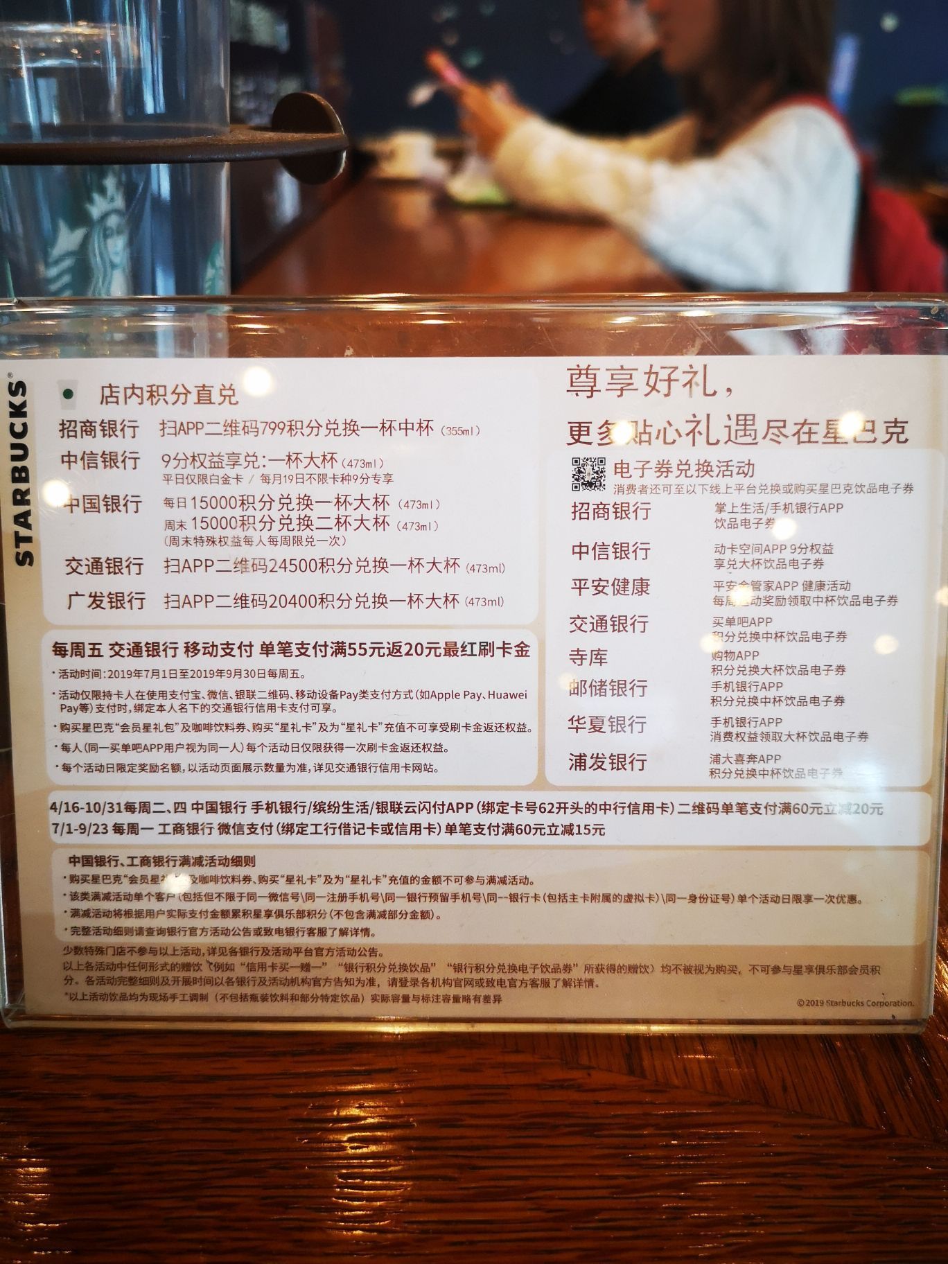 又来光顾星巴克了,也是因为有活动,反正我现在就几乎没有原价喝过星巴克了。他家经常搞这样那样的活动,比如和银联银行卡活动满60减20什么的。这次才看清星巴克和这么多家银行都有积分活动,照了一张,之后用信用卡积分什么的换换喝好了。
