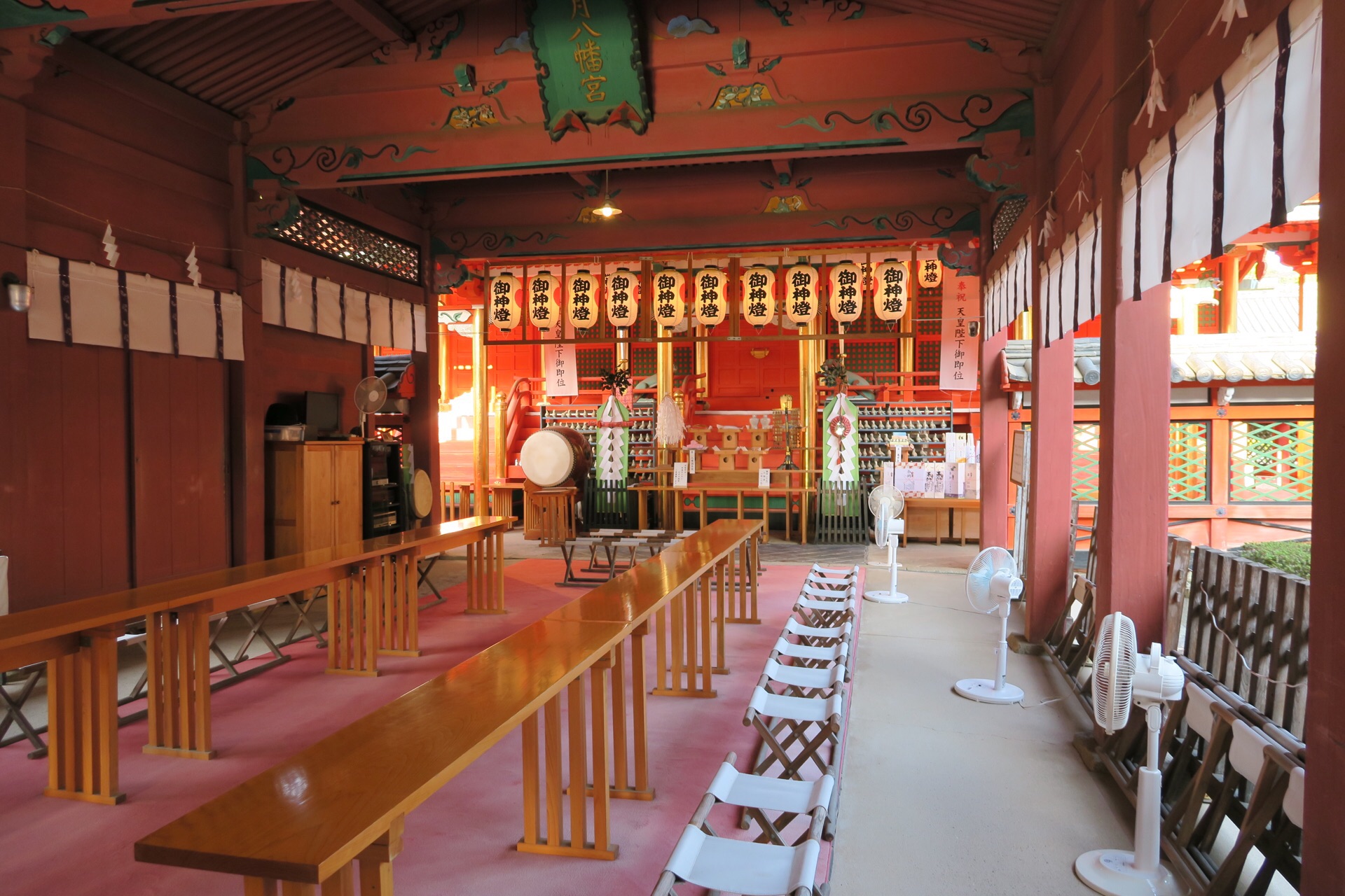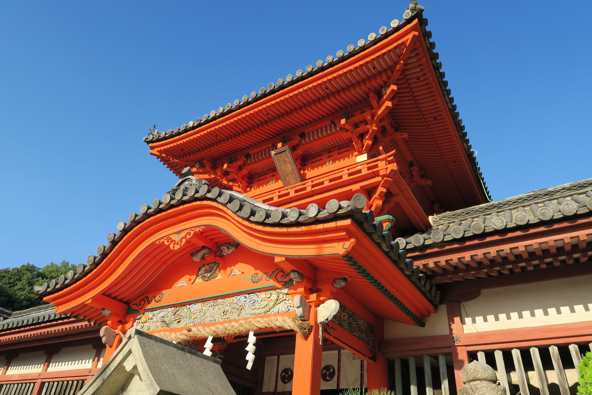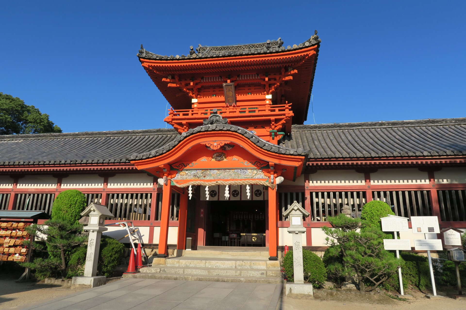 长长的一串台阶上面的一点红,就是伊佐尔波神社。135阶的石梯爬到尽头还是有一些小喘,抬头一看,完全被这鲜艳朱红的建筑物给惊艳到了,天太蓝,而寺庙太艳,完美的色彩搭配。穿过豪华绚烂的门楼,里面是贴着金箔的支柱和有雕刻装饰的门梁。寺庙的规模虽然不大,但是却极为美丽