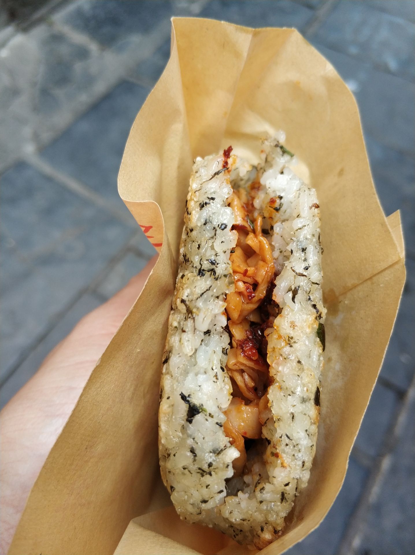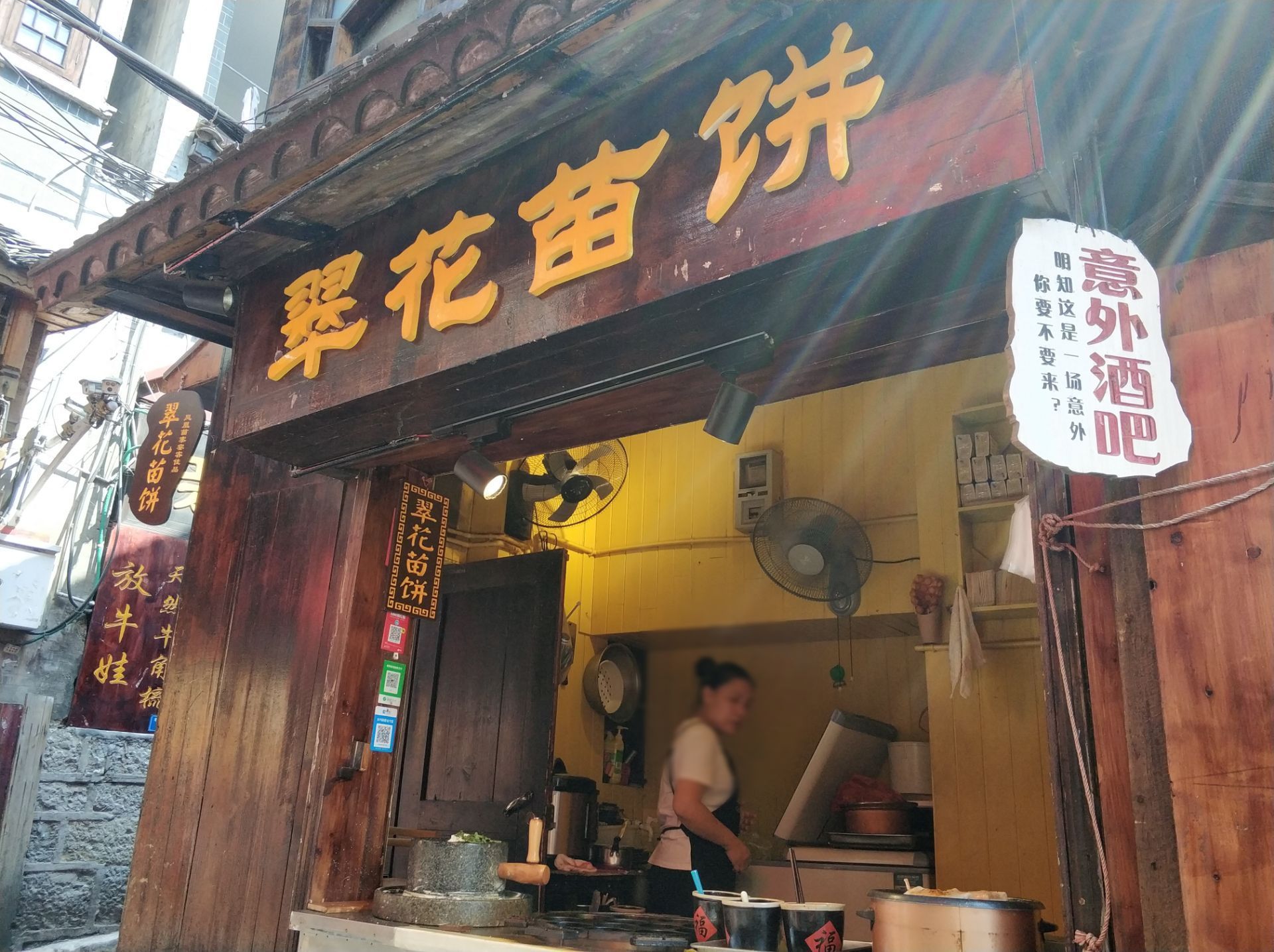 没去凤凰之前看到过一篇攻略上推荐翠花苗饼。苗饼?没听过,好奇什么味道?就一直留意着。到凤凰古城入住后闲着没事,特意找过去尝一下。 街边的一家小店,只能外带。 苗饼应该就是两面煎过的糯米饭做的饼,内里夹上一些腌萝卜之类的。味道还不错,就是10块一个的价格,不是很实惠。