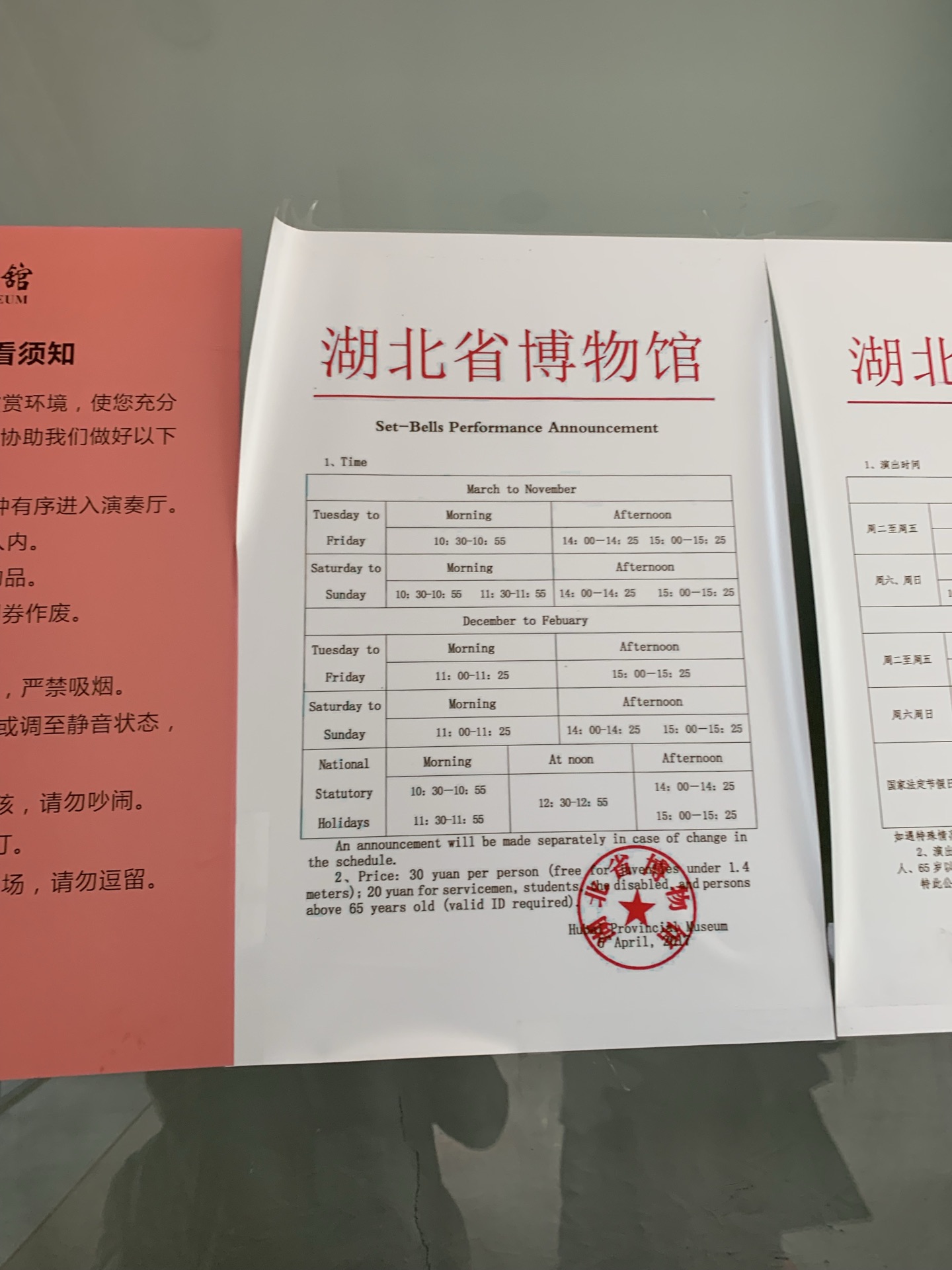 最近来了几次湖北省博物馆。上次和朋友来时,由于仓促未看到编钟演出。于是这次来一个重要事项就是看编钟演出。地点在博物馆旁边的附楼。于是提前先来买了票。这个演出叫“千古绝响——曾侯乙编钟演奏会”。现在(周二到周五)是每天三场,时间分别是10:30、14:00、15:00。表演时长是25分钟。是古装的演奏。除了编钟外,还有古筝、钟磬等等,前面演奏的都是古曲,最后一首竟然是《欢乐颂》,挺有意思的。