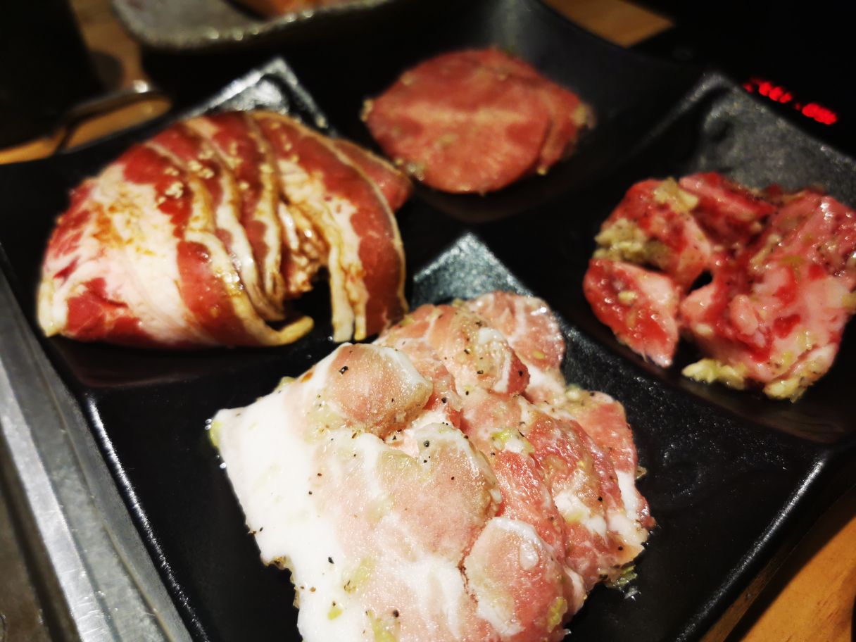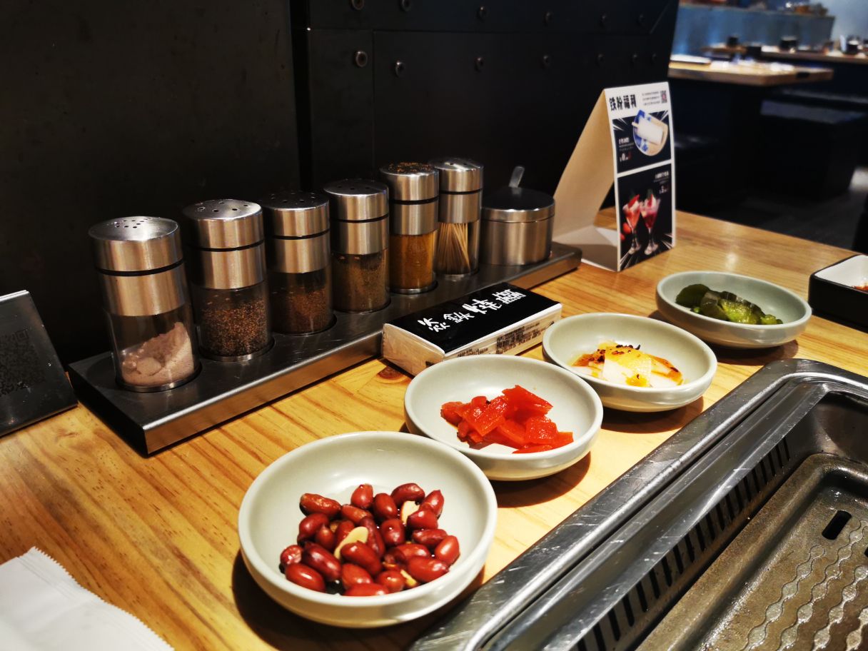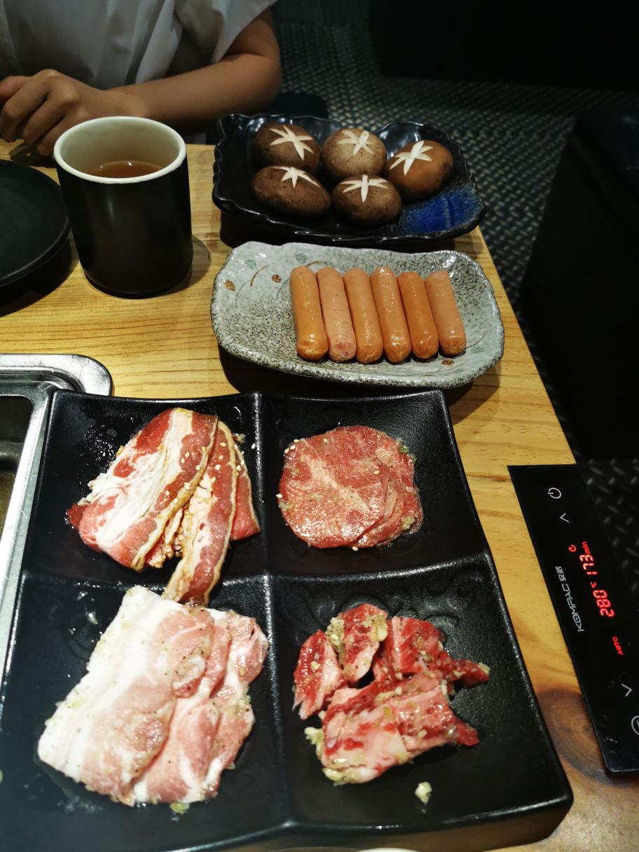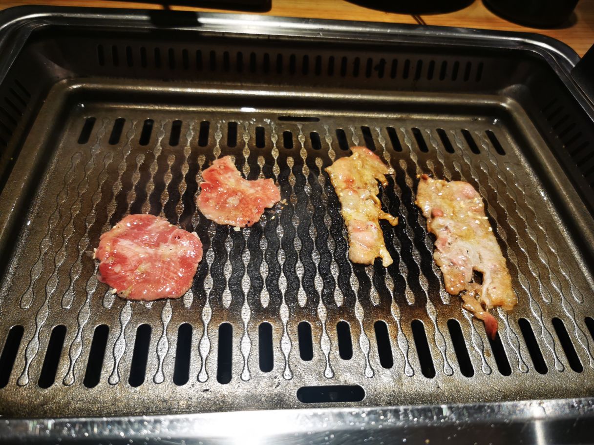 和朋友万象看完电影,找个地点边吃边聊,焱铁烧是个不错的地方,边烤边聊,喝喝饮料。听着肉肉在铁板上滋滋的美妙声音很是开胃。 牛肉粒,牛舌,培根,五花肉,香肠,都不需要酱料,原滋原味的好肉就很足够了。搭配生菜解腻。生菜还用红椒捆起来好看的。烤完肉,还有一份招牌炖肉份量真的超级足,两人份吃得饱饱的。