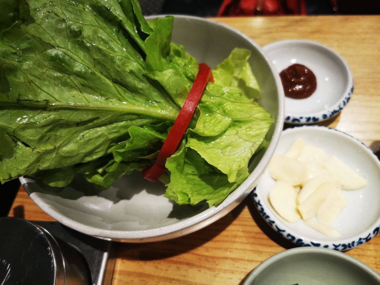 烤完肉,还有一份招牌炖肉份量真的超级足,两人份吃得饱饱的。生菜还用红椒捆起来好看的。搭配生菜解腻