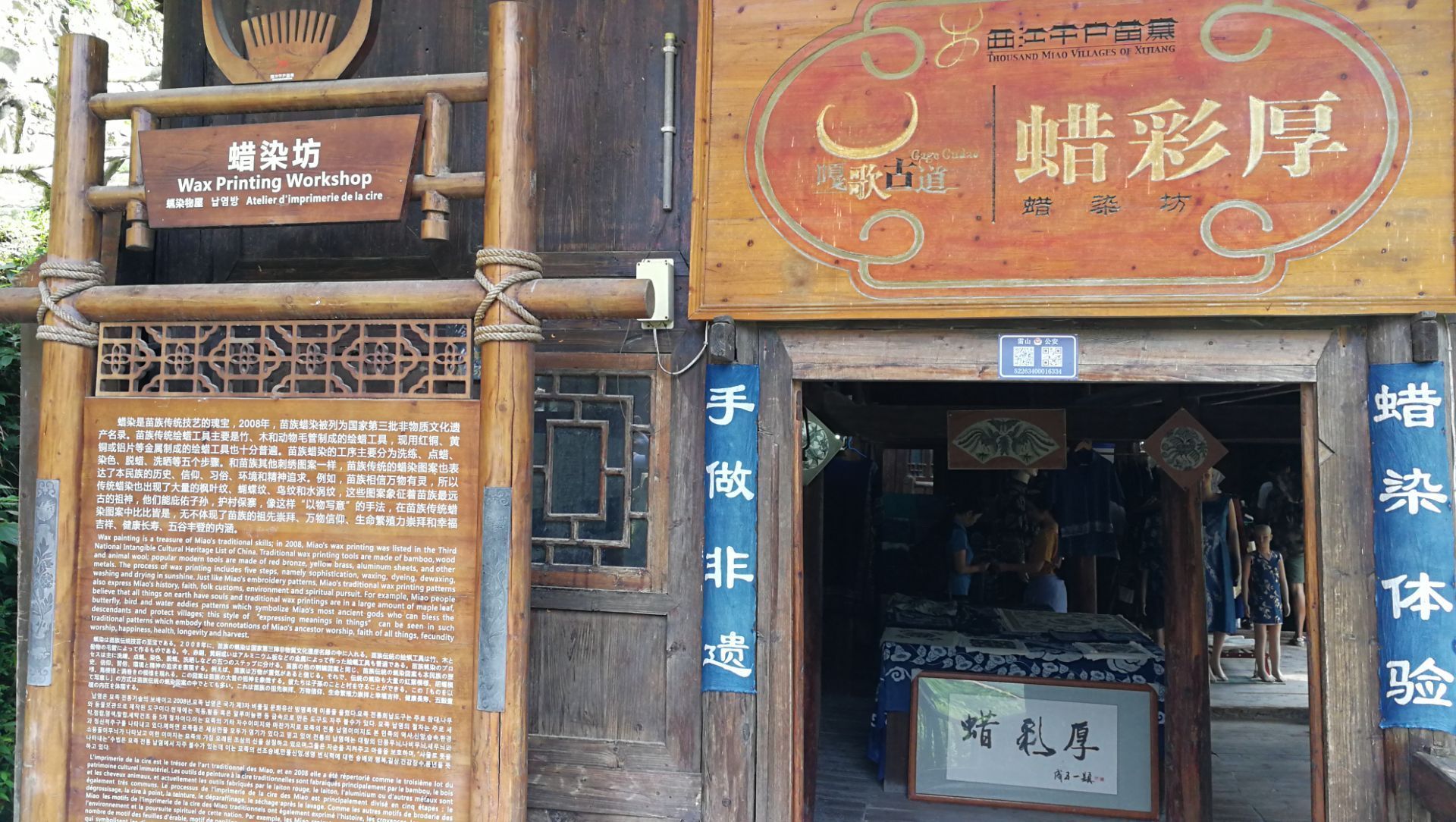 西江苗寨在也东寨有专门供参观的蜡染坊,蜡染在2006年被国家列为首批非物质文化遗产保护目录,图...西江苗寨在也东寨有专门供参观的蜡染坊,蜡染在2006年被国家列为首批非物质文化遗产保护目录,图案的素材源于生活,工匠随心所欲的创作,线条活泼流畅,造型生动。