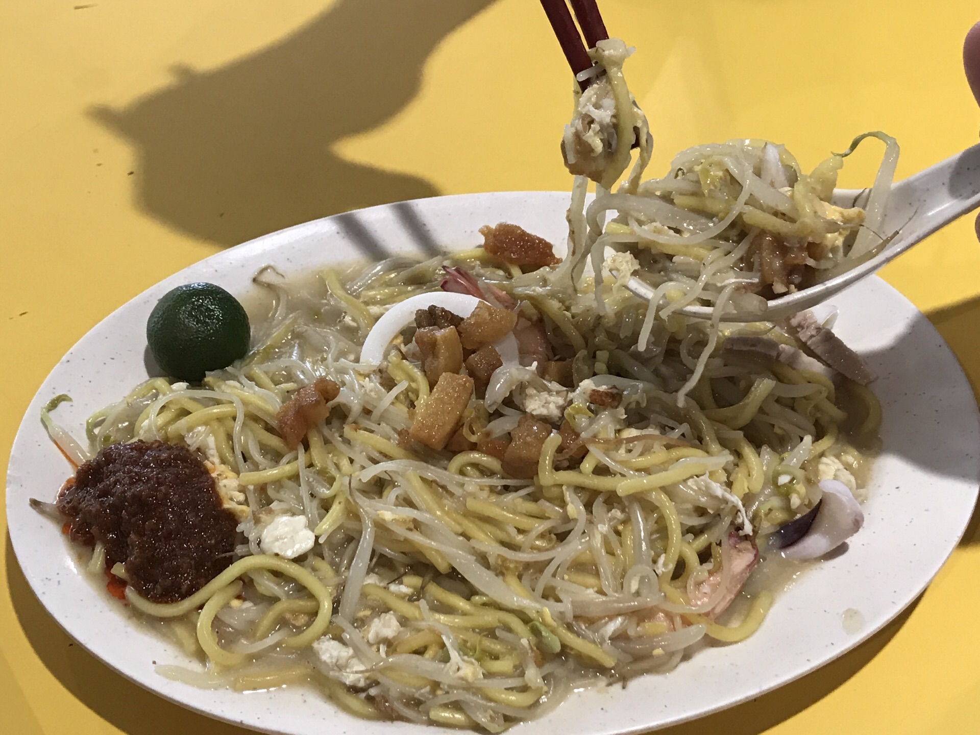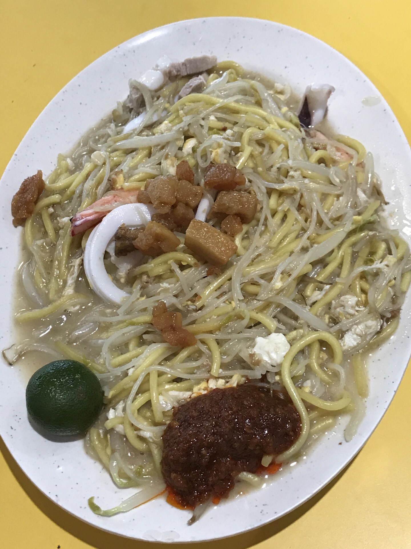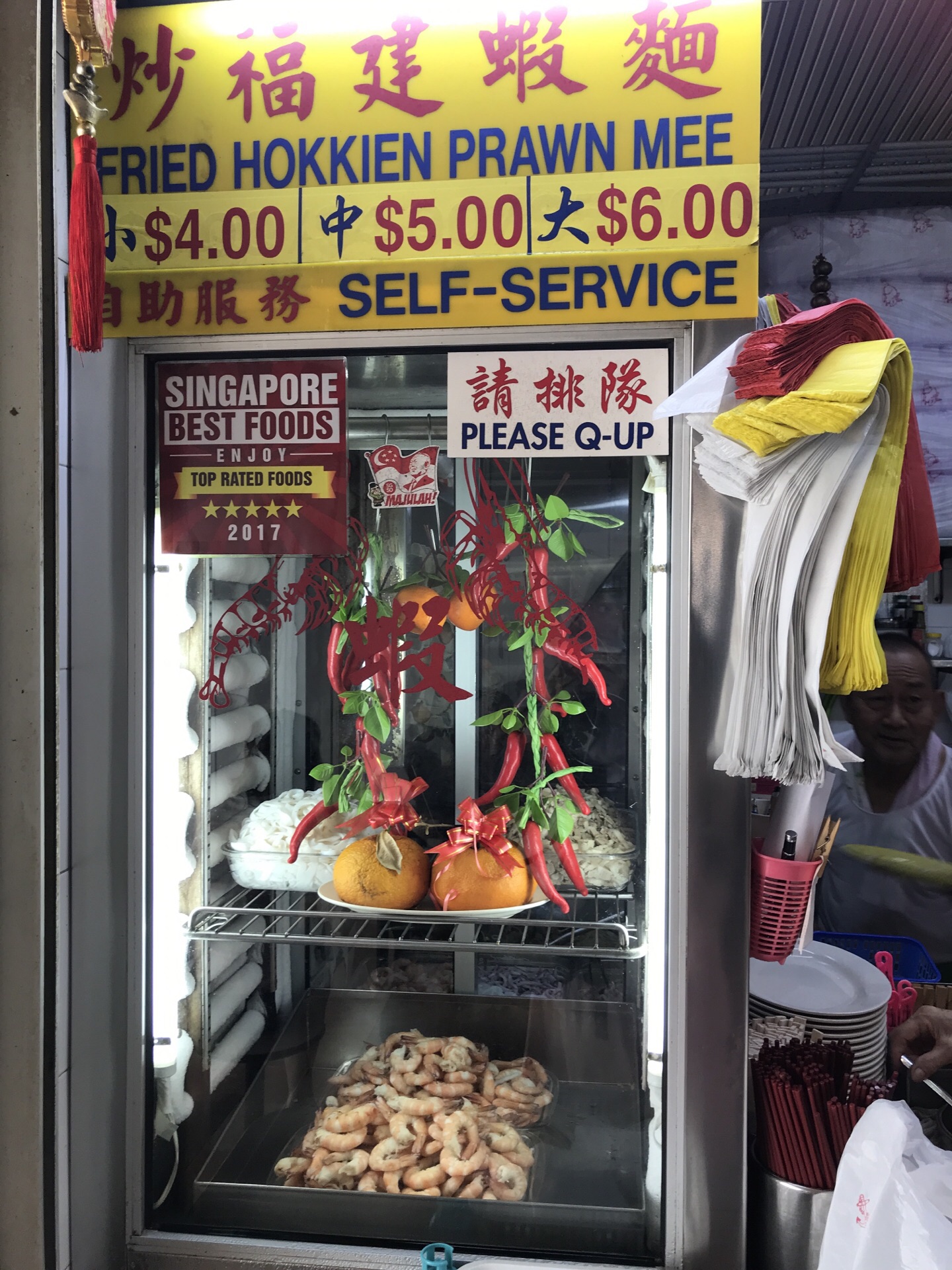 新加坡独有的狮城美食,炒福建虾面。来新加坡一定要尝一尝。 已经75岁的老板和他的太太经营的炒福建虾面摊。老板早上四点钟就起身准备食物,他已经做了半个世纪,年纪越来越大,随时会退休。 这是高汤焖煮的黄面条和粗米粉,再加入焯熟的三层肉,新鲜的虾和鱿鱼。炒好的面条一点都不干,加上一勺猪油渣,有我小时候吃的那股古早味。价格非常合理, 小盘的S$4。