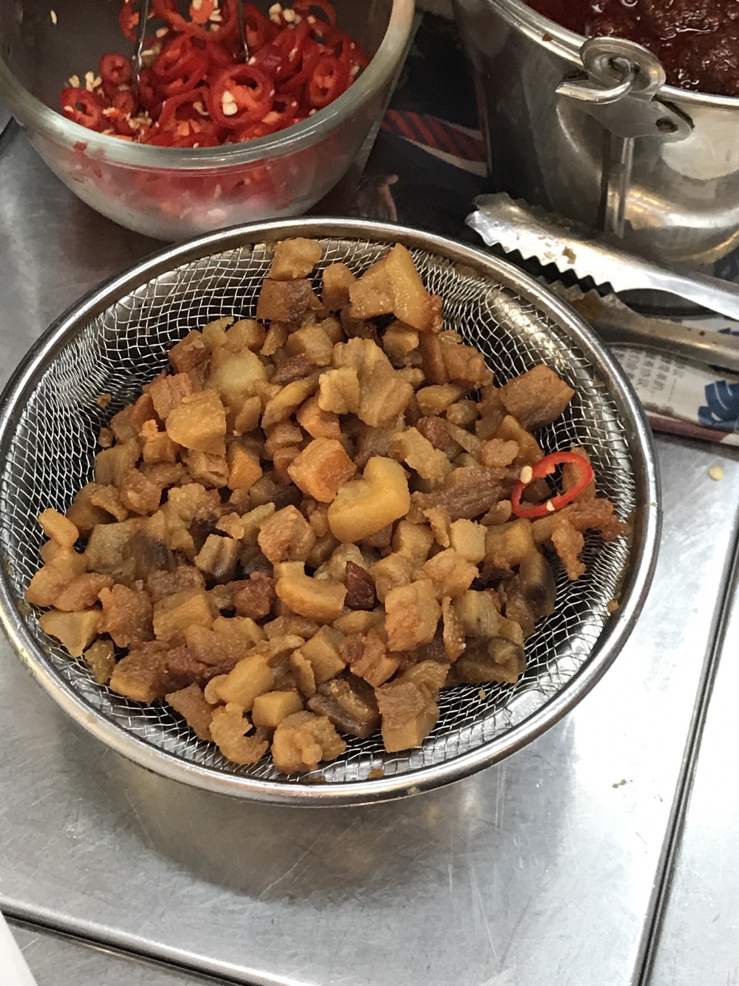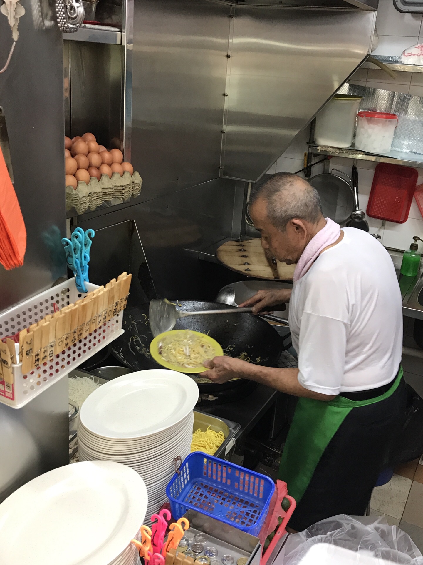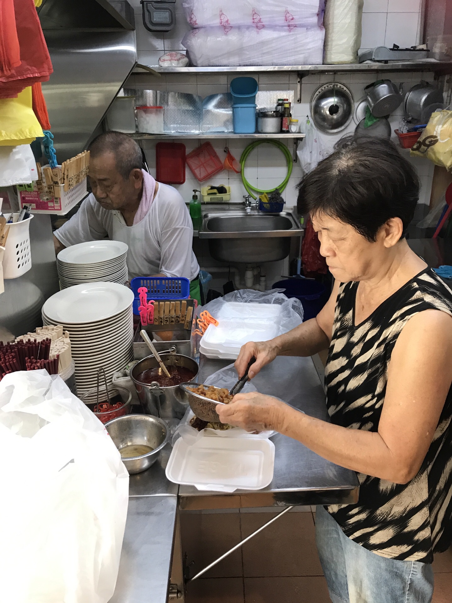新加坡独有的狮城美食,炒福建虾面。来新加坡一定要尝一尝。 已经75岁的老板和他的太太经营的炒福建虾面摊。老板早上四点钟就起身准备食物,他已经做了半个世纪,年纪越来越大,随时会退休。 这是高汤焖煮的黄面条和粗米粉,再加入焯熟的三层肉,新鲜的虾和鱿鱼。炒好的面条一点都不干,加上一勺猪油渣,有我小时候吃的那股古早味。价格非常合理, 小盘的S$4。