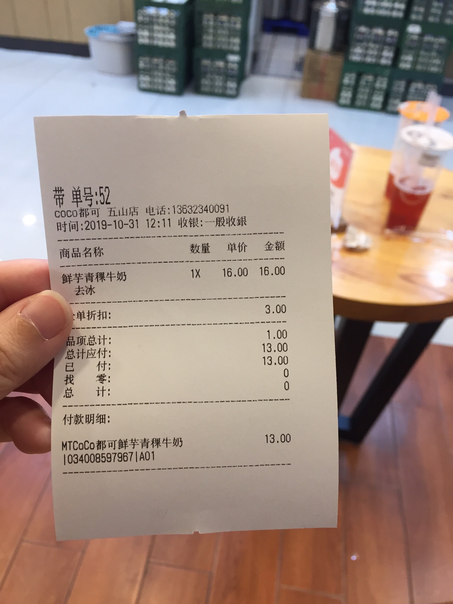 ︗ COCO都可(五山店) ︘ ✨吃貨約飯探店的日常,愛點評,愛生活✨ ♫|地點| 位於廣州地鐵3號線五山地铁站b出口的五山广场路边 ♫|環境| / |服務| 店面支持扫码自助下单,等候区位置还是挺多的。不过如果能及时收拾一下桌面的空饮料瓶子就更好啦 「鲜芋青稞醇牛奶」秋天来啦,特意团购了个热饮。到店验证的时候发现原来还能做冷的,开启新认知。中杯用了团购积分,8元成交。