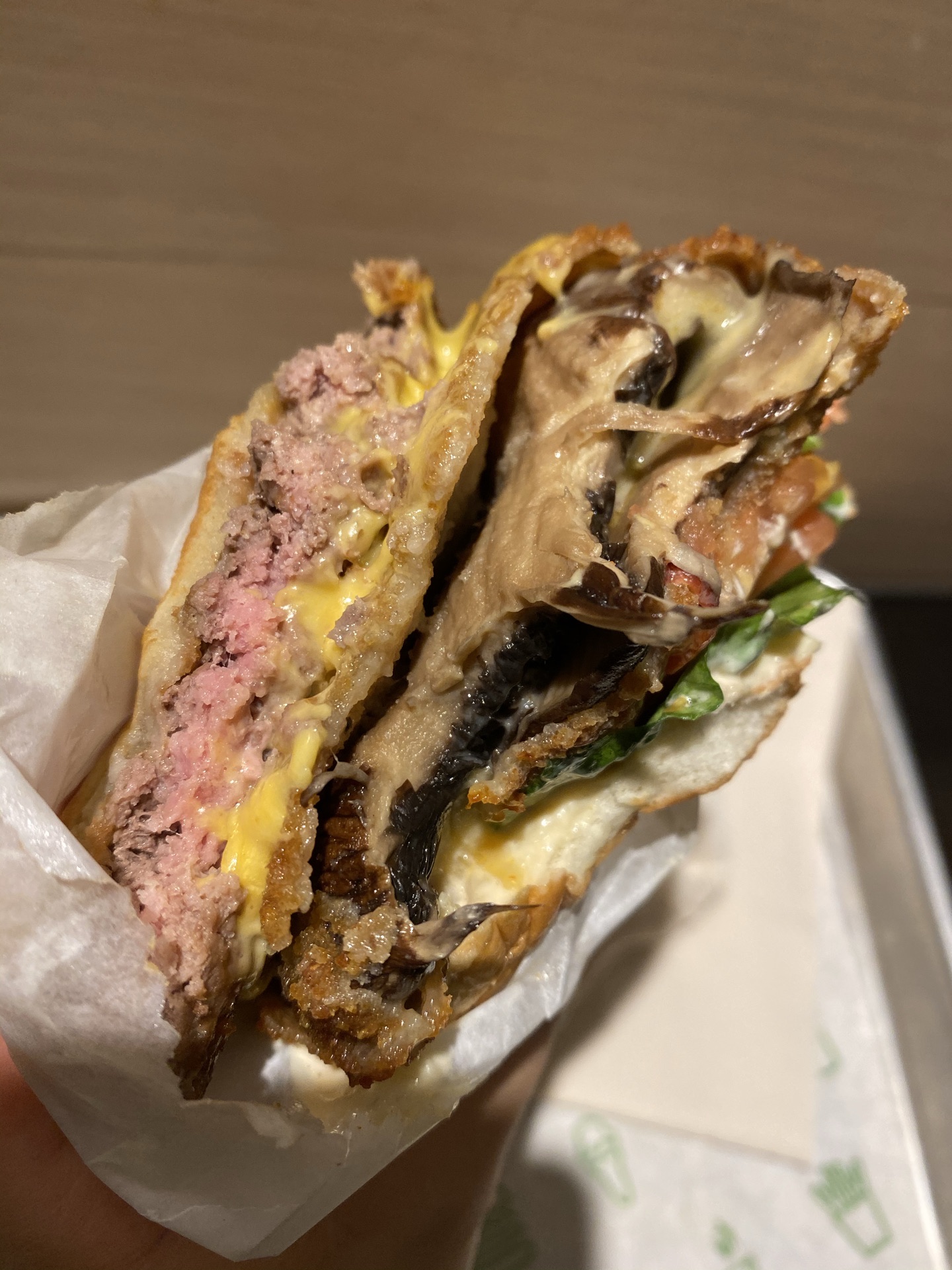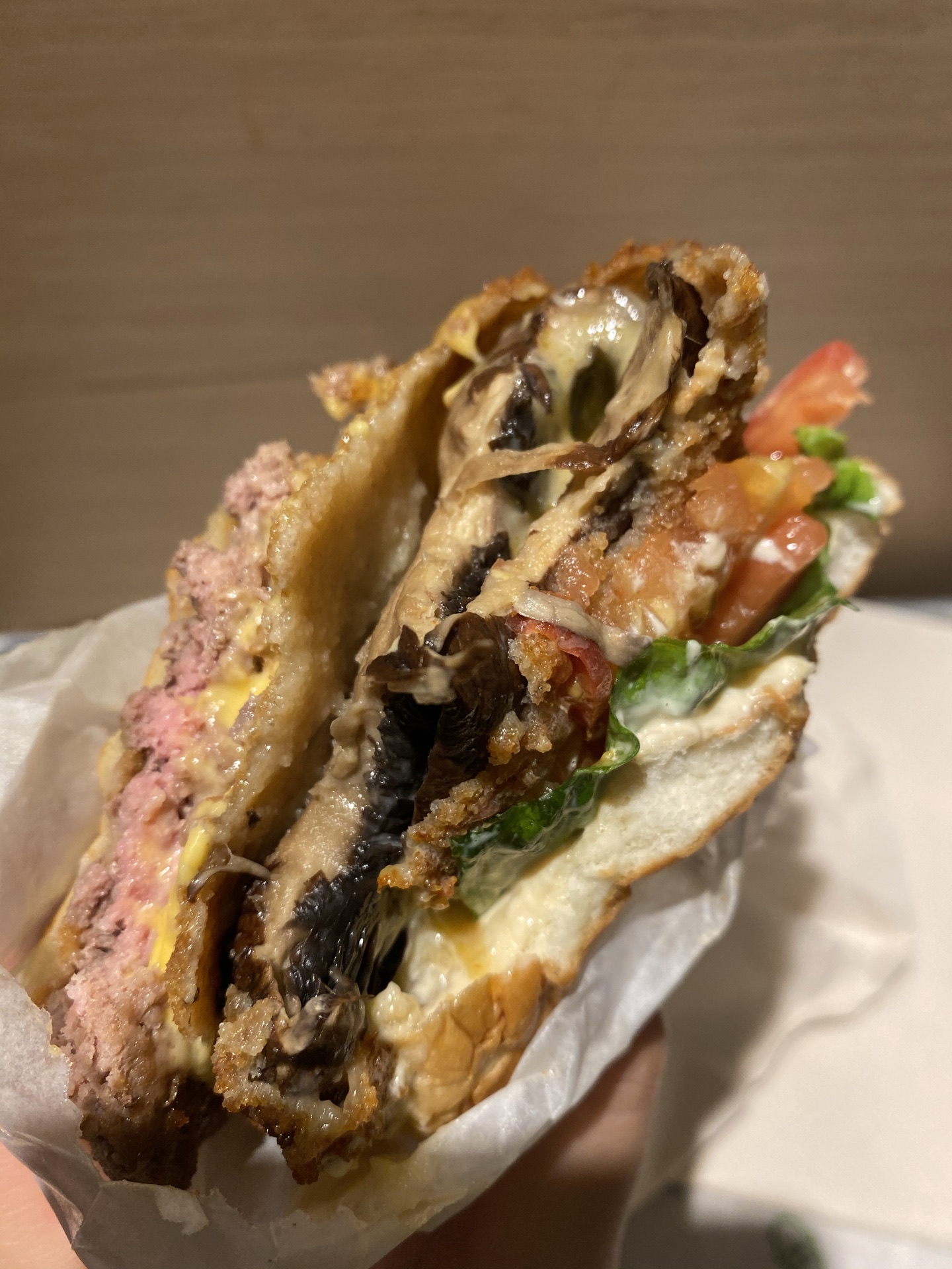 最便宜的单层45块钱一个,一个吃下去感觉还不够环保,但是味道真的很不错,牛肉饼鲜嫩多汁,大概是...美国来的汉堡包品牌,最出名的就是牛肉汉堡了,有单层和双层的,最便宜的单层45块钱一个,一个吃下去感觉还不够环保,但是味道真的很不错,牛肉饼鲜嫩多汁,大概是五分熟的样子。