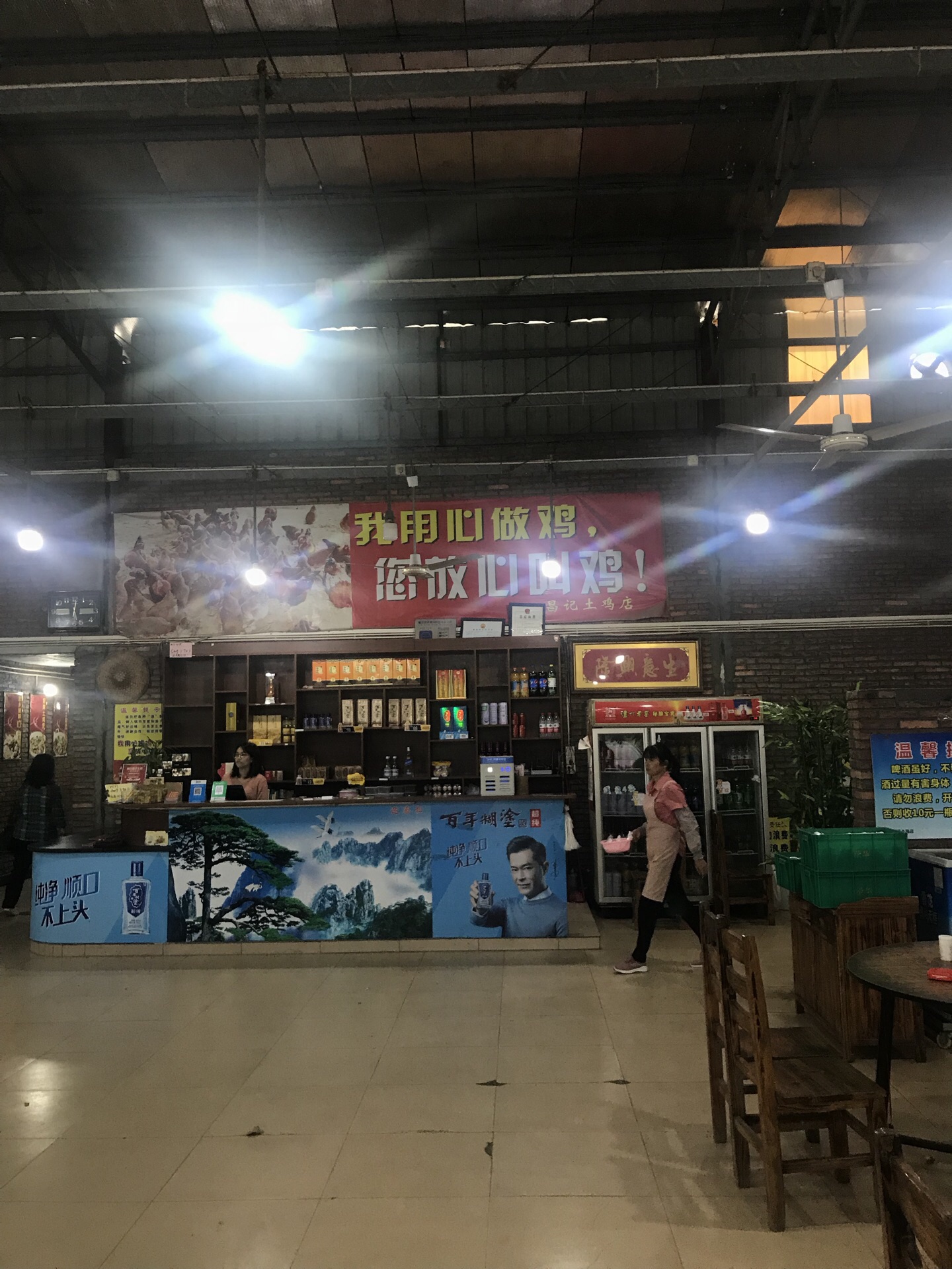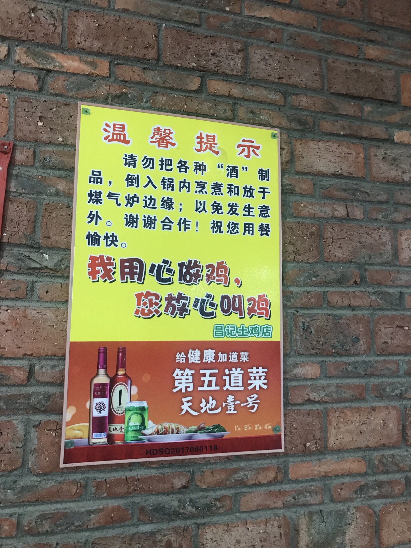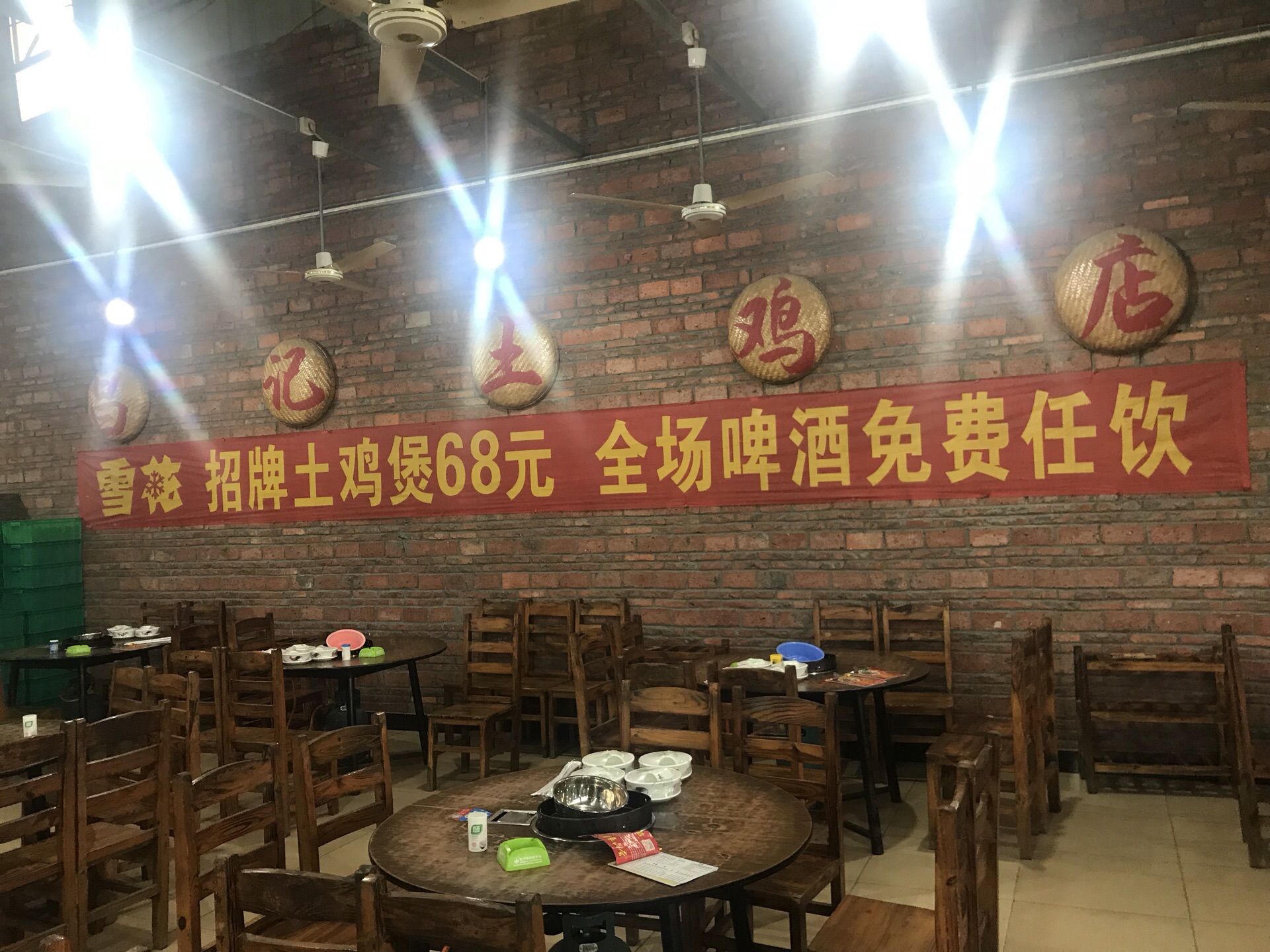 从白云国际机场出来,已到晚饭的时间。想起朋友推荐过花都的这家昌记土鸡店,于是驱车前往。 这是一家大排档,装修简陋。主打土鸡、鹅、鱼头、小炒等。这里是米饭和啤酒免费任吃任喝。 【招牌土鸡煲】上来一大煲,鸡肉结实,鸡味浓郁,非常嫩滑入味。汤汁下饭正好,淋在饭上,一大碗饭一下子一扫而空。 【秘制鹅红汤】里面的鹅血很多,非常新鲜。 茶位费要3元一位,餐具费1元,有点小贵。买单118元,人均消费约40元