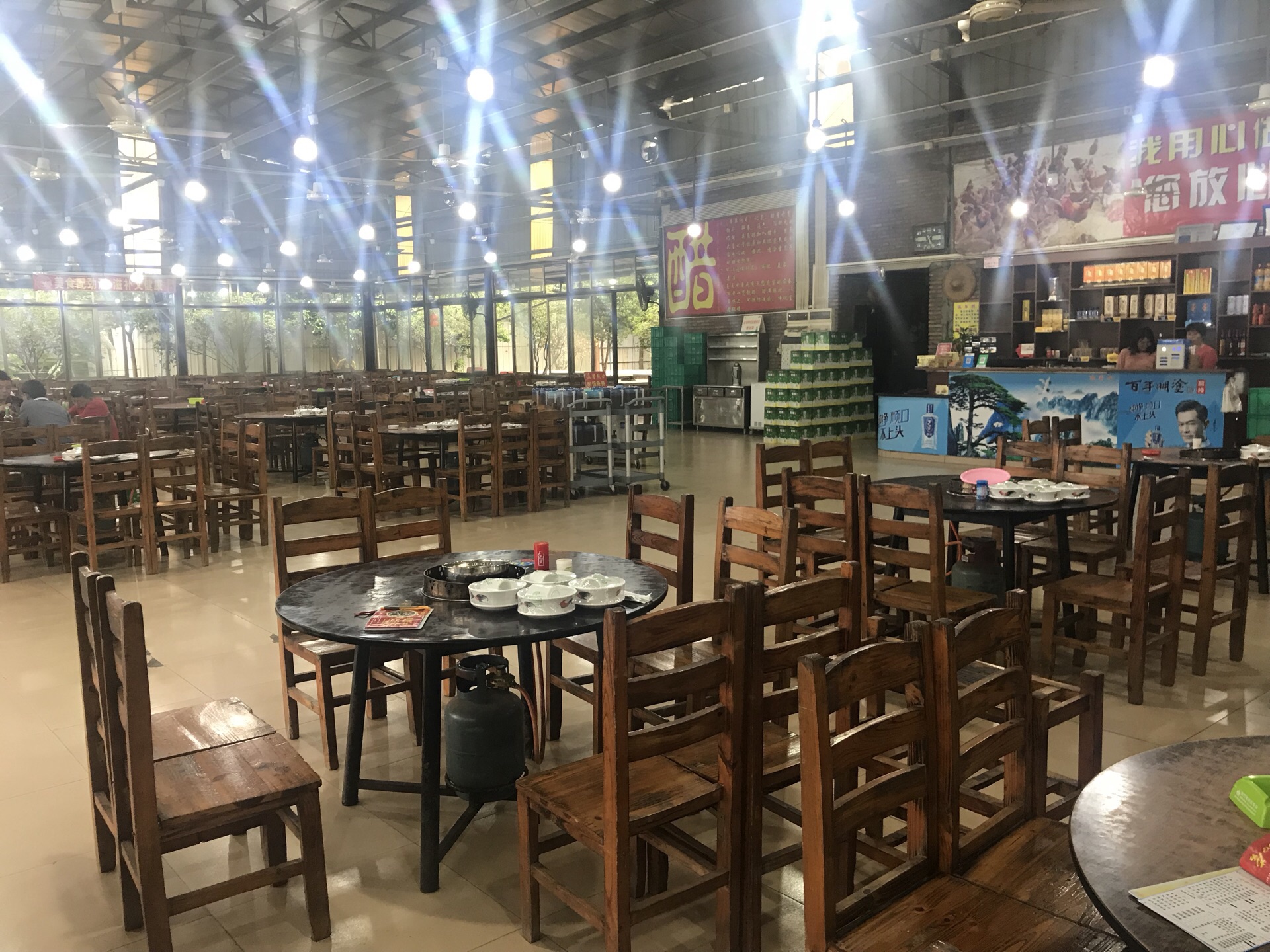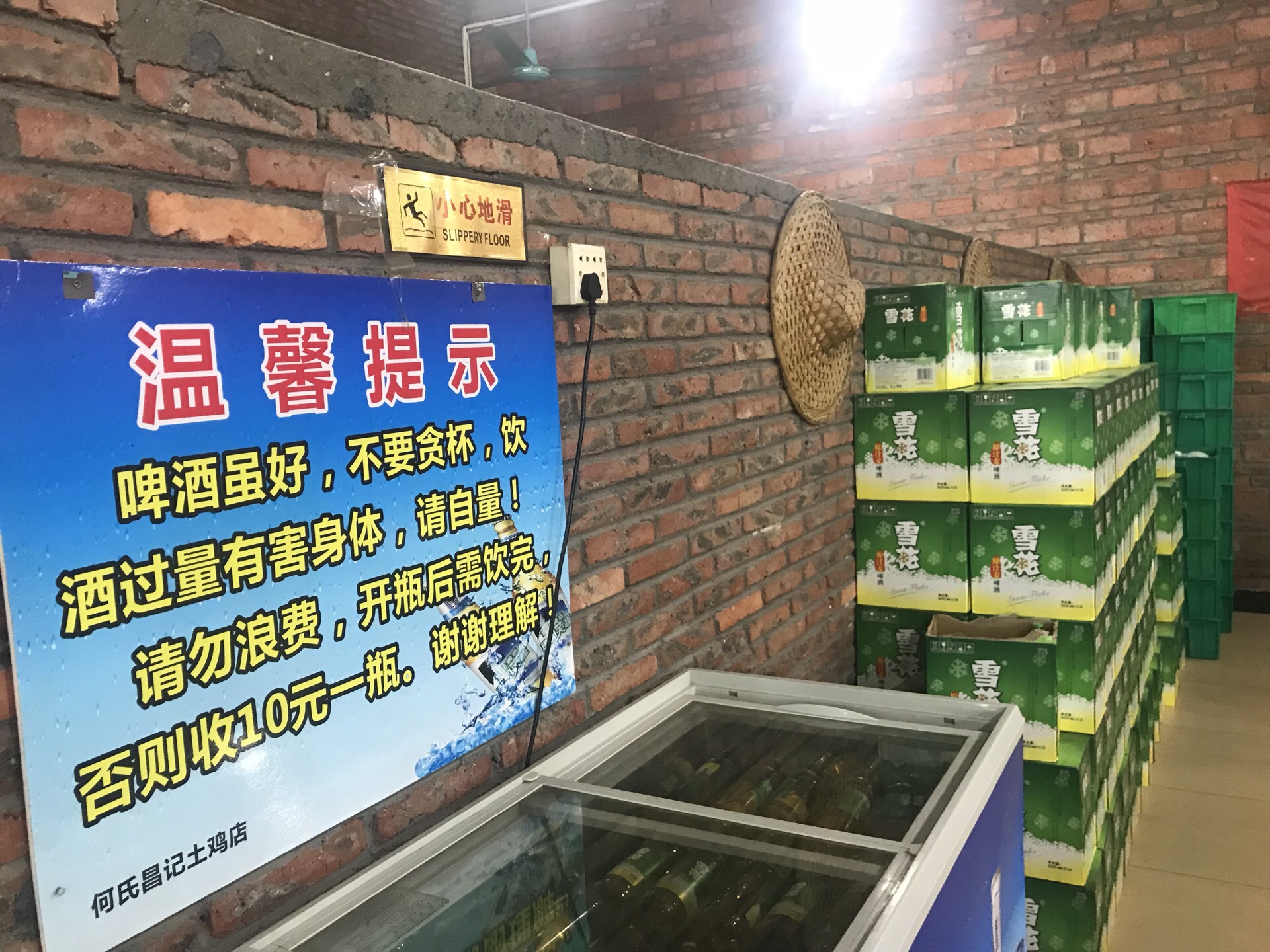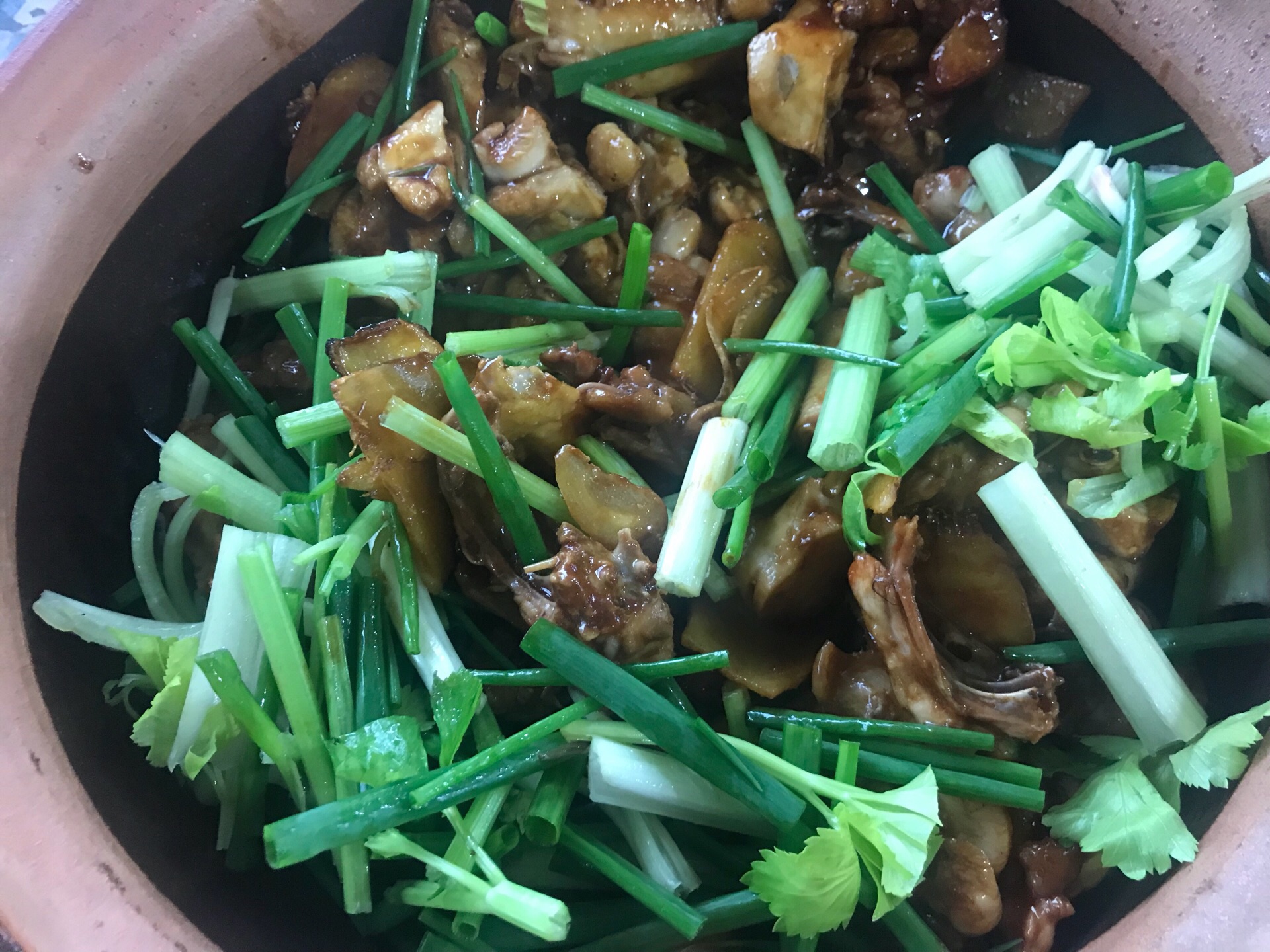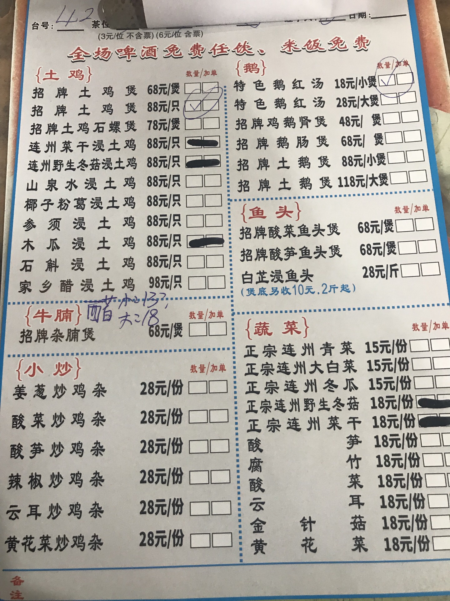 从白云国际机场出来,已到晚饭的时间。想起朋友推荐过花都的这家昌记土鸡店,于是驱车前往。 这是一家大排档,装修简陋。主打土鸡、鹅、鱼头、小炒等。这里是米饭和啤酒免费任吃任喝。 【招牌土鸡煲】上来一大煲,鸡肉结实,鸡味浓郁,非常嫩滑入味。汤汁下饭正好,淋在饭上,一大碗饭一下子一扫而空。 【秘制鹅红汤】里面的鹅血很多,非常新鲜。 茶位费要3元一位,餐具费1元,有点小贵。买单118元,人均消费约40元